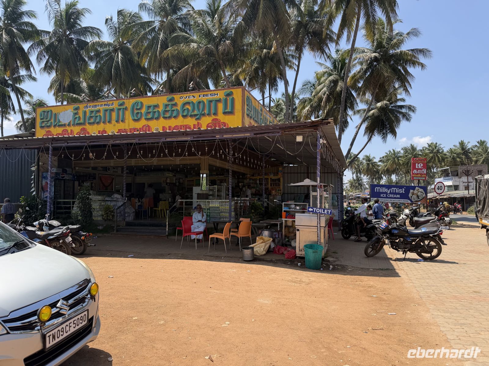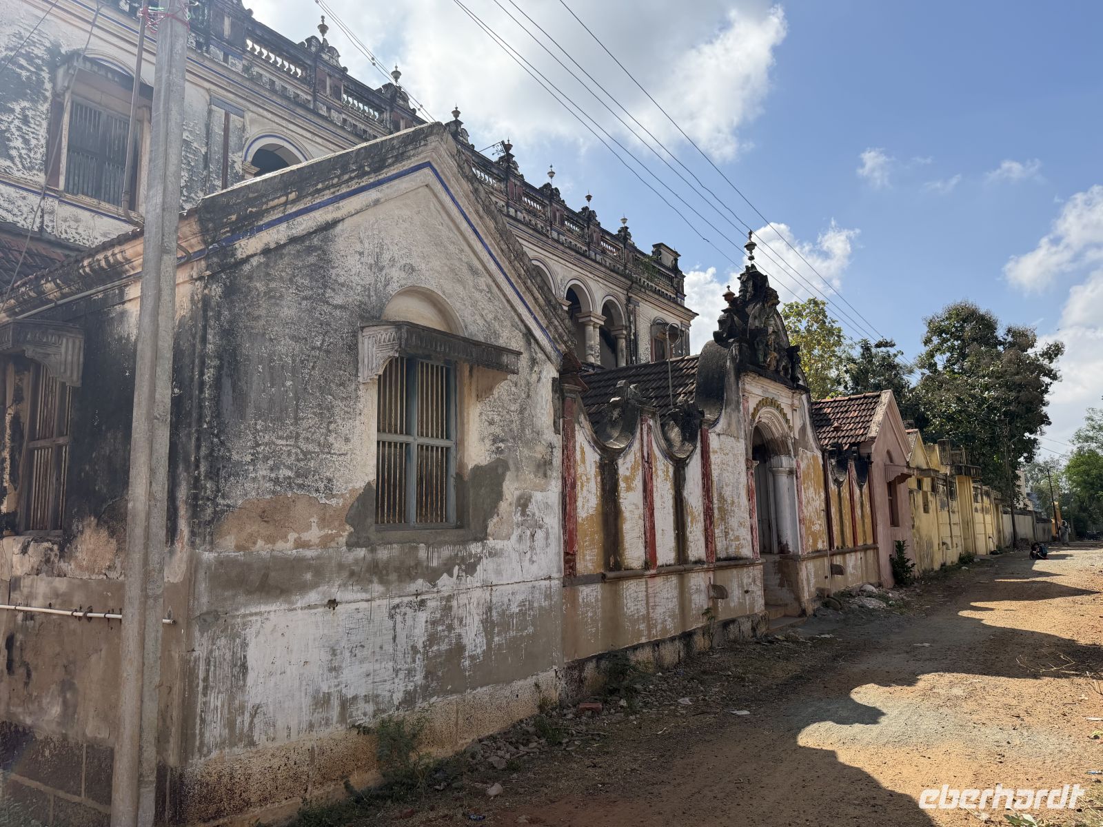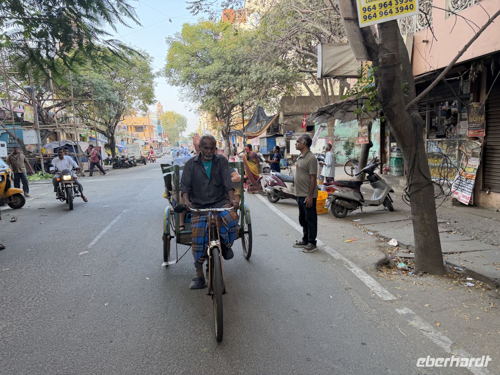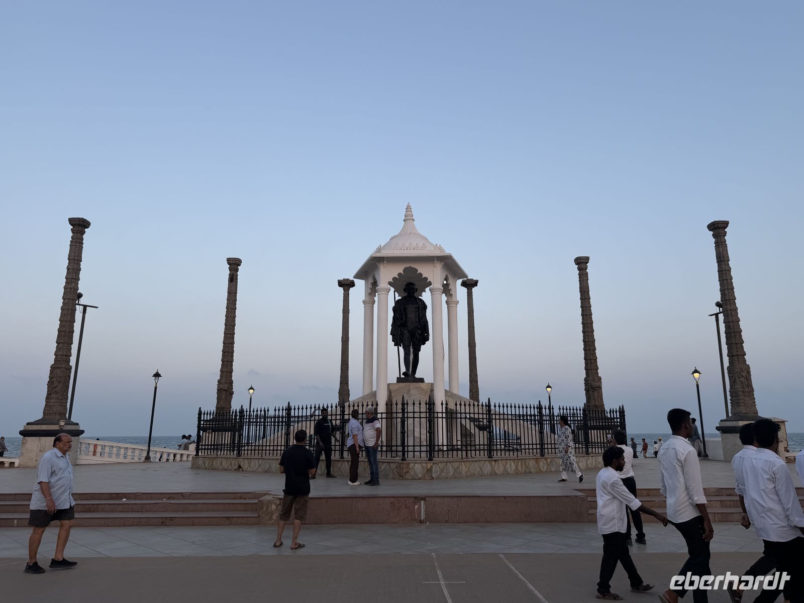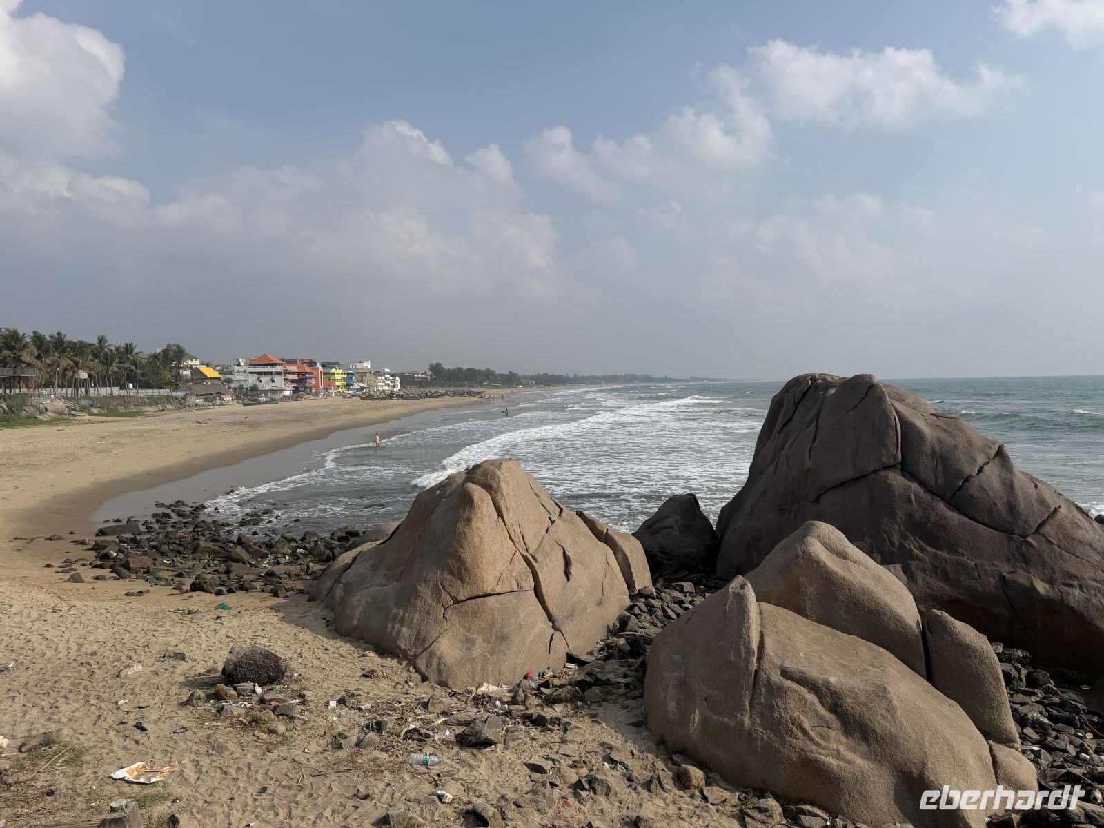 Es ist bereits Nachmittag, als wir Pondicherry erreichen. Wir machen einen Sparziergang durch die ehemalige französische Kolonialstadt an der Koromandelküste. Hier verbindet sich europäische Kolonialarchitektur mit tamilischer Kultur. Puducherry, wie es heute heißt, ist die Hauptstadt des Unionsterritoriums. Die charmante Altstadt mit vielen Bäumen und Kopfsteinpflaster beheimatet das Grab des Yogis Sri Aurobindo. Welches wir still besuchen. Der letzte Programmpunkt für heute ist die Rikscha Fahrt durch das französiche, hinduistische und muslemische Viertel. Die Fahrer müssen kräftig in die Kette treten, was mir ein schlechtes Gewissen einbringt. Als wir die Gandhi Statur an der verkehrsfreien Uferpromenade erblicken, machen wir eine Fotopause. Nach einer Stunde sind wir wieder am Hotel. Der Abend verläuft ruhig mit gesponsorten Getränken vom Geburtstagskind und leckeren Geburtstagskuchen, den Bhawani zum Abendessen vorbeibringt. Der Abend klingt schön aus.