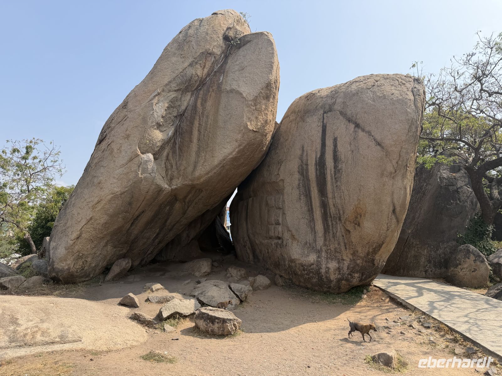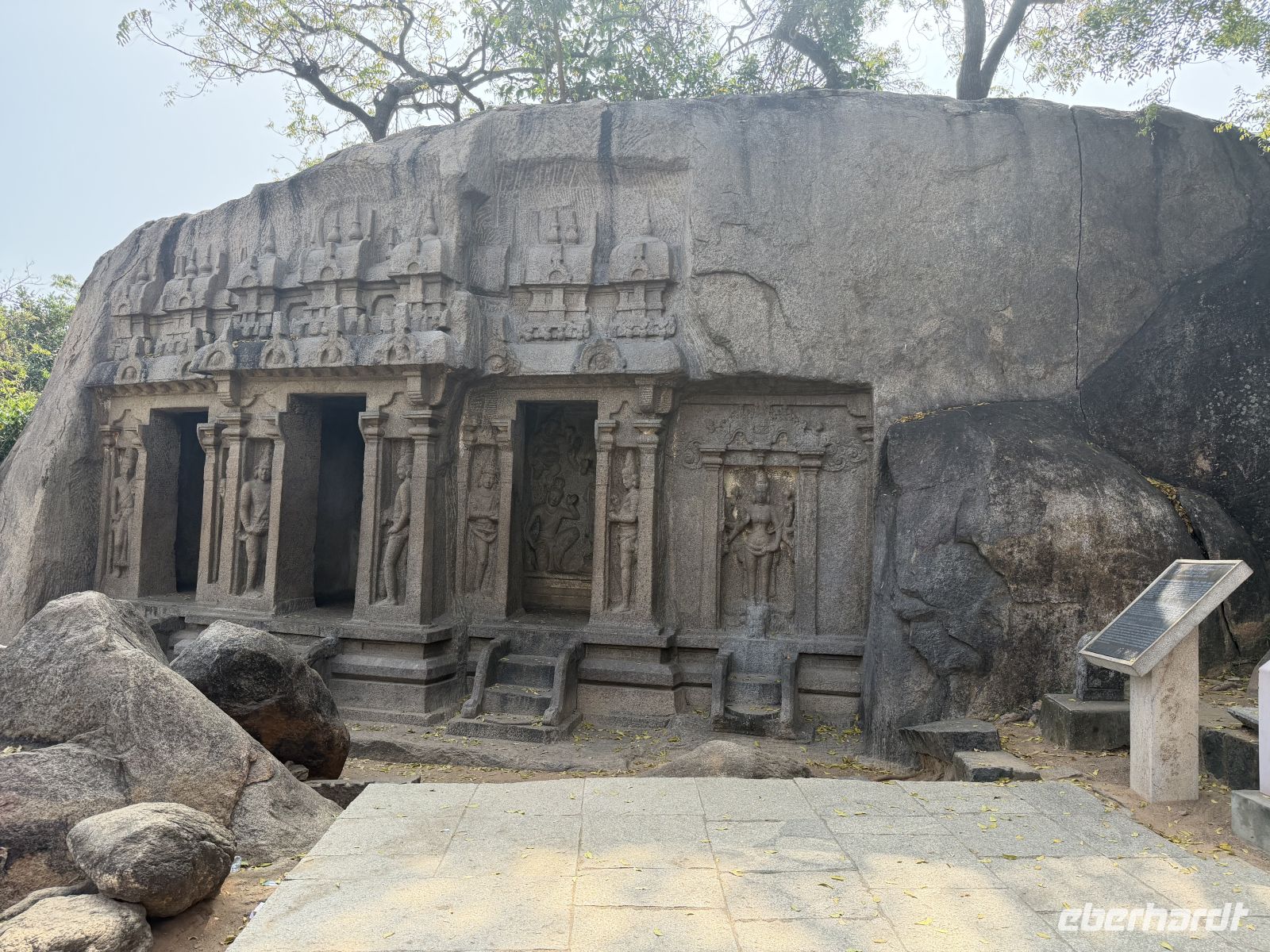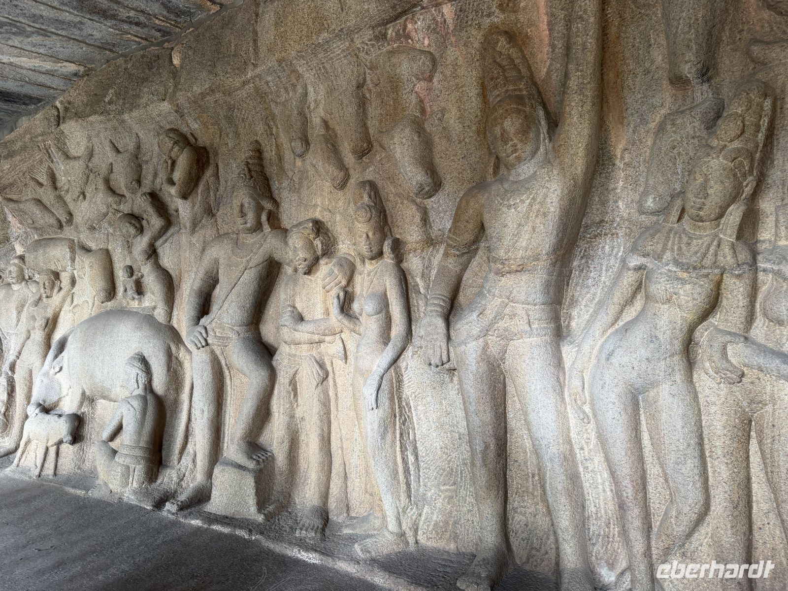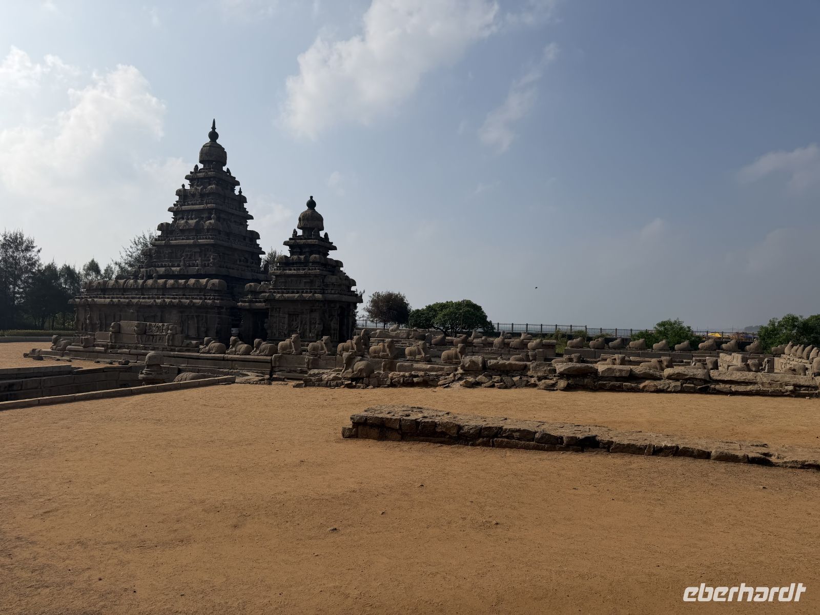 Der heutige Tag ist ein Feiertag. Wir betreten den Bus und der Tag beginnt mit einem Geburtstagsliedchen für unseren Ehrengast. Luftschlangen fliegen durch den Bus und Glückwünsche werden ausgesprochen. Wir verlassen Muthukadu und fahren Richtung Süden nach Mahabalipuram. Die Besichtigung des berühmten Shore Tempels aus der Pallava Dynastie steht an. Der Tempel mit der spektakulären Lage direkt am Ufer des Golfs von Bengalen wirkt wie ein steinernes Schiff mit einer Reihe aus Nandis, dass seit 1300 Jahren den Wellen trotzt. Das UNESCO Weltkulturerbe mit drei Schreinen, zwei für Shiva, einer für Vishnu diente nicht nur als Heiligtum, sondern auch als Navigationspunkt für Seefahrer. Die aus Granitblöcken gehauenen pyramidenförmigen Türme sind ein Teil der versunkenen sieben Pagoden. Wind und Wetter legen immer wieder versunkene Teile frei. Der Weg führt uns vorbei an Essensständen zur Zisterne. Das Wasser schimmert grün-türkis. Bhawani erkälte uns die Nutzung des Wassers bei den verschiedenen Festlichkeiten. Die nächste Station des Tages sind die Felsenheiligtümer mit mythologischen Szenen in Mahabali. Es gibt 14 solcher Höhlentempel in dem Gebiet. Der Tempel zeigt ein Relief mit Krishna, der den Govardhana Berg hebt, um die Dorfbewohner zu schützen mit vielen bäuerlichen Bildern. Beeindruckend ist das 14m hohe und 30 m lange Relief mit dem Titel Arjunas Buße (Herabkunft des Ganges) um eine natürliche Felsenspalte sind Szenen aus der Zusammenkunft von Göttern, Menschen und Tieren, darunter 2 riesige Elefanten in Stein gemeißelt. Es gibt mehrere Geschichtsinterpretationen zu dem Relief. Entlang dem Felsenhang laufen wir auf einen ruhenden Felsklotz zu. Krishnas Butterkugel- scheinbar schwerelos balanciert der Granitfelsen seit über 1200 Jahren unverändert auf dem Bergrücken. 250 Tonnen soll er wiegen und hat eine Höhe von 6 m. Kinder und Erwachsene posieren mit dem Block und rutschen die Rinne am Hang herunter. Der tamilische Name verweist auf die göttliche Herkunft. Krishna soll als Kind Butter gestohlen haben und dabei einen Klecks fallen gelassen haben - der heutige Felsen. Wir erkunden nun mit ein weinig Freizeit auf eigene Faust die Umgebung bis es heißte, nächster Programmpunkt ruft…