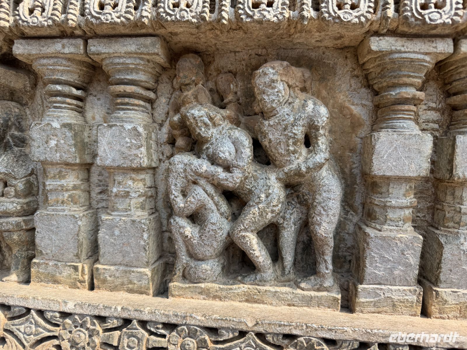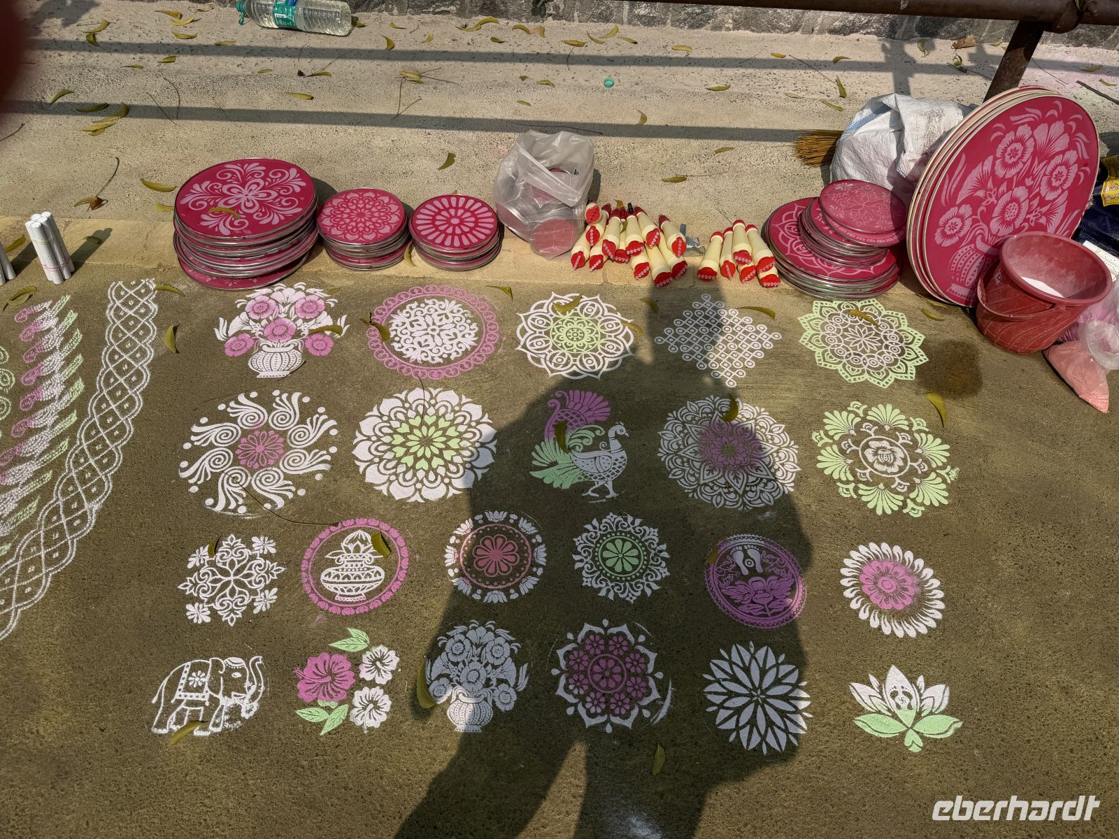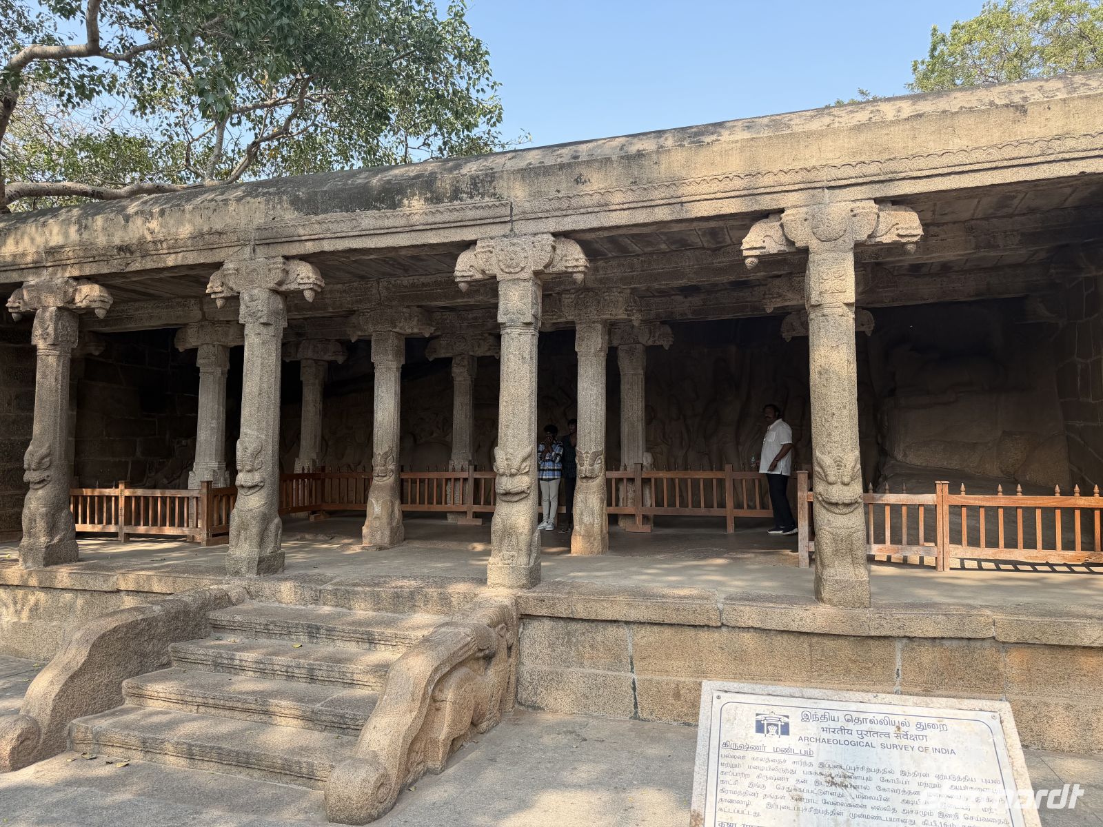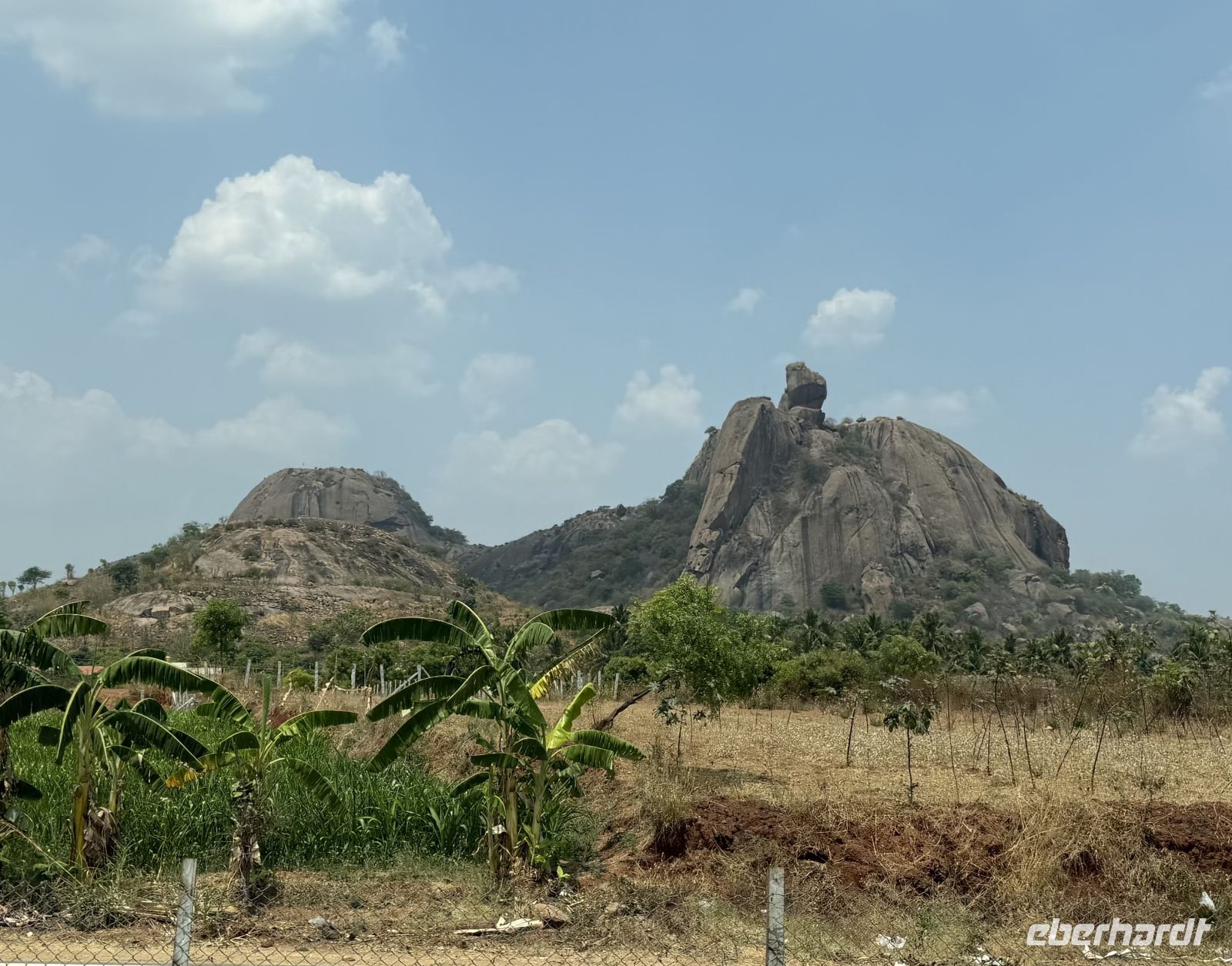 Der heutige Tag ist ein Feiertag. Wir betreten den Bus und der Tag beginnt mit einem Geburtstagsliedchen für unseren Ehrengast. Luftschlangen fliegen durch den Bus und Glückwünsche werden ausgesprochen. Wir verlassen Muthukadu und fahren Richtung Süden nach Mahabalipuram. Die Besichtigung des berühmten Shore Tempels aus der Pallava Dynastie steht an. Der Tempel mit der spektakulären Lage direkt am Ufer des Golfs von Bengalen wirkt wie ein steinernes Schiff mit einer Reihe aus Nandis, dass seit 1300 Jahren den Wellen trotzt. Das UNESCO Weltkulturerbe mit drei Schreinen, zwei für Shiva, einer für Vishnu diente nicht nur als Heiligtum, sondern auch als Navigationspunkt für Seefahrer. Die aus Granitblöcken gehauenen pyramidenförmigen Türme sind ein Teil der versunkenen sieben Pagoden. Wind und Wetter legen immer wieder versunkene Teile frei. Der Weg führt uns vorbei an Essensständen zur Zisterne. Das Wasser schimmert grün-türkis. Bhawani erkälte uns die Nutzung des Wassers bei den verschiedenen Festlichkeiten. Die nächste Station des Tages sind die Felsenheiligtümer mit mythologischen Szenen in Mahabali. Es gibt 14 solcher Höhlentempel in dem Gebiet. Der Tempel zeigt ein Relief mit Krishna, der den Govardhana Berg hebt, um die Dorfbewohner zu schützen mit vielen bäuerlichen Bildern. Beeindruckend ist das 14m hohe und 30 m lange Relief mit dem Titel Arjunas Buße (Herabkunft des Ganges) um eine natürliche Felsenspalte sind Szenen aus der Zusammenkunft von Göttern, Menschen und Tieren, darunter 2 riesige Elefanten in Stein gemeißelt. Es gibt mehrere Geschichtsinterpretationen zu dem Relief. Entlang dem Felsenhang laufen wir auf einen ruhenden Felsklotz zu. Krishnas Butterkugel- scheinbar schwerelos balanciert der Granitfelsen seit über 1200 Jahren unverändert auf dem Bergrücken. 250 Tonnen soll er wiegen und hat eine Höhe von 6 m. Kinder und Erwachsene posieren mit dem Block und rutschen die Rinne am Hang herunter. Der tamilische Name verweist auf die göttliche Herkunft. Krishna soll als Kind Butter gestohlen haben und dabei einen Klecks fallen gelassen haben - der heutige Felsen. Wir erkunden nun mit ein weinig Freizeit auf eigene Faust die Umgebung bis es heißte, nächster Programmpunkt ruft…