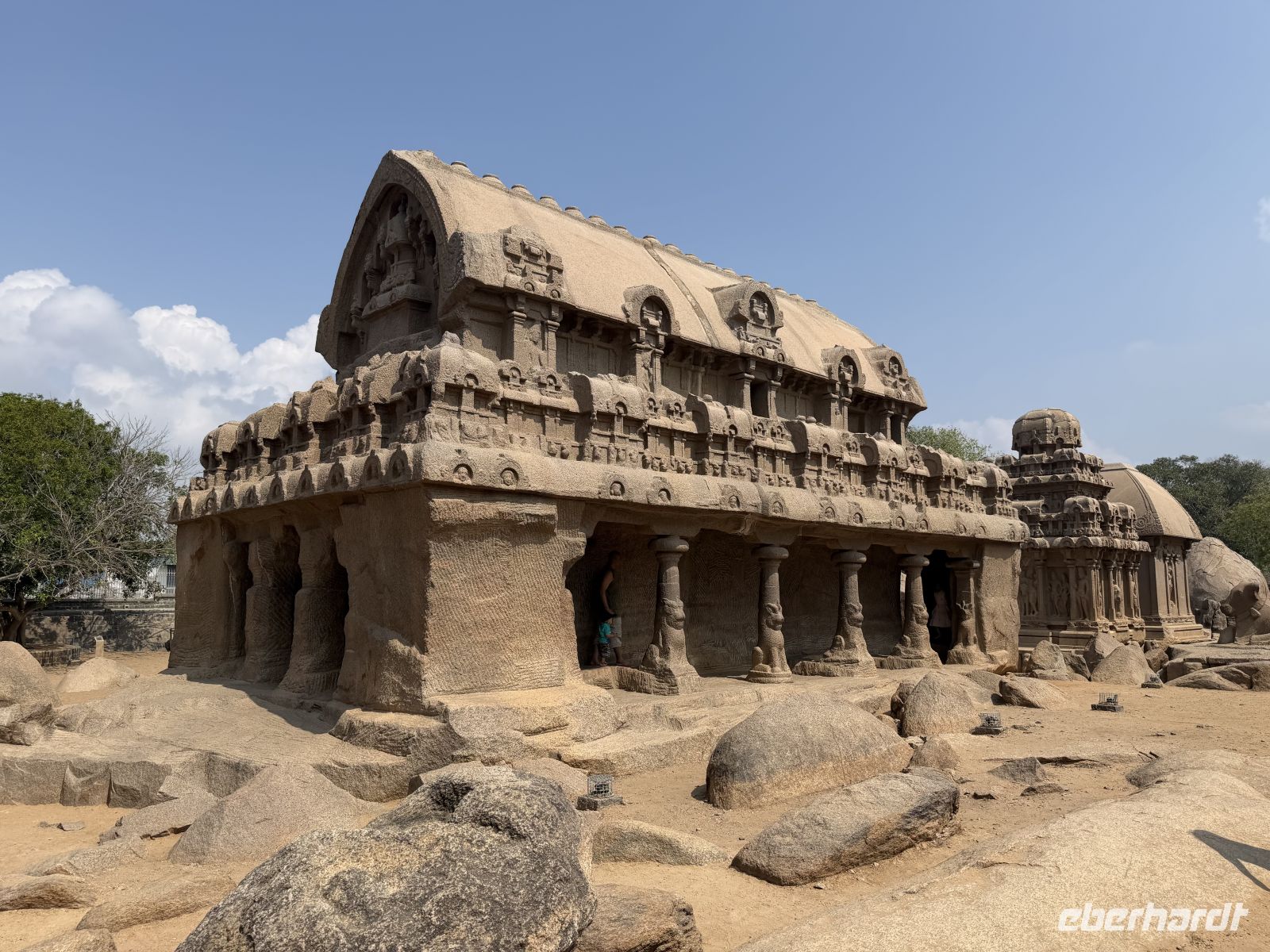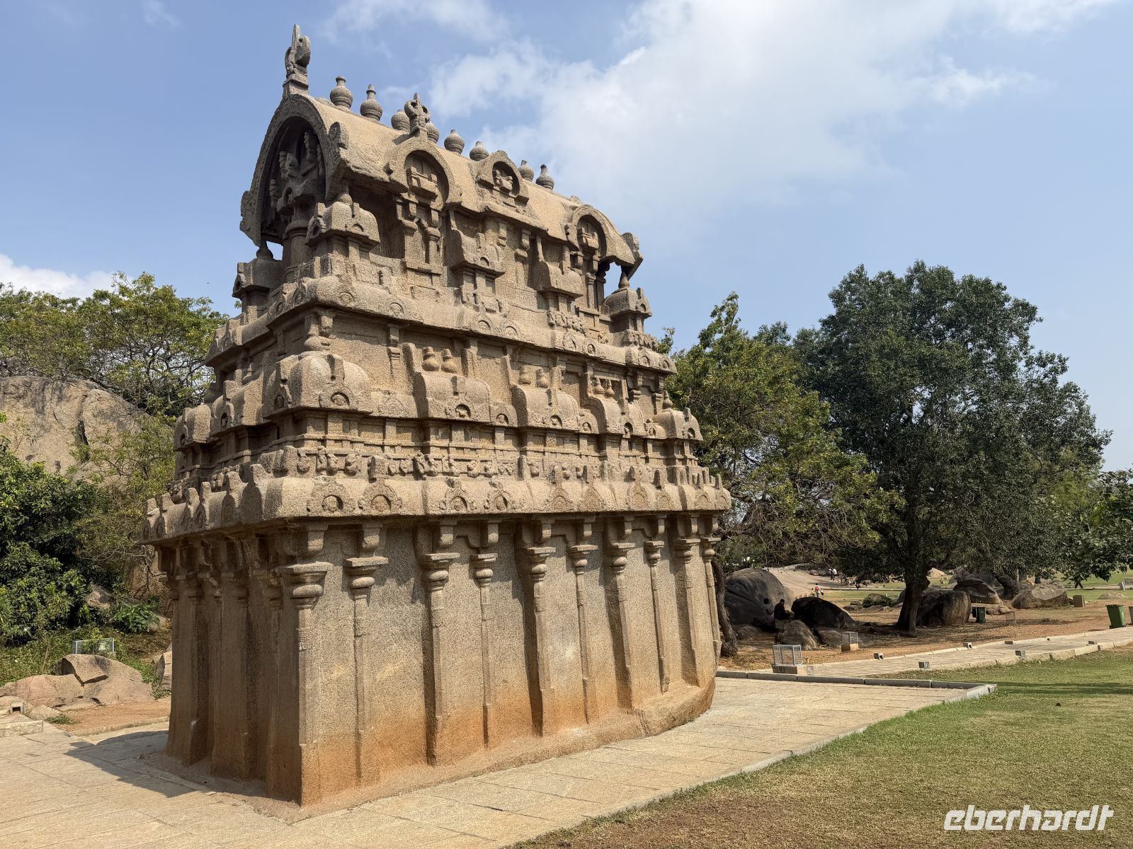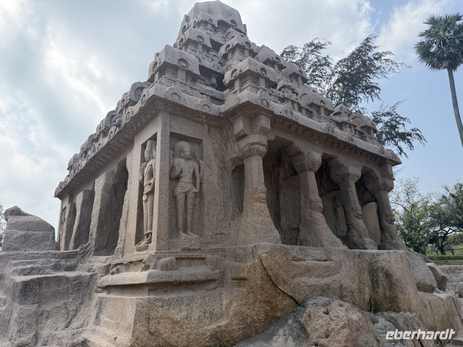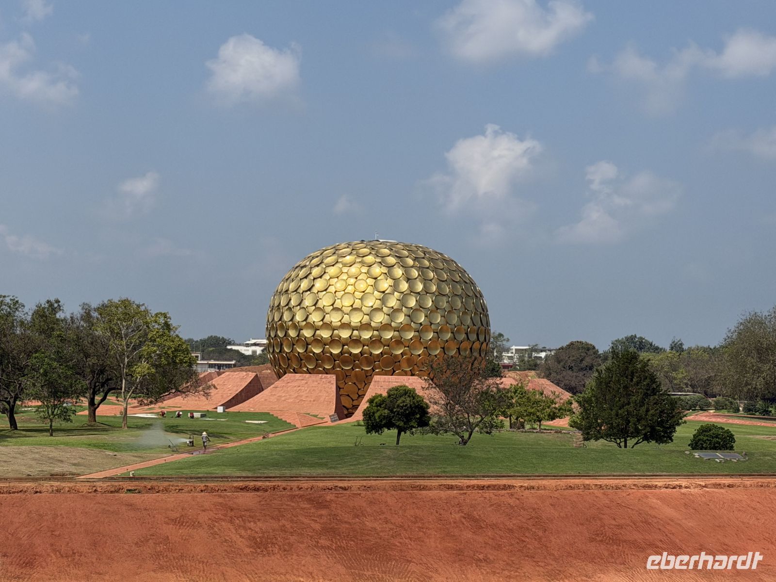 Zusätzlich zum ausgeschriebenen Programm machen wir einen Stopp an den dravidischen, monolithischen Five Rathas, die nur einen halben Kilometer weiter liegen. Die Rathas aus dem 7.Jh. ähneln Prozessionswagen, so wie sie bei den Festen genutzt werden. Die Funktion ist bis heute nicht geklärt. Wahrscheinlich symbolisieren sie die 5 Pandava Helden aus einem Epos. Draupadi Ratha ist der kleinste der 5 in der Form eines Strohhüttentempels, gewidmet Durga mit Löwenfigur davor. Arjuna Ratha ist Shiva gewidmet. Hier findet man reich verzierte Götter und Tierdarstellungen. Bhima Ratha hat eine langgestreckte Form und ist Vishnu gewidmet. Hier sind keine figürlichen Reliefs zu finden. Nakula Sahadeva Rahta wird von einem Elefanten bewacht und soll Indra gewidmet sein. Dharmaraja Ratha ist dreistöckig und Harihara gewidmet. Wir verlassen nun die Pallava Kunstlandschaft und brauchen erst mal eine Pause mit Kaffee, um dann in Auroville den Muttertempel Matrimandir mit seinem spirituellen Meditationszentrum zu besuchen. Eine Einführung in diese Welt gibt das kleine Museum, dann laufen wir durch einen Parkähnlichen Wald bis zur goldenen Kugel, die als stiller Meditationsort dient. Das Zentrum ist umgeben von einem im Bau befindlichen Wassergraben. Wir überlegen, wo so viel Wasser herkommen soll, um den Graben zu befüllen. Eine Infotafel erklärt uns die Finanzierung dieser Anlage. Bhawani berichtet uns von den Abläufen eines Aufenthaltes, den Prinzipien und der Mutter, Gründerin Mirra Alfassa, die auf den Lehren Sri Aurobindos die experimentelle Stadt in Tamil Nadu 1968 gegründet hat.