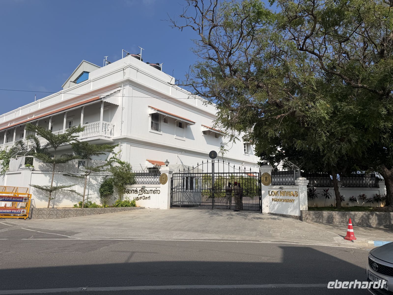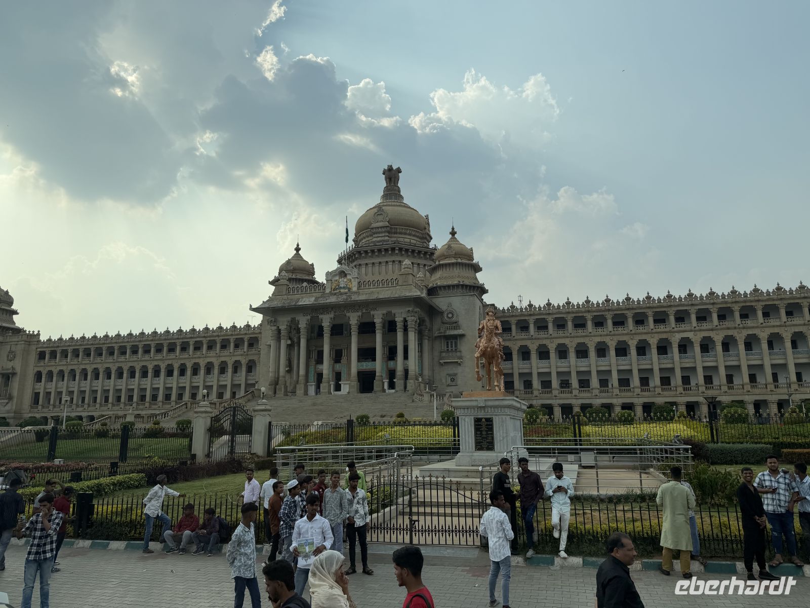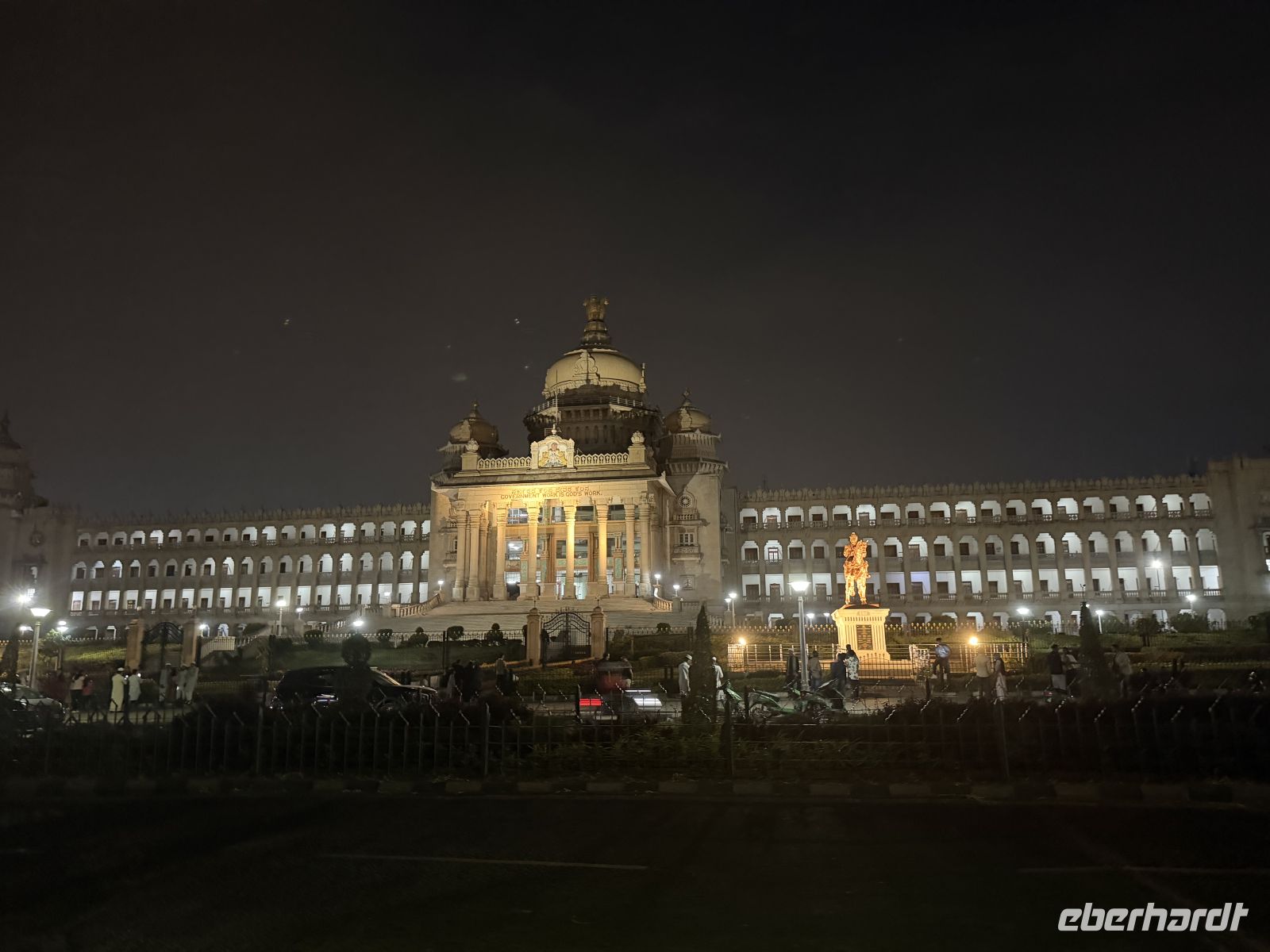 Der Bus bringt uns nun zum nächsten Standort nach Bangalore. Bhawani berichtet uns auf dem Weg dort hin über Unberührbare und dem Kastensystem in Indien. Am frühen Nachmittag erreichen wir Bangalore und unser Reiseleiter lädt uns ein seine Familie Schwesterlicherseits zu besuchen. Nah klar wollen wir das. Wir werden herzlich empfangen und lernen die Gastfreundschaft der Inder kennen. (Danke für diesen ungewöhnlichen Einblick auf unserer Reise.) Anschließend checken wir im Hotel ein. Abends spazieren wir nach dem Essen zum beleuchteten Parlamentsgebäude und fahren mit einem frechen Tuktukfahrer zurück ins Hotel.