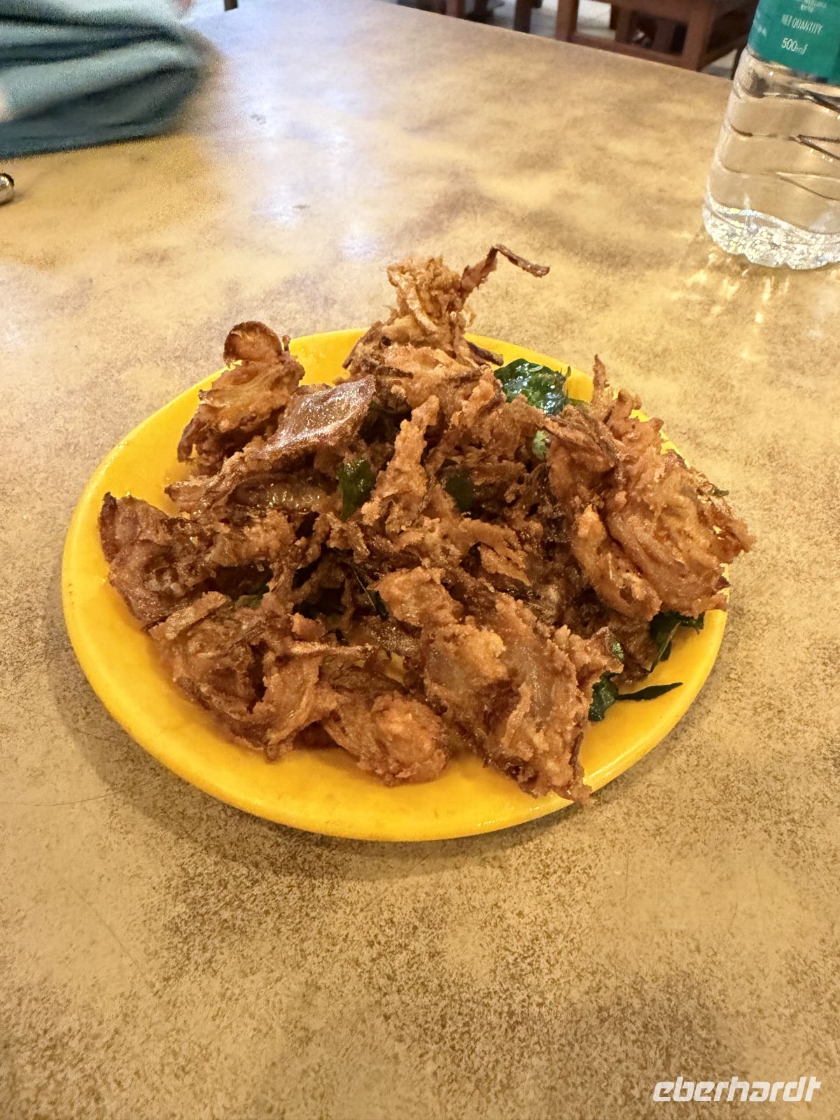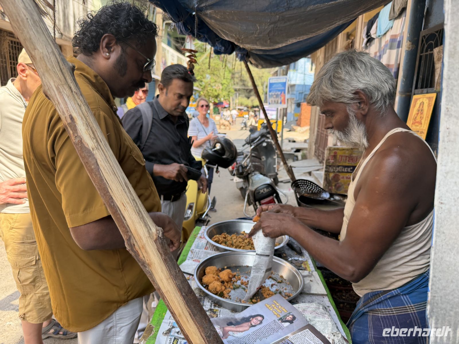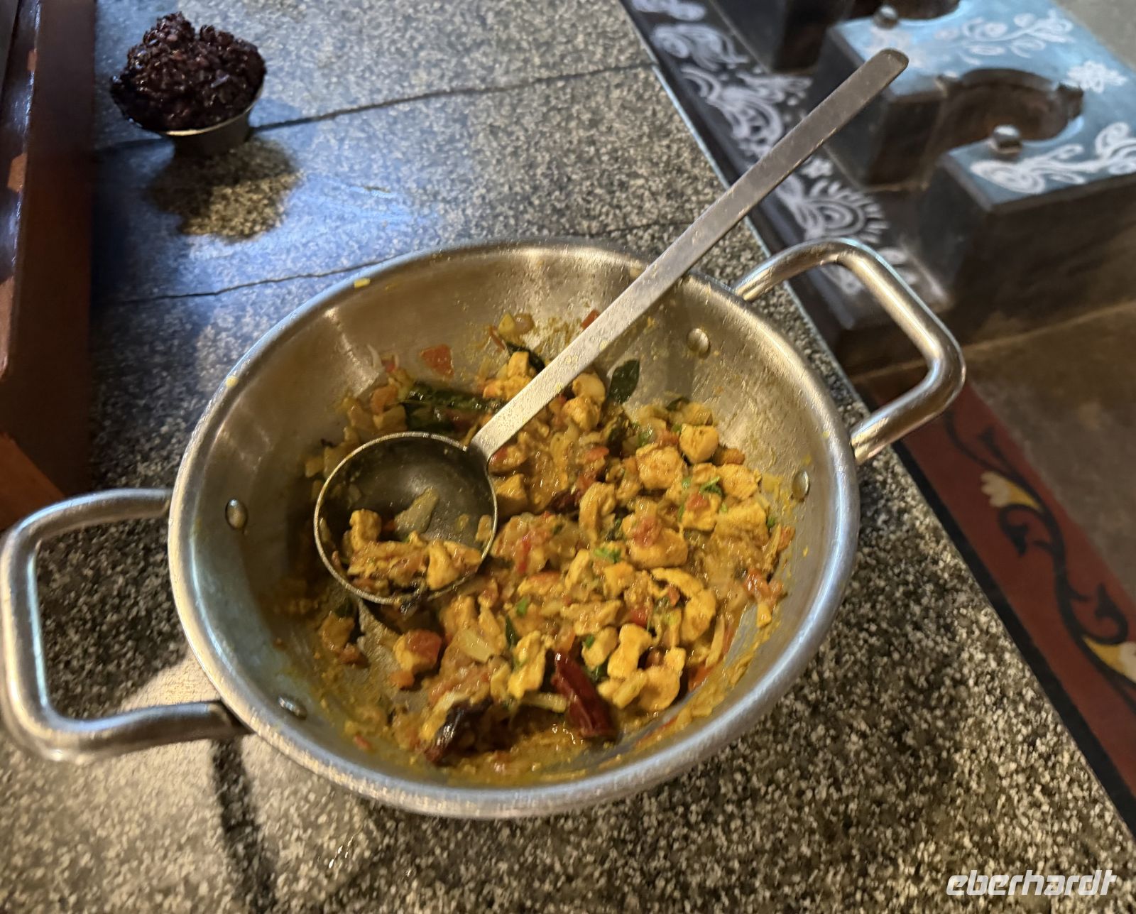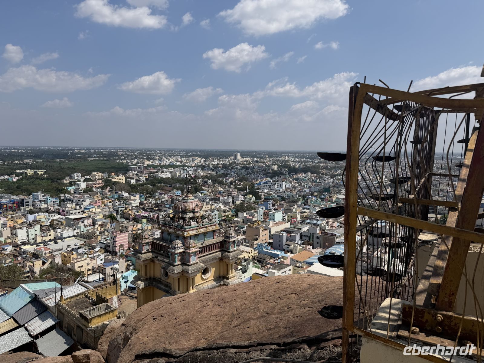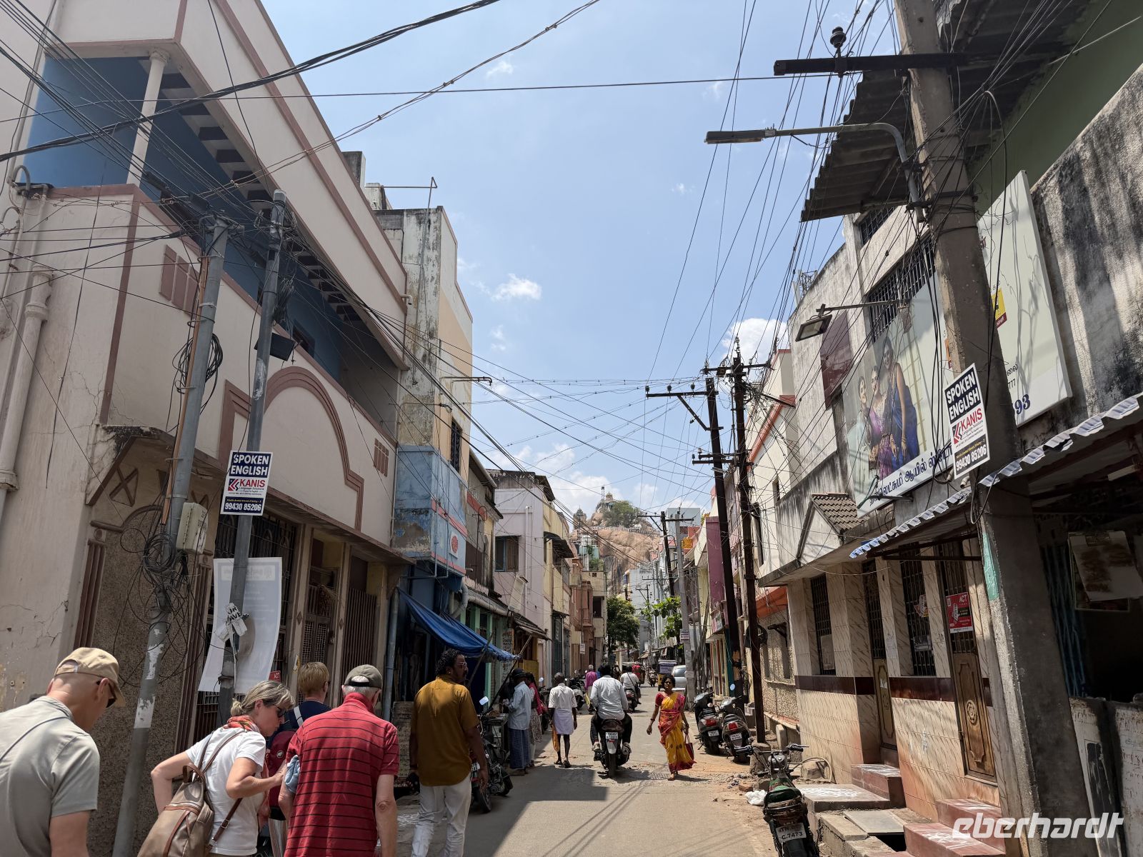 Nun fahren wir weiter nach Trichy. Bhawani erzählt uns unterwegs über die Stellung der Frau im Hinduismus und Indien auf. Mittags kommen wir in Trichy (Tiruchirappalli) an. Unser Ziel ist die Felsenfestung, die wir bereits vom Bus sehen konnten, denn sie thront über der Stadt. Auf dem Weg zum Aufgang hören wir Musik. Es findet vor dem Aufgang eine Zeremonie statt. Leute drängen sich vor einem kleinen Gebäude. Der Brahmane segnet die Menschen mit Feuer. Wir machen uns jedoch auf, die 423 Stufen mit Socken und bei 34 Grad zu erklimmen. Die Aussicht auf die Stadt ist großartig. Wir besuchen über die nächsten Stufen den kleinen Ganesha Tempel. Als wir wieder runter kommen, sitzt die Gesellschaft der Gläubigen im Aufgang und feiert zusammen. Für uns geht es durch die baufälligen Straßen an Verkäufern vorbei zum Bus. An einem Stand mit Pakora Bällchen bleibt Bhawani stehen, der Verkäufer backt für uns frisch die Kichererbsenbällchen und wir kosten. Da die Bällchen frisch aus dem sprudelnden Fett kommen, haben wir keine Bedenken, an einem Straßenstand zu probieren, was die Inder als Zwischenmahlzeit verspeisen. – echt lecker! - Es geht weiter, letzte Stelle für heute; Chettinadu. Unser Hotel ist ein wunderschönes, restauriertes, palastartiges Gebäude. Chidambara Vila, ein Gebäude der Händlerkaste. Hier lernen wir bei einer Kochdemonstration die Rezeptur der Chettinad Küche mit den wunderbaren Gewürzmischungen kennen. 2 Gäste durften der Köchin behilflich sein das Chicken Chettinad und die Süßspeise Pongel herzustellen. Wir anderen verkosten gern. Mit dem Abendessen klingt der Tag aus.