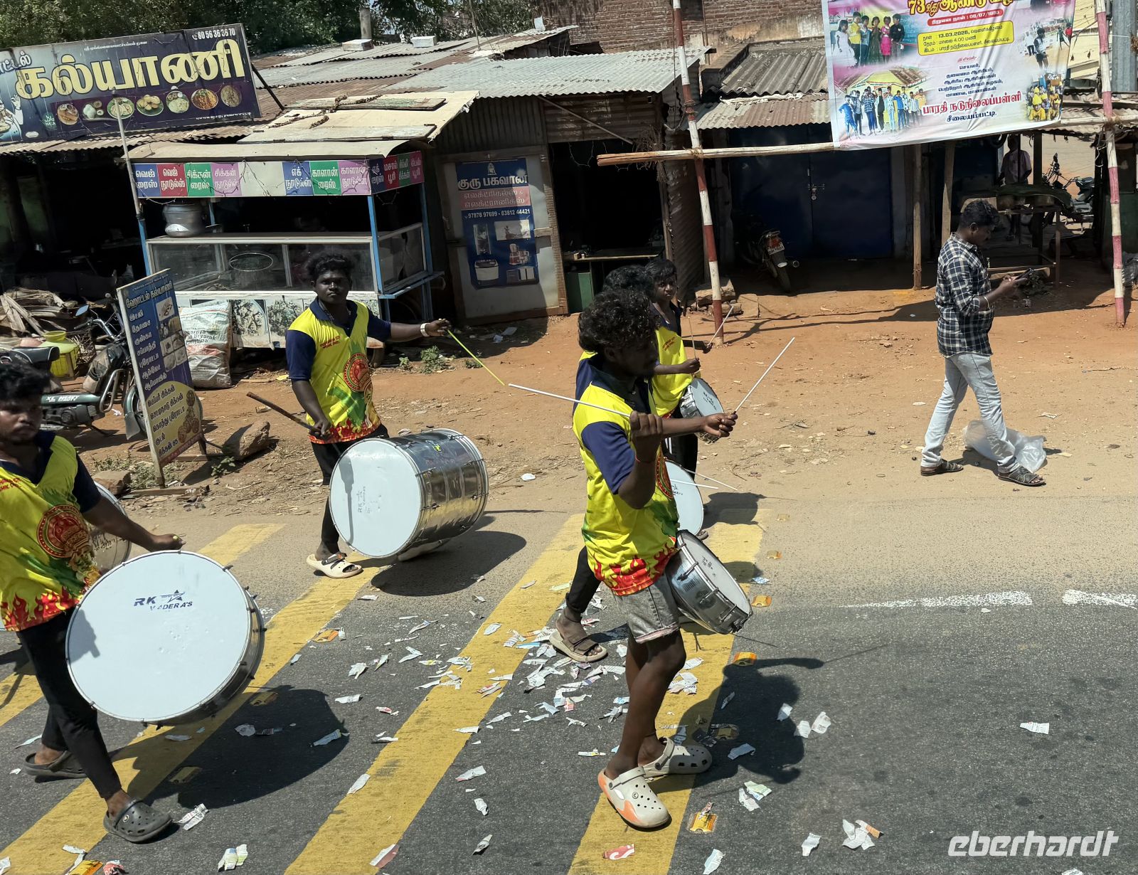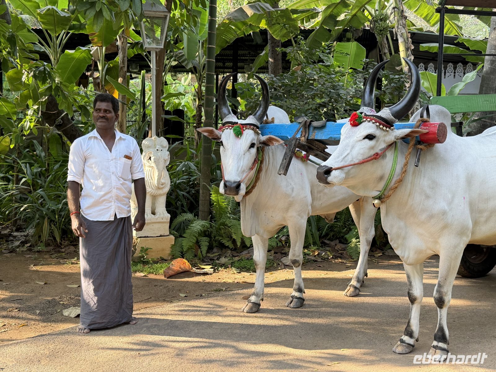 Wir fahren nun nach Swamimalai zu unserem Hotel. Hier werden wir mit duftenden Blumenketten, einer Segnung und einem leckeren Willkommensgetränk begrüßt. So herzlich empfangen beziehen wir unsere Zimmer und nehmen die Einladung zur Ochsenkutschenfahrt gern an. Zwei weiße Bullen mit Höcker und buntem Gescher ziehen den Karren durch den kleinen Ort. Überall winken uns Menschen zu und beäugen uns genauso wie wir diese Menschen. Abends feiern wir den Ehrentag für unser nächstes Geburtstagskind und genießen das im Garten aufgebaute Buffet mit Live Musik und anschließendem Tanz.