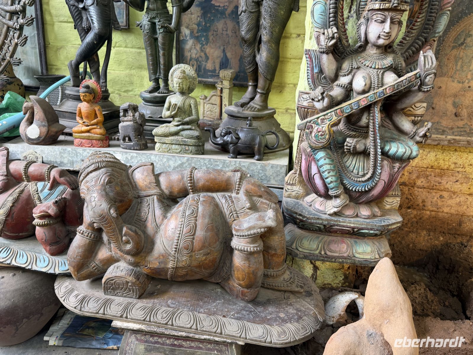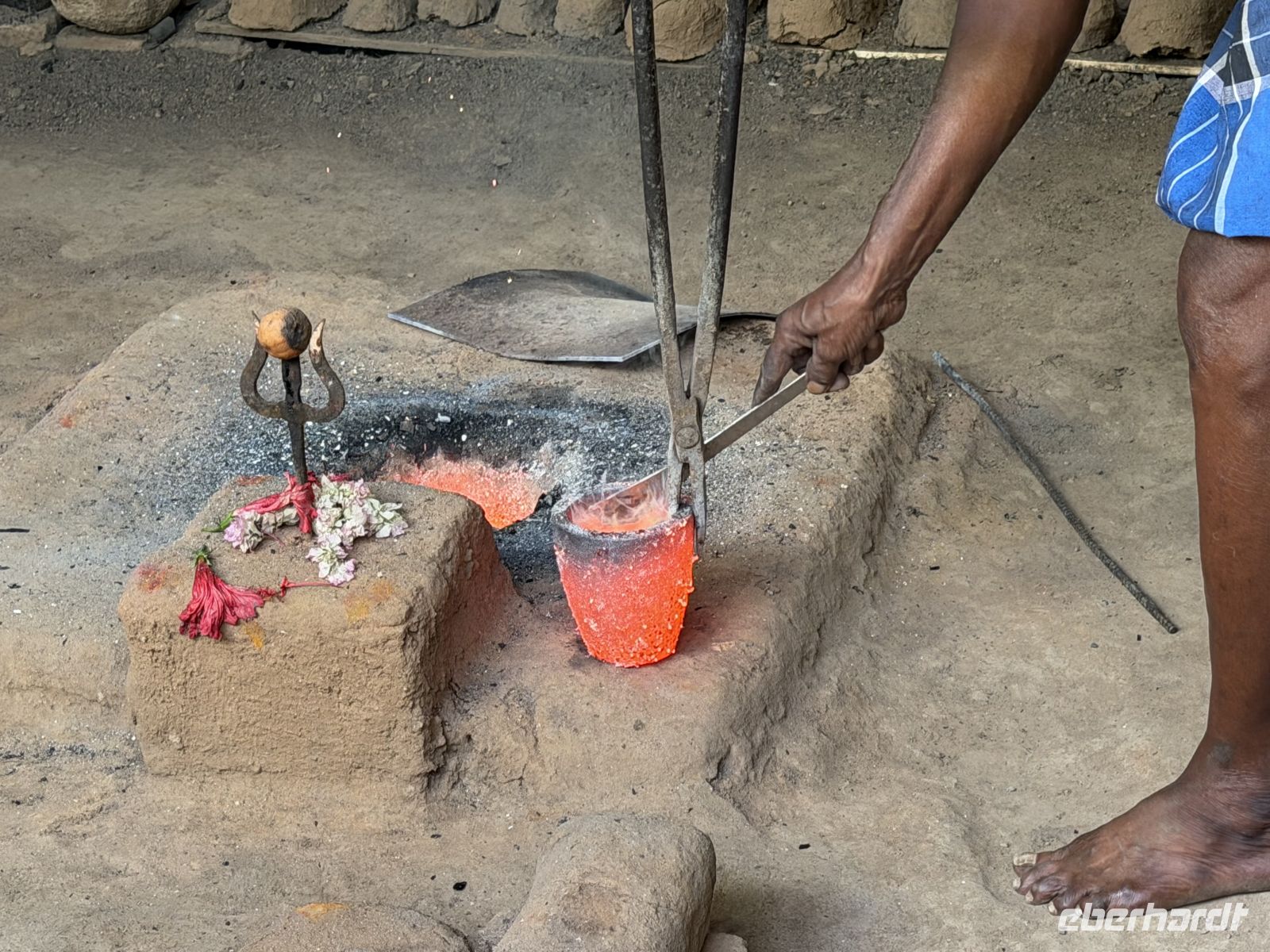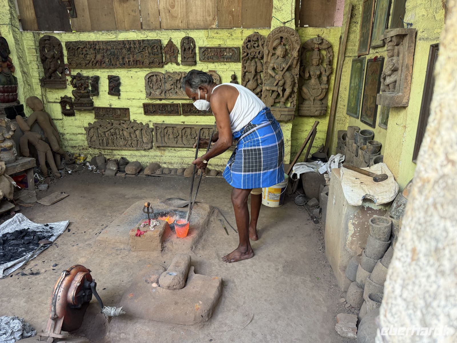 Da Thanjavur das Zentrum der Kupferkunst ist, machen wir einen weiteren Stopp bei einem traditionellen Kupferschmied. Wir bekommen eine eindrucksvolle Vorführung. Beeindruckend ist die kunstvolle Feinarbeit, der aus Wachs und Ton gefertigten Rohlinge. Metall wird gemischt und erhitzt und in die Rohlinge gegossen. Wunderbare Figuren werden so nach alten Methoden hergestellt.