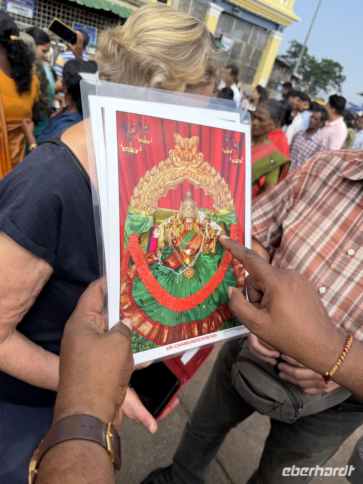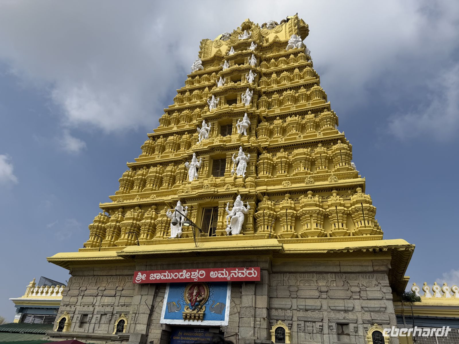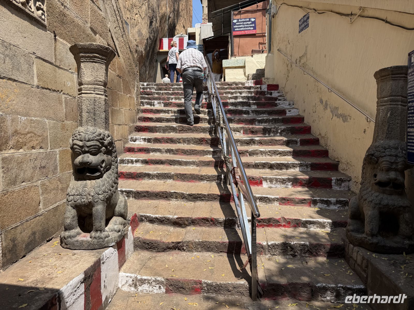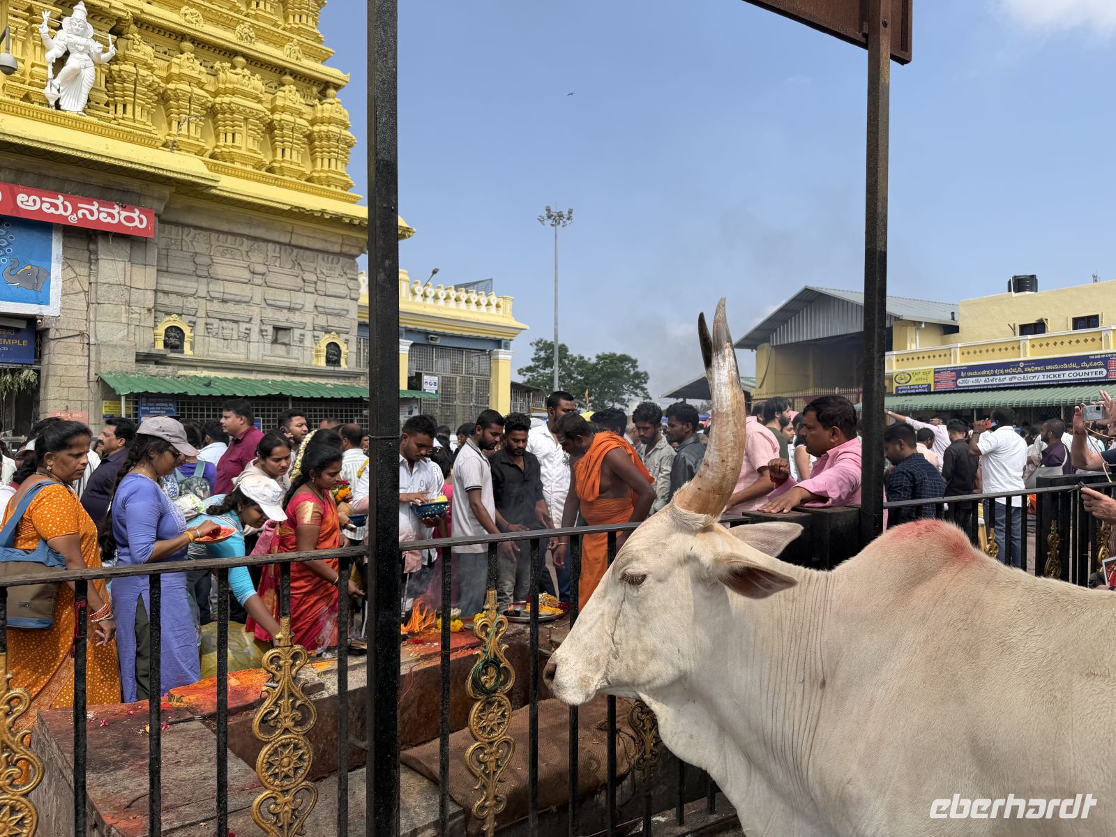Stände mit Opfergaben und Armbändchen säumen den Weg zum 7-stöckigen Gopuram des Chamundeshwari Tempels. Die Göttin ist eine mächtige Inkantation der Durga. Sie war die einzige Frau, die den bösen Dämon halb Mensch, halb Büffel bezwingen konnte, denn kein Mann konnte dieses Werk vollbringen. Selbst der Name Mysuru leitet sich aus dieser Bezwingerin ab. Sie wird von den Hindus als Familiengöttin verehrt. Viele Brahmanen segnen die Menschen auf dem Platz vor dem Tempel. Nichtgläubige dürfen nicht in das Heiligste des Tempels, so wie überall in Indien, doch eine Segnung bekommen wir trotzdem. Der Glücksbringer an unseren Handgelenken muss nun von allein abfallen. Der monolithische Granit Nandie befindet sich ca auf halber Höhe des Berges und wir besuchen ihn kurz für ein Foto.