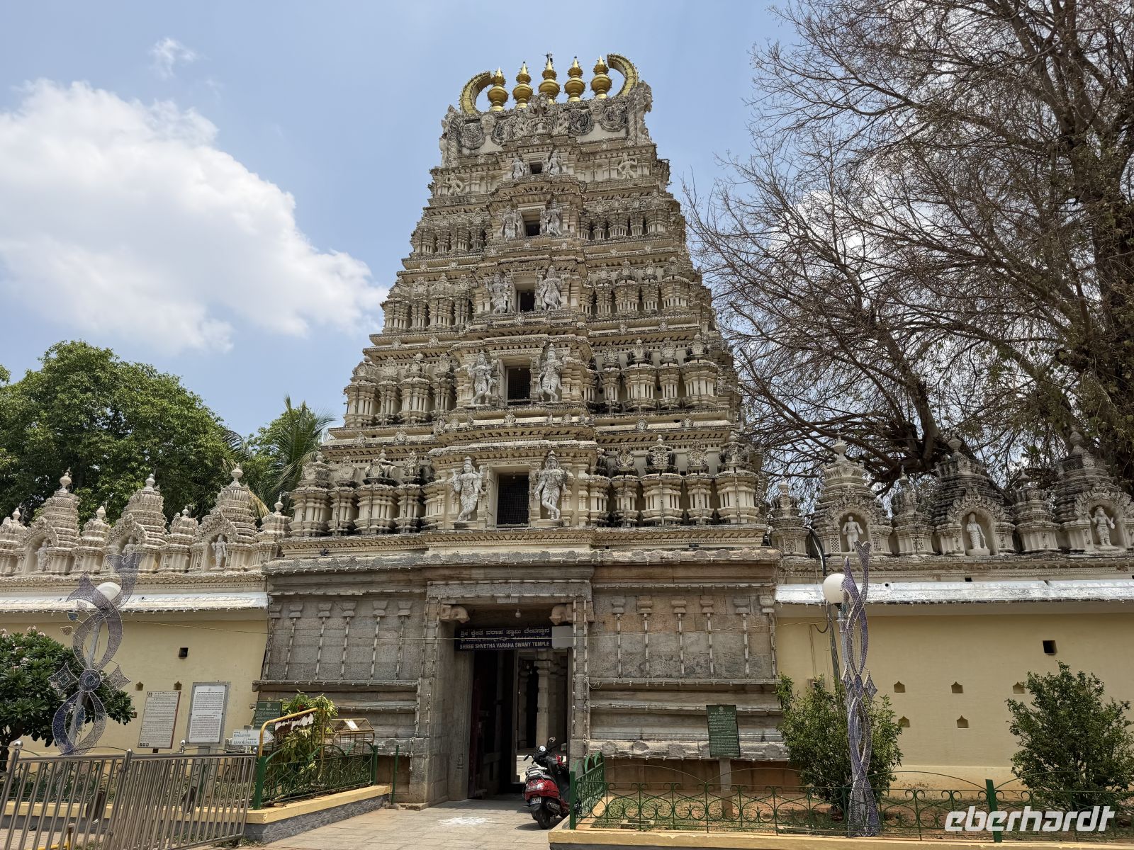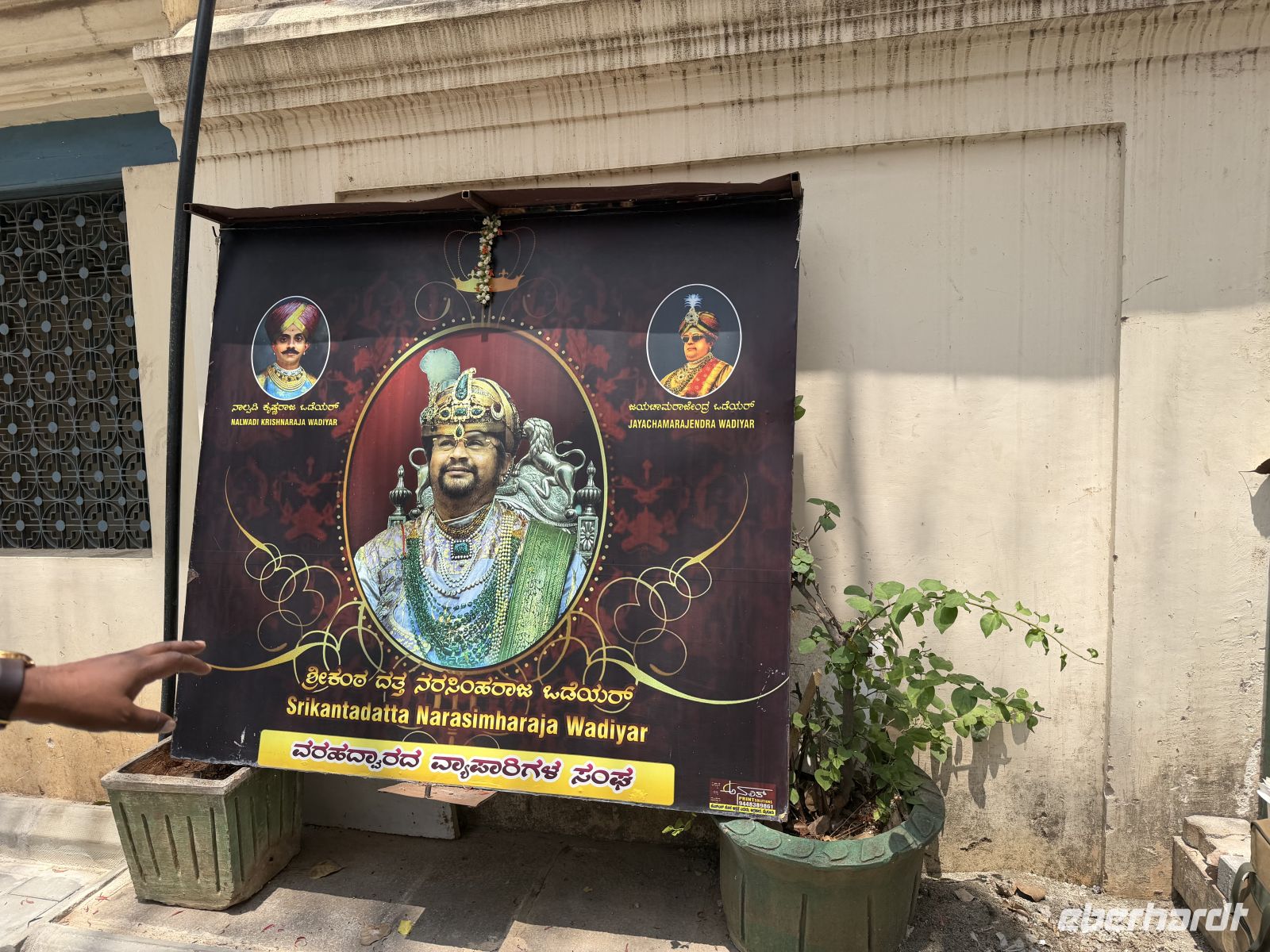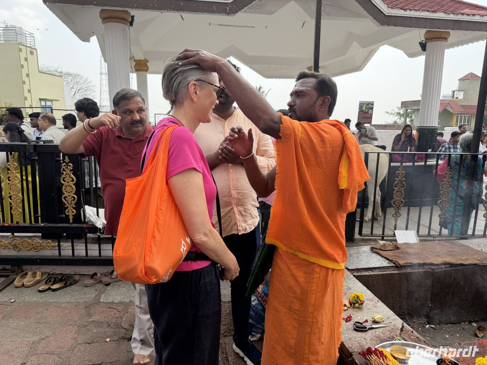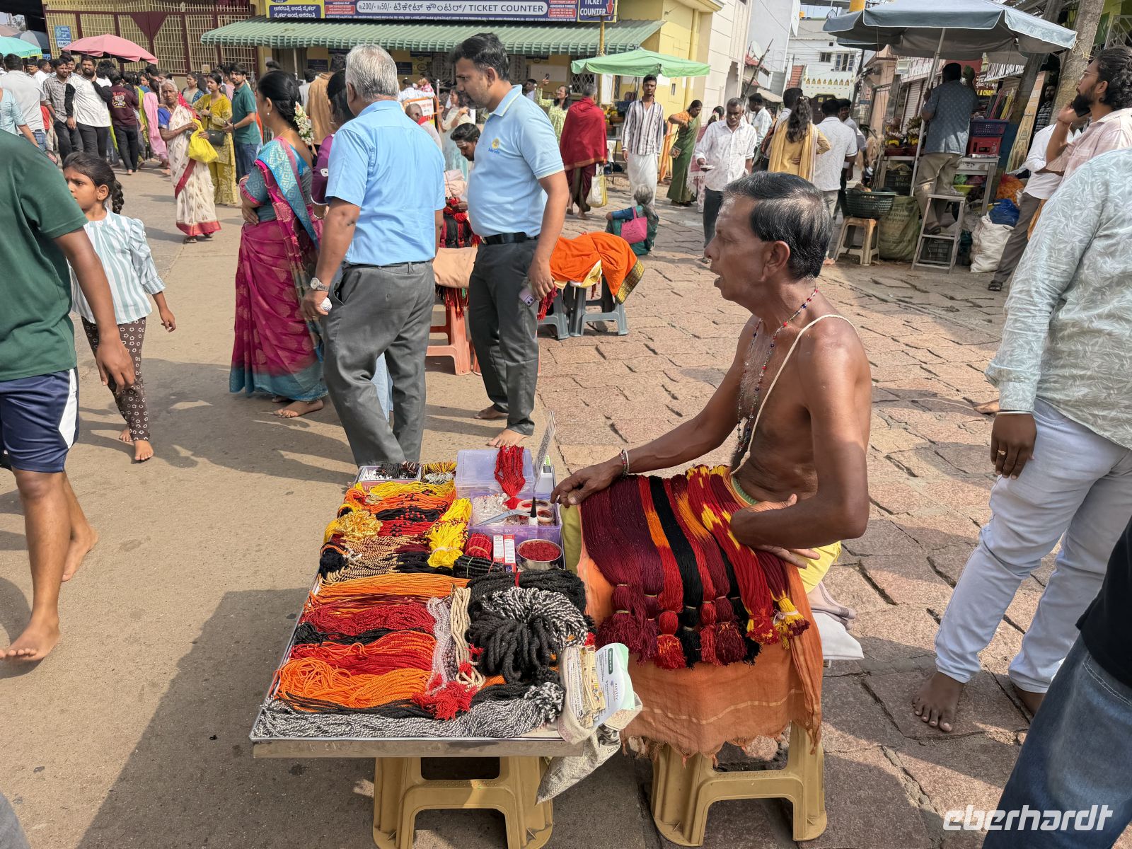 Stände mit Opfergaben und Armbändchen säumen den Weg zum 7-stöckigen Gopuram des Chamundeshwari Tempels. Die Göttin ist eine mächtige Inkantation der Durga. Sie war die einzige Frau, die den bösen Dämon halb Mensch, halb Büffel bezwingen konnte, denn kein Mann konnte dieses Werk vollbringen. Selbst der Name Mysuru leitet sich aus dieser Bezwingerin ab. Sie wird von den Hindus als Familiengöttin verehrt. Viele Brahmanen segnen die Menschen auf dem Platz vor dem Tempel. Nichtgläubige dürfen nicht in das Heiligste des Tempels, so wie überall in Indien, doch eine Segnung bekommen wir trotzdem. Der Glücksbringer an unseren Handgelenken muss nun von allein abfallen. Der monolithische Granit Nandie befindet sich ca auf halber Höhe des Berges und wir besuchen ihn kurz für ein Foto.