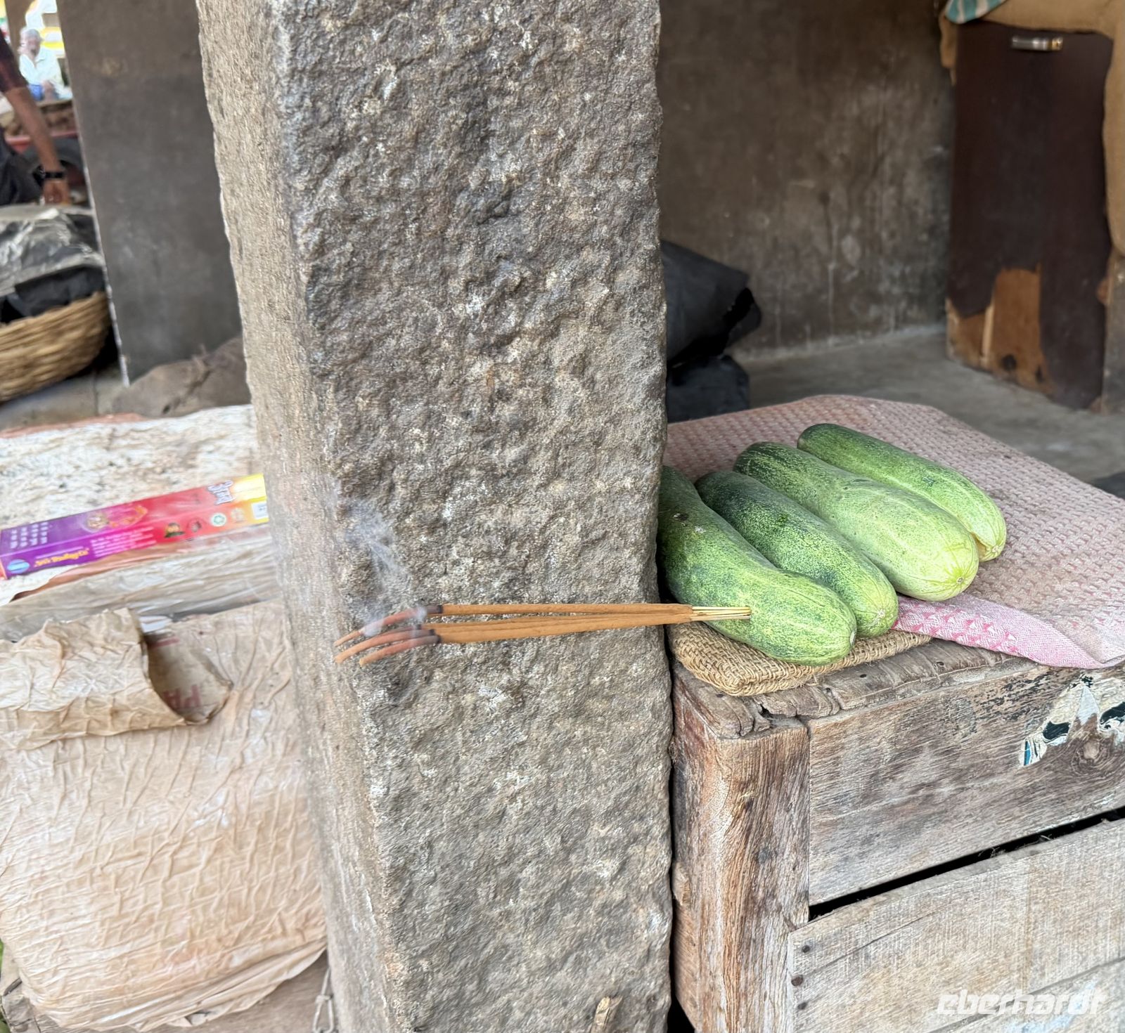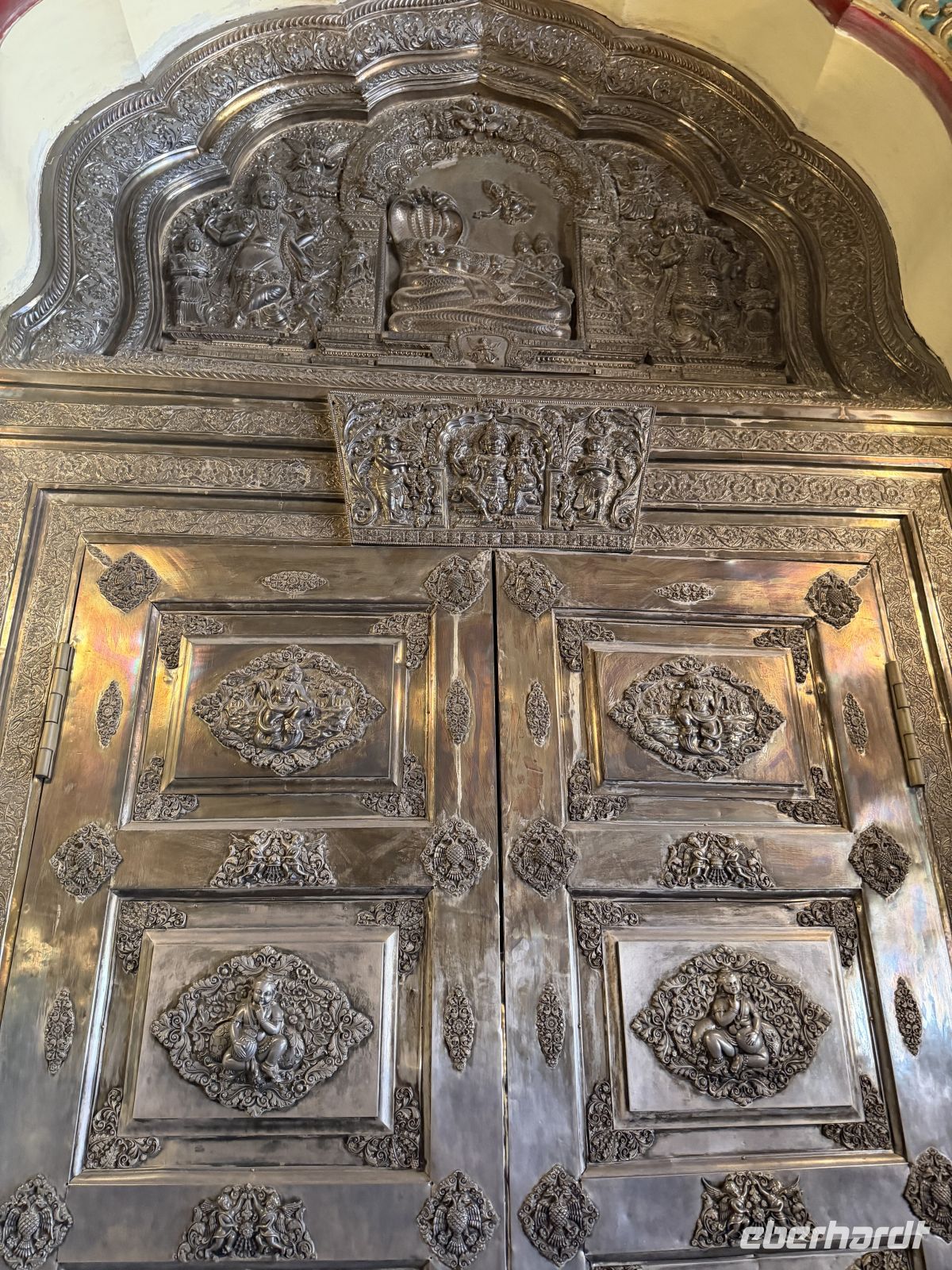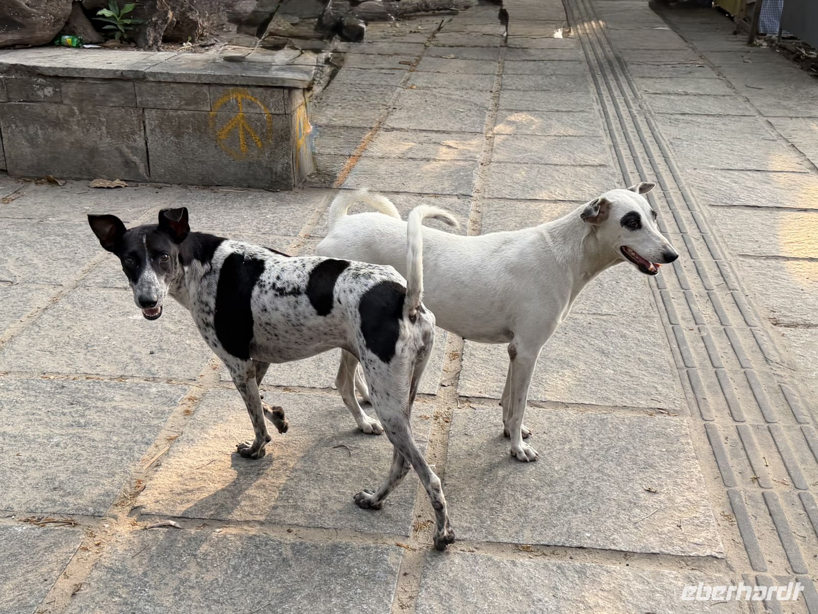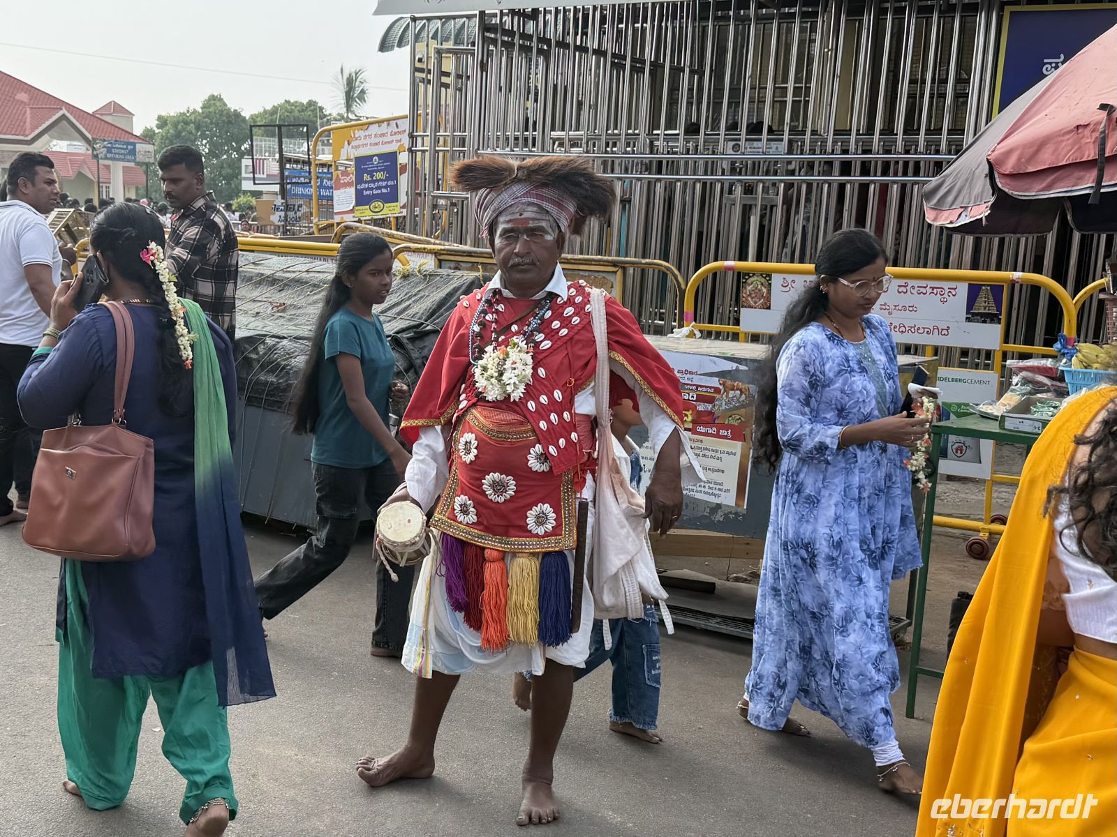 Stände mit Opfergaben und Armbändchen säumen den Weg zum 7-stöckigen Gopuram des Chamundeshwari Tempels. Die Göttin ist eine mächtige Inkantation der Durga. Sie war die einzige Frau, die den bösen Dämon halb Mensch, halb Büffel bezwingen konnte, denn kein Mann konnte dieses Werk vollbringen. Selbst der Name Mysuru leitet sich aus dieser Bezwingerin ab. Sie wird von den Hindus als Familiengöttin verehrt. Viele Brahmanen segnen die Menschen auf dem Platz vor dem Tempel. Nichtgläubige dürfen nicht in das Heiligste des Tempels, so wie überall in Indien, doch eine Segnung bekommen wir trotzdem. Der Glücksbringer an unseren Handgelenken muss nun von allein abfallen. Der monolithische Granit Nandie befindet sich ca auf halber Höhe des Berges und wir besuchen ihn kurz für ein Foto.