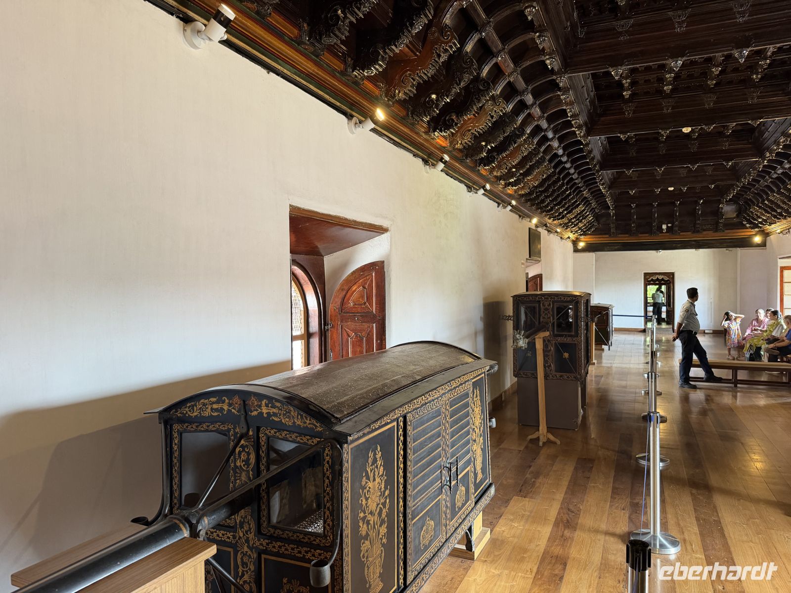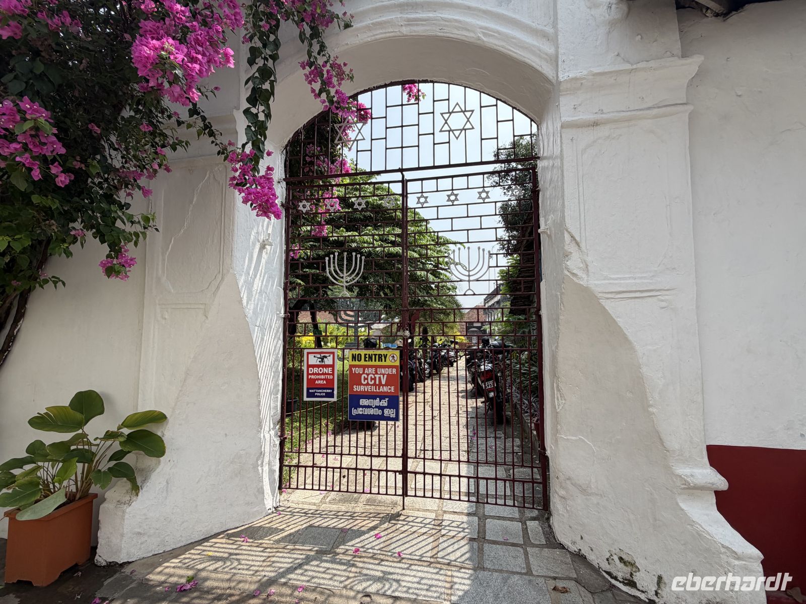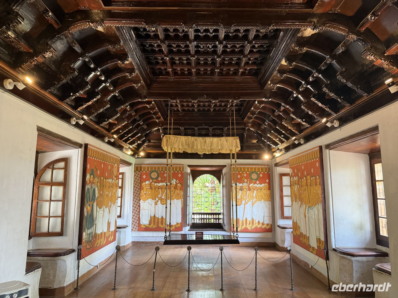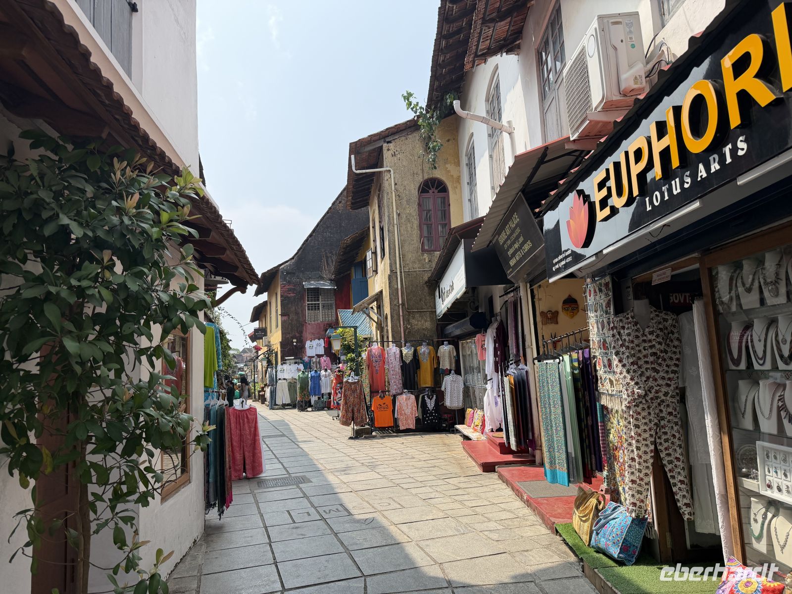 Wir verlassen die Meeresfischer und laufen durch die Gassen zur St. Franziskus Kirche. Der Bus sammelt uns ein und der Palast von Mattancherry (Holländischer Palast) wird angefahren. Der Palast ist ein Geschenk der Portugiesen an den Raja als Gegenleistung guter Handelsprivilegien wurde er 1557 errichtet. Als die Holländer Kochi übernahmen, renovierten sie den Palast und heute findet man Besitztümer der Herrscherfamilie, aber auch reich verzierte Wandmalereien mit Szenen aus dem Ramayana Epos. Neben dem Palast befindet sich ein Hindutempel, den wir nicht besichtigen dürfen. Nur Hindus haben zutritt. Wir suchen nun die Pardesi Synagoge auf und besuchen das jüdische Viertel. Die Holländer verfolgten die Juden nicht und so siedelten sich jüdische Familien im 17 Jh. an. Kronleuchter und Glaslampen schmücken den lichtdurchfluteten Innenraum der Synagoge. Die Geschichte der Malabar Juden kann man im Nebenraum durch Bildtafeln erfahren. Wir schlendern durch das Viertel mit vielen Touristen Shops.