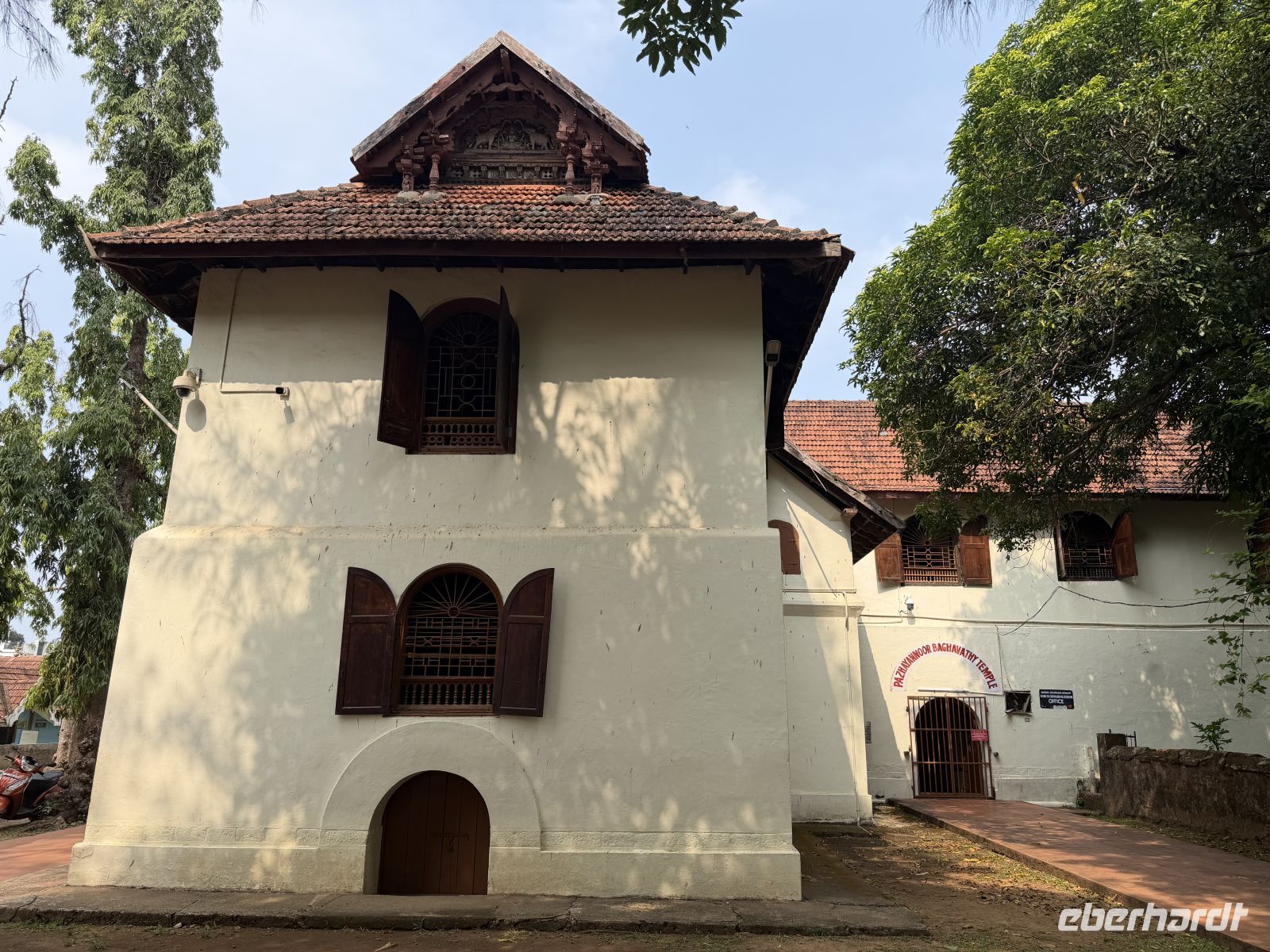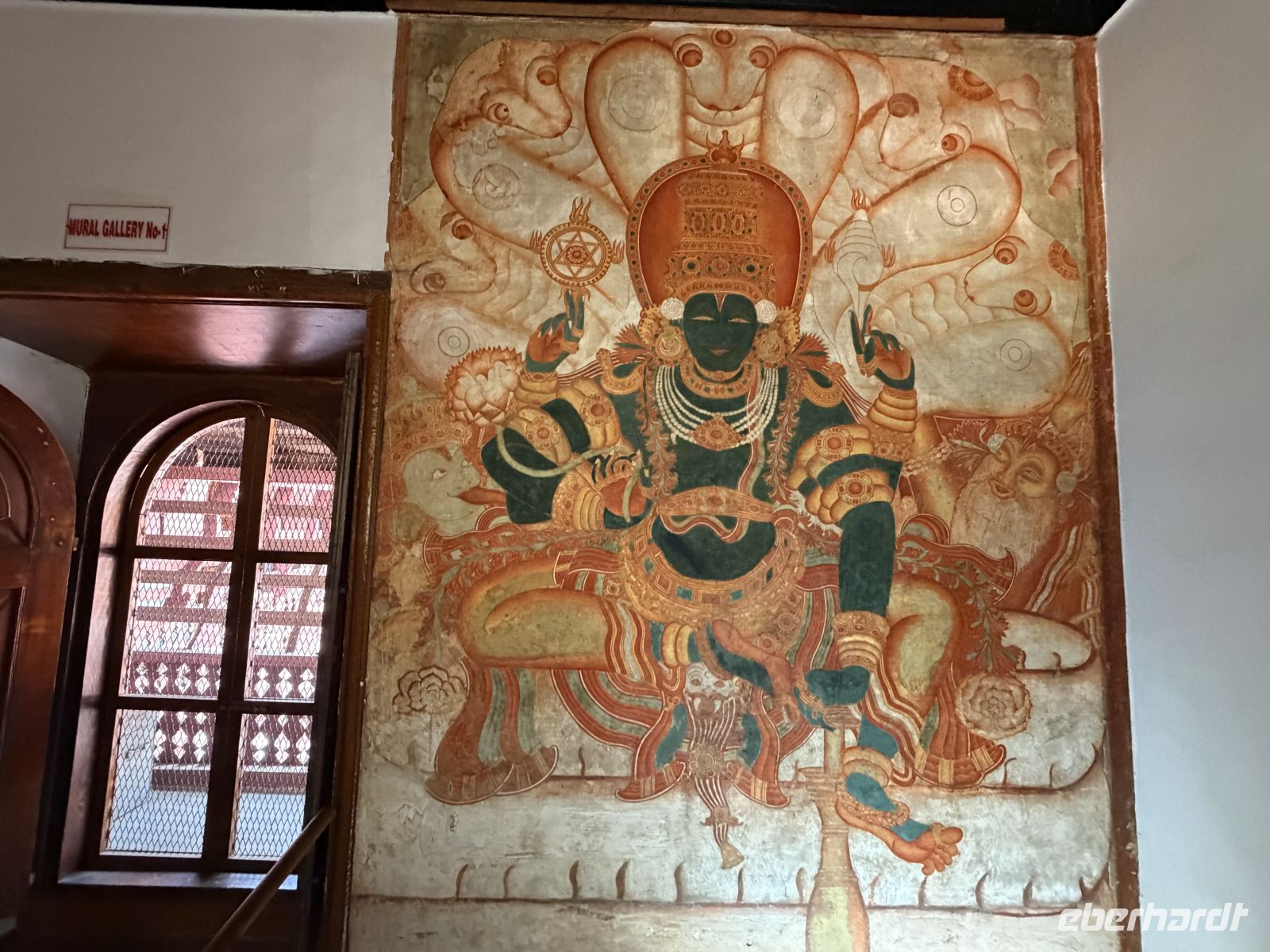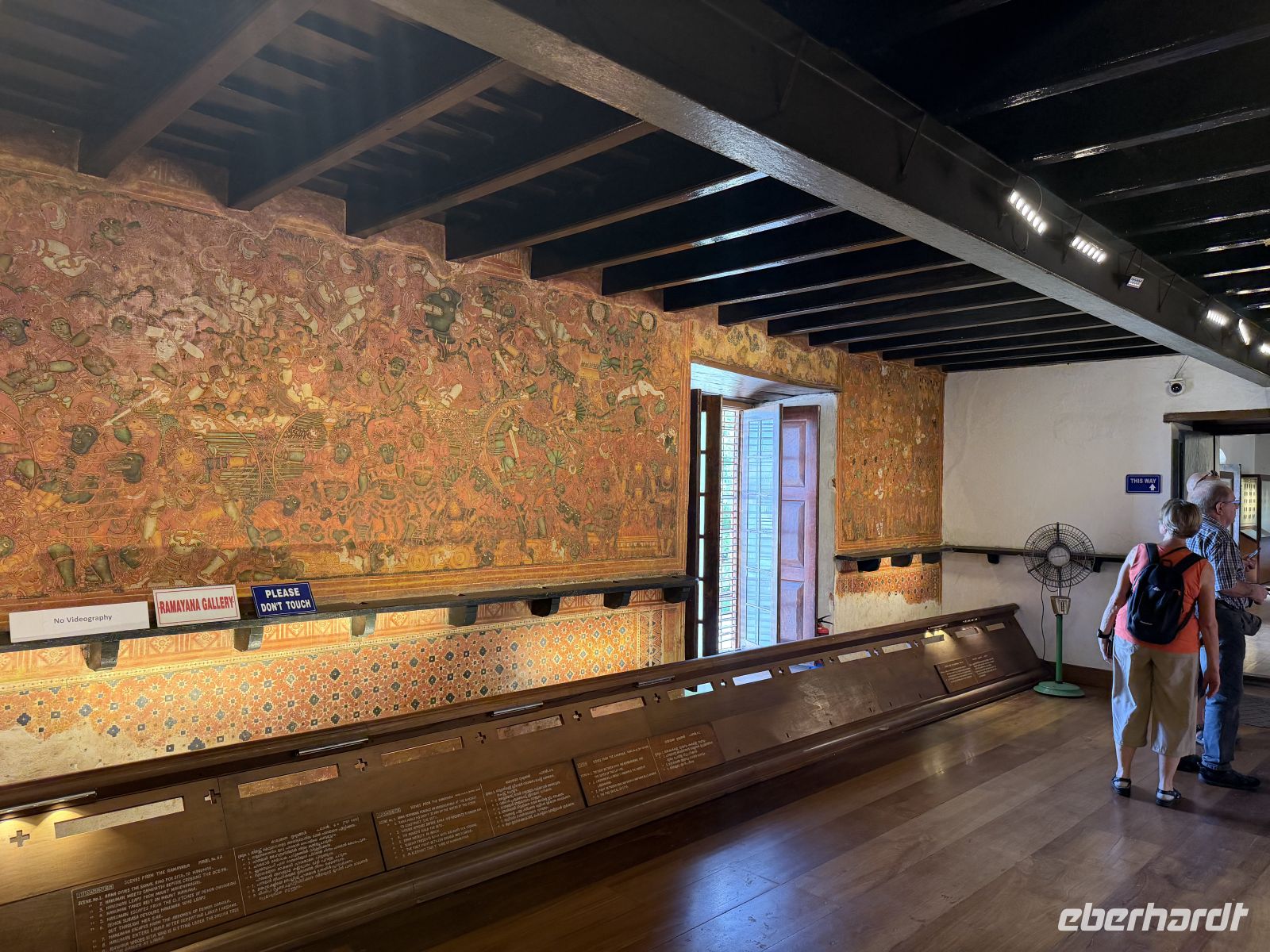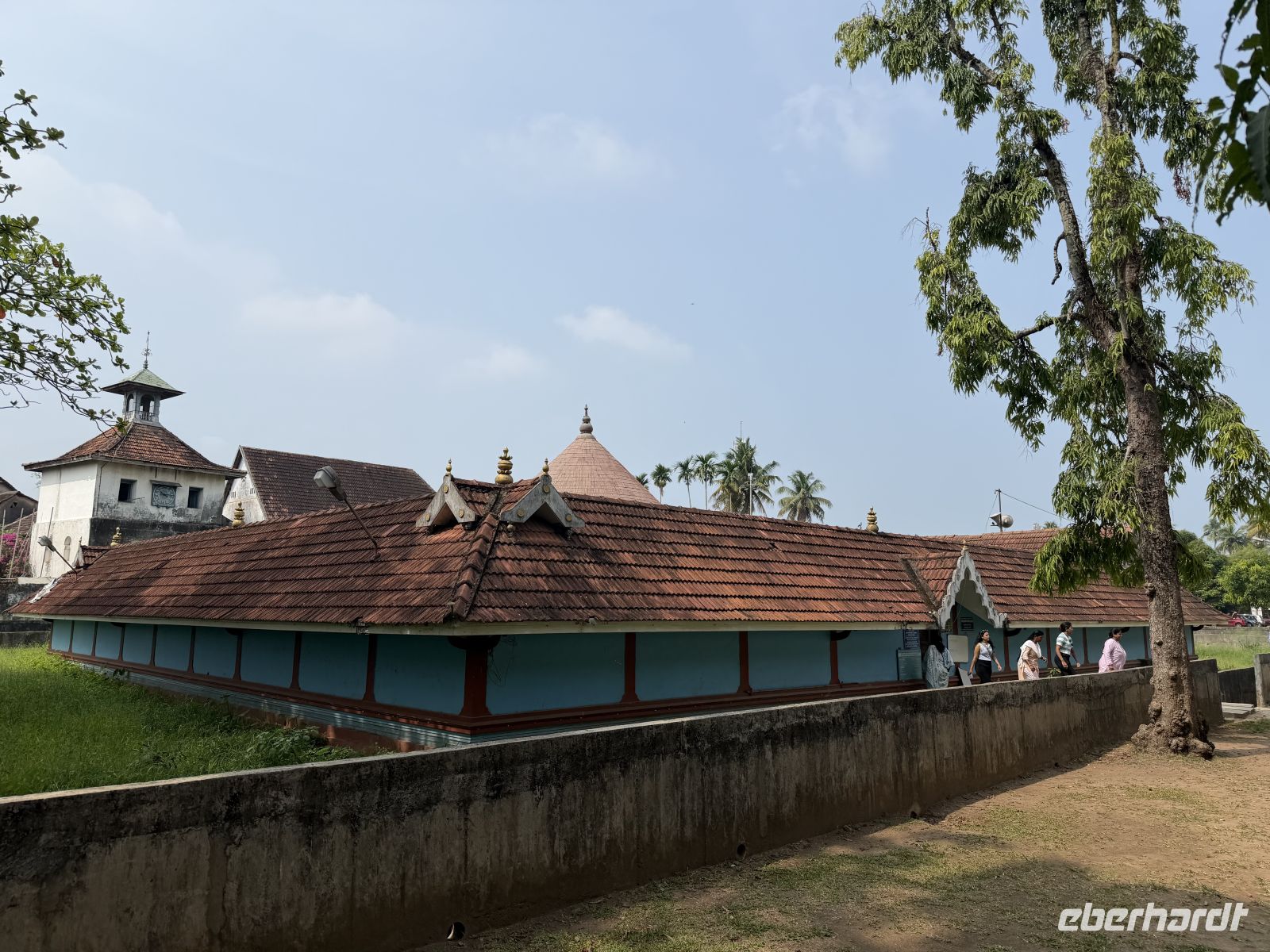 Wir verlassen die Meeresfischer und laufen durch die Gassen zur St. Franziskus Kirche. Der Bus sammelt uns ein und der Palast von Mattancherry (Holländischer Palast) wird angefahren. Der Palast ist ein Geschenk der Portugiesen an den Raja als Gegenleistung guter Handelsprivilegien wurde er 1557 errichtet. Als die Holländer Kochi übernahmen, renovierten sie den Palast und heute findet man Besitztümer der Herrscherfamilie, aber auch reich verzierte Wandmalereien mit Szenen aus dem Ramayana Epos. Neben dem Palast befindet sich ein Hindutempel, den wir nicht besichtigen dürfen. Nur Hindus haben zutritt. Wir suchen nun die Pardesi Synagoge auf und besuchen das jüdische Viertel. Die Holländer verfolgten die Juden nicht und so siedelten sich jüdische Familien im 17 Jh. an. Kronleuchter und Glaslampen schmücken den lichtdurchfluteten Innenraum der Synagoge. Die Geschichte der Malabar Juden kann man im Nebenraum durch Bildtafeln erfahren. Wir schlendern durch das Viertel mit vielen Touristen Shops.