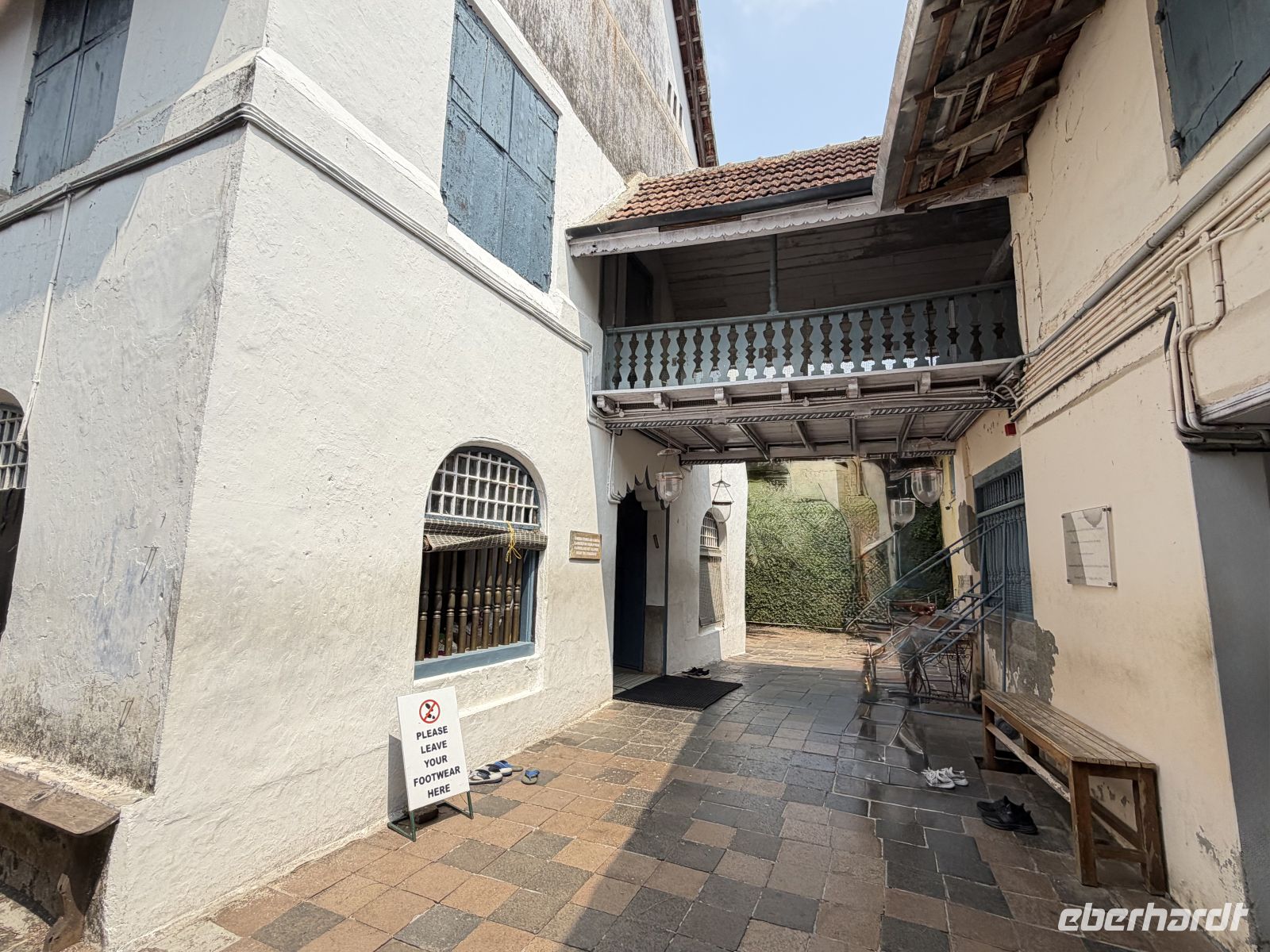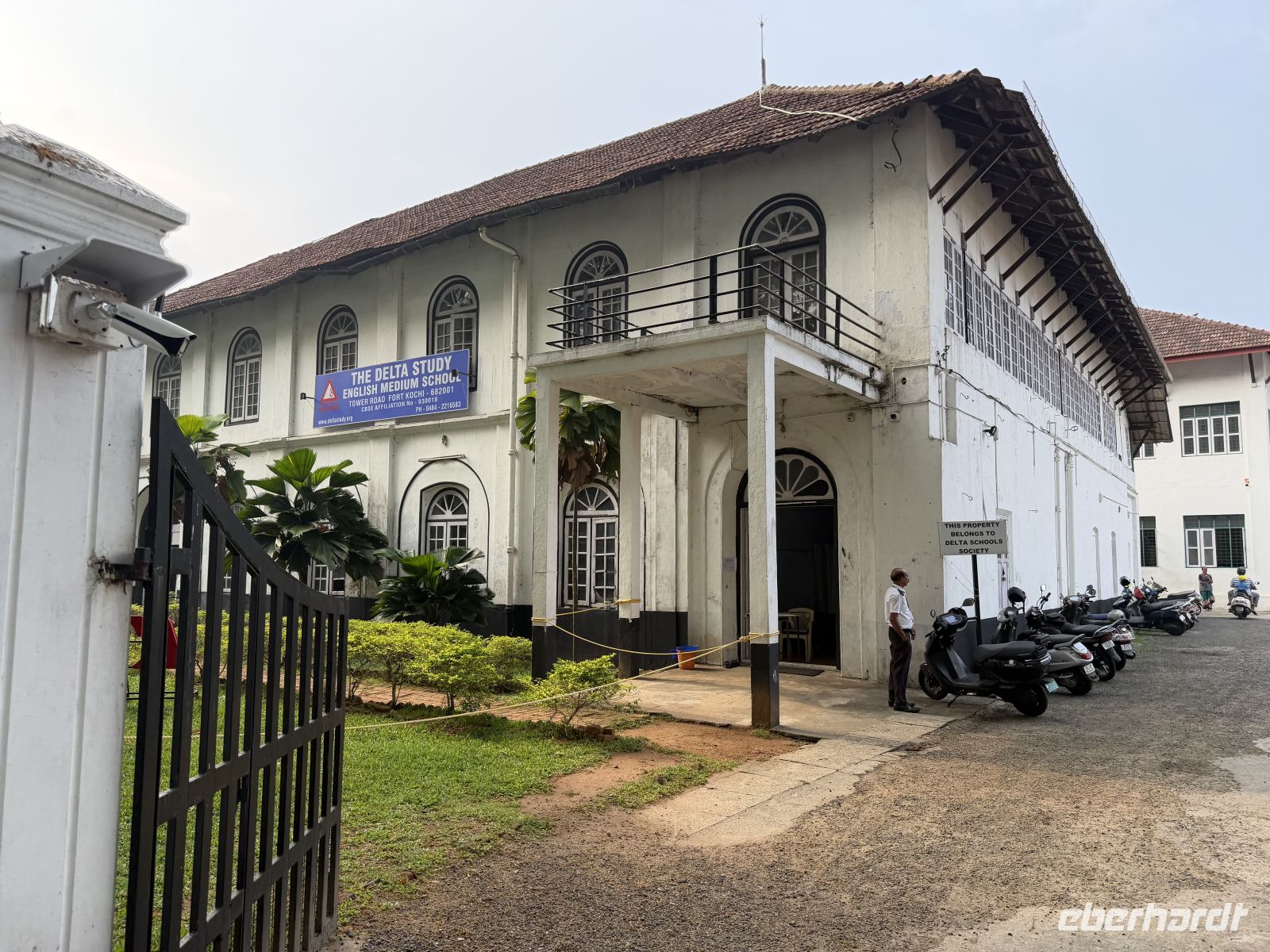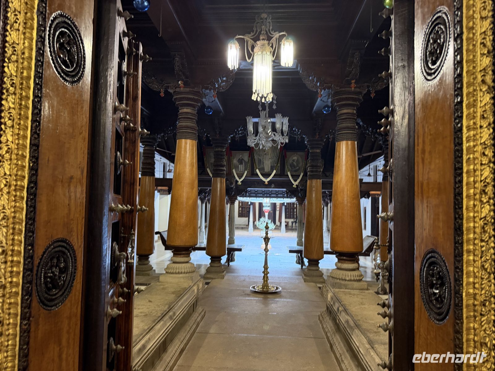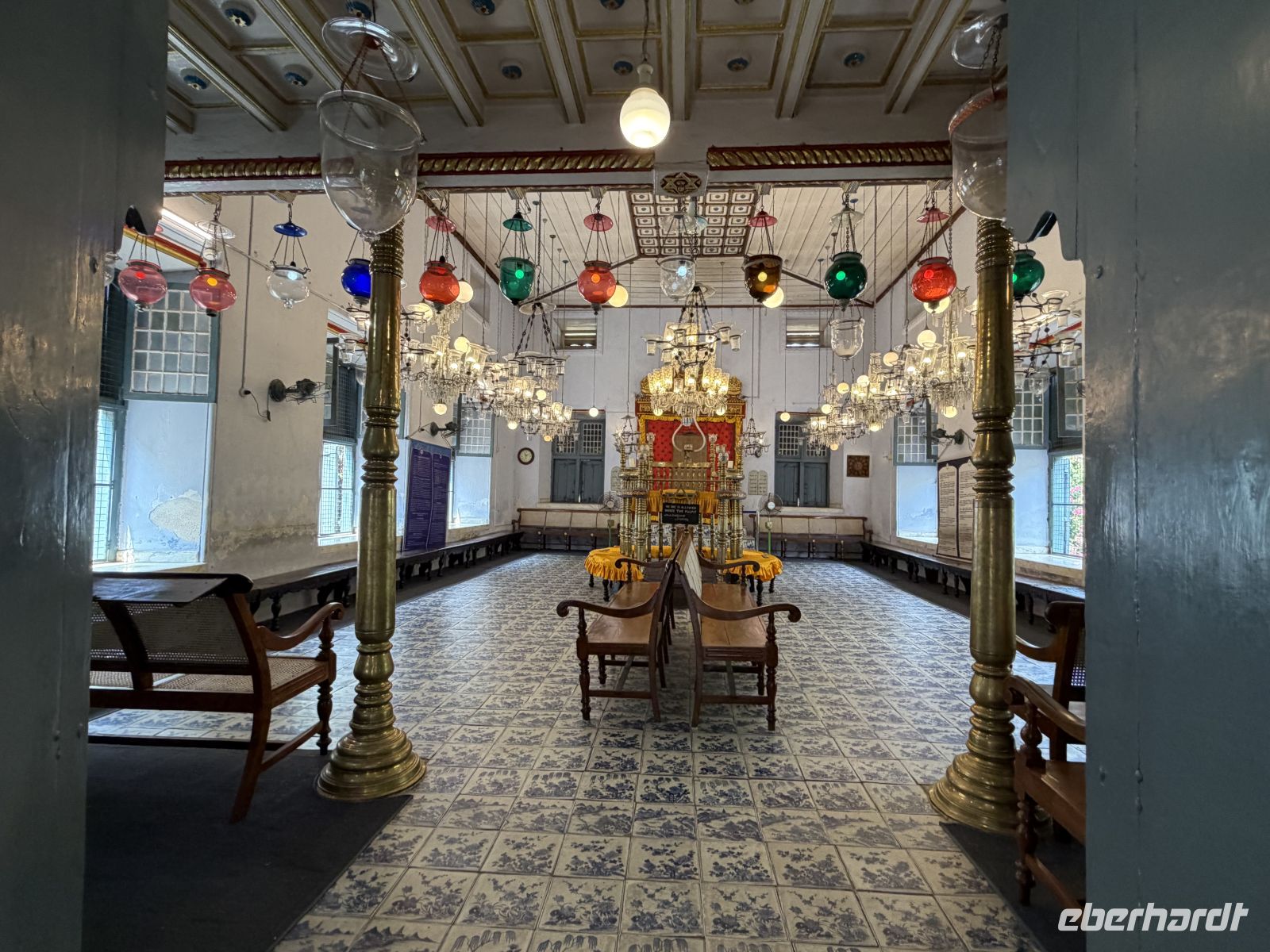 Wir verlassen die Meeresfischer und laufen durch die Gassen zur St. Franziskus Kirche. Der Bus sammelt uns ein und der Palast von Mattancherry (Holländischer Palast) wird angefahren. Der Palast ist ein Geschenk der Portugiesen an den Raja als Gegenleistung guter Handelsprivilegien wurde er 1557 errichtet. Als die Holländer Kochi übernahmen, renovierten sie den Palast und heute findet man Besitztümer der Herrscherfamilie, aber auch reich verzierte Wandmalereien mit Szenen aus dem Ramayana Epos. Neben dem Palast befindet sich ein Hindutempel, den wir nicht besichtigen dürfen. Nur Hindus haben zutritt. Wir suchen nun die Pardesi Synagoge auf und besuchen das jüdische Viertel. Die Holländer verfolgten die Juden nicht und so siedelten sich jüdische Familien im 17 Jh. an. Kronleuchter und Glaslampen schmücken den lichtdurchfluteten Innenraum der Synagoge. Die Geschichte der Malabar Juden kann man im Nebenraum durch Bildtafeln erfahren. Wir schlendern durch das Viertel mit vielen Touristen Shops.
