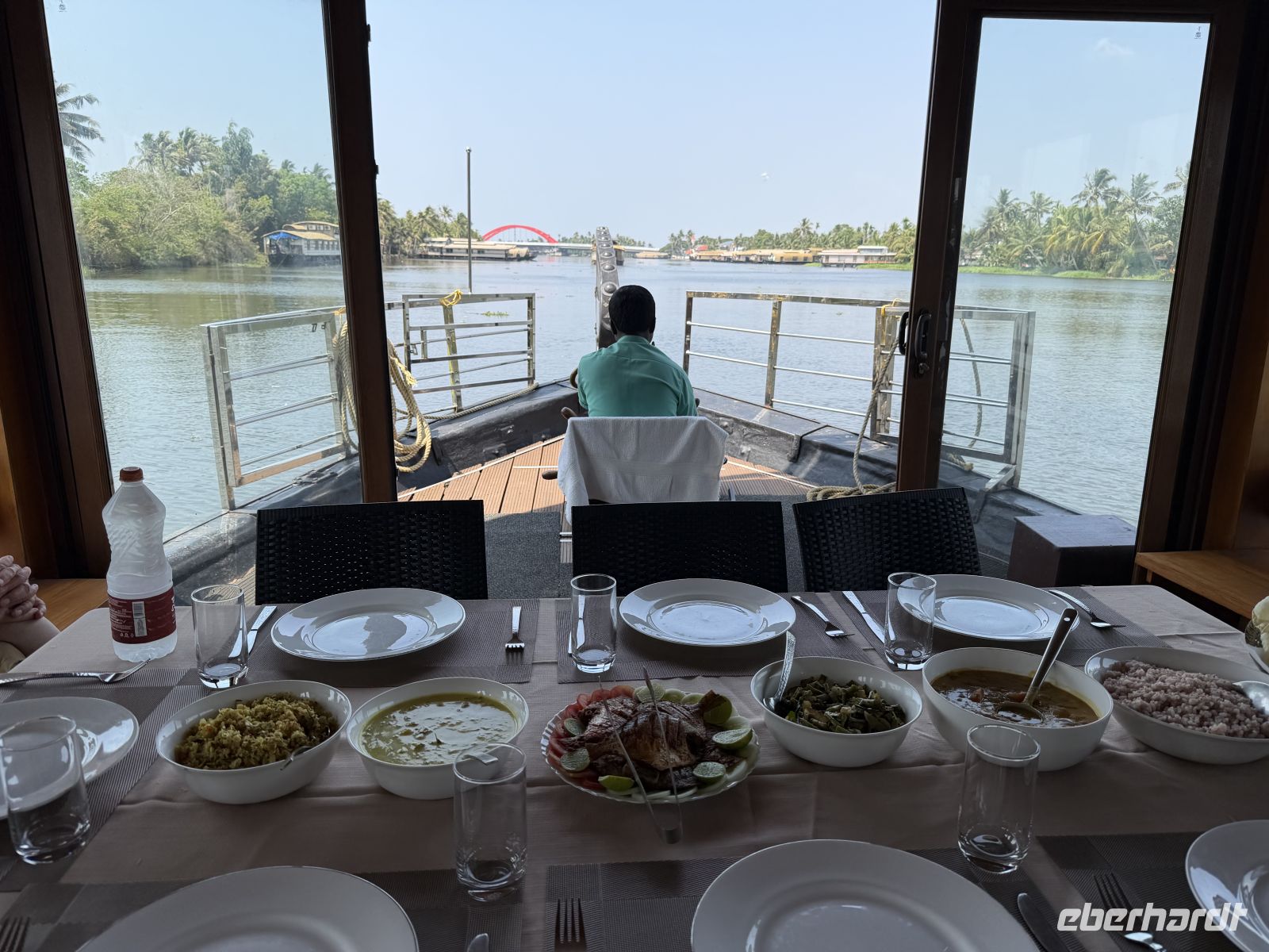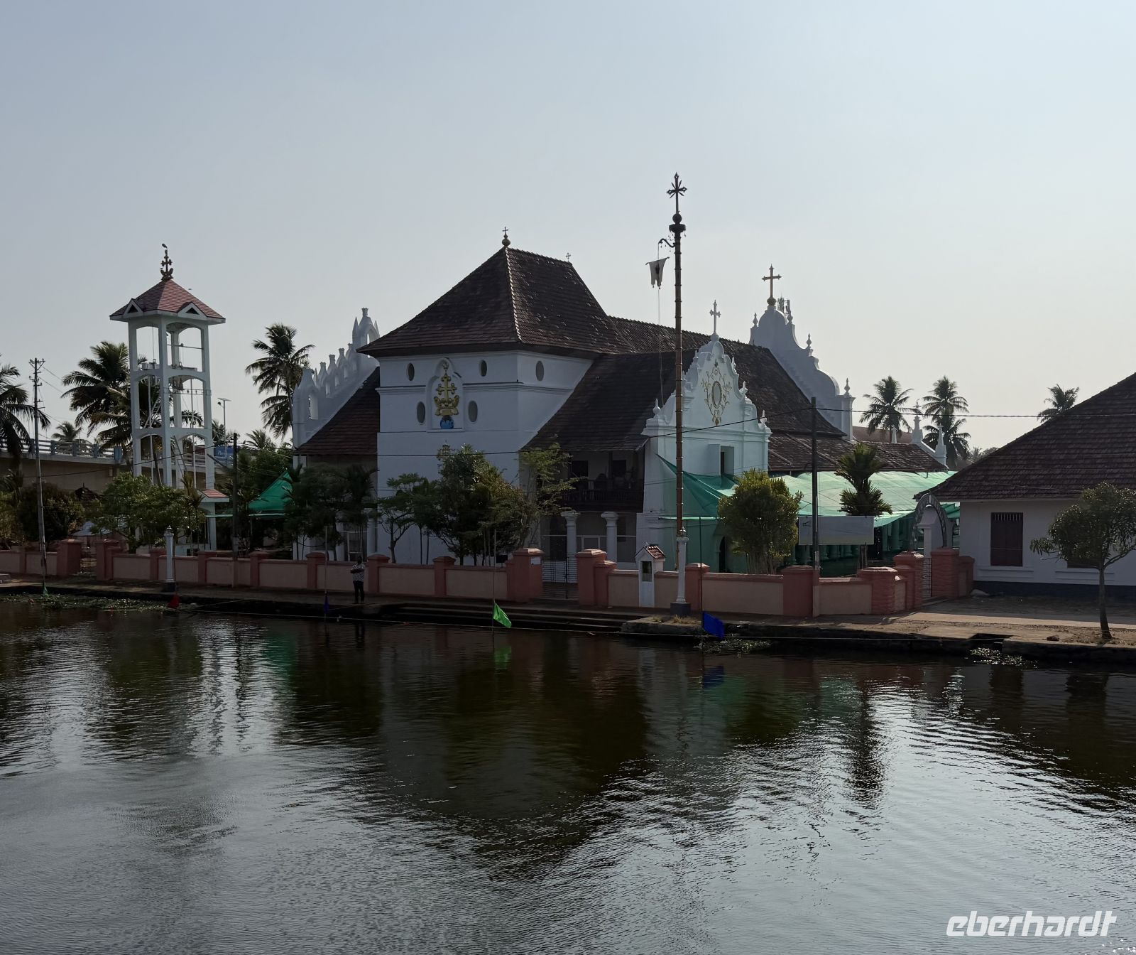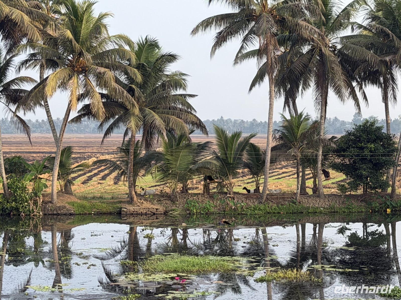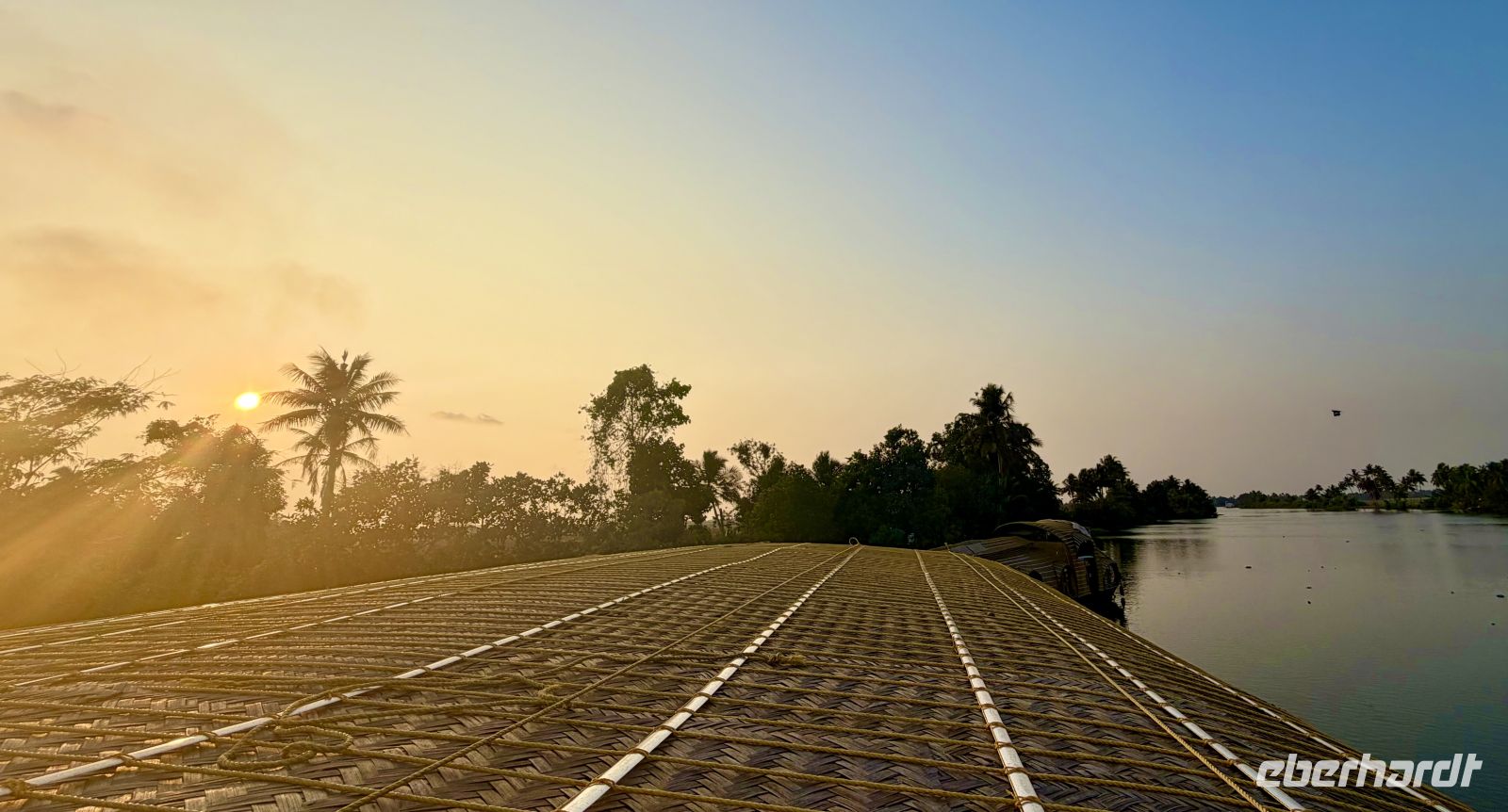 Aber erst besuchen wir eine Gewürzplantage mit Verkauf. Der Guide führt uns zu den verschiedenen Pflanzen und erklärt uns die Wirksamkeit, Wachstum, Blüte, Frucht und Ernten. Die Kardamom Pflanze blühte und die Kapseln konnten wir bereits erkennen. Einige Tüten der kostbaren Waren landeten in unseren Koffern. Serpentinen führen aus den Bergen mit ihren Malbari-Teeplantagen an die Küste des Arabischen Meeres. Die Backwaters in Kerala entstanden hauptsächlich durch natürliche geologische Prozesse, bei denen Wellen und Küstenströmungen des arabischen Meeres Sandbänke und Inseln bildeten. Diese Barrieren schnitten die Mündung von 44 Flüssen, die aus den Western Gathes fließen ab und schufen ein einzigartiges System aus Lagunen und Kanälen. Den Rest erledigten die Menschen und so entstand das Paradies für Mensch und Tier. Wir schiffen um 14:00 Uhr auf unseren Kettuvallams (Umgebaute Lastenboote) ein. 4 Kabinen sind unsere Unterkunft für die Fahrt auf den Kanälen der Backwaters. Es entschleunigt uns von den Anstrengungen der letzten Tage. Die Schiffsjungen bereiten uns ein einfaches und leckeres Mittagessen zu. Die Ruhe genießen wir auf dem Oberdeck. Das Boot gleitet über die ruhigen Gewässer und wir beobachten Tiere und das Ufer mit einfachen Behausungen zieht an uns vorbei. Frisch gebackene Bananenküchlein und Kaffee versüßen uns den Aufenthalt. Wir legen am Ufer des Hauptortes an und besuchen die St. Maria Basilica am Pamba River. Hier findet am heutigen Sonntag ein Gottesdienst statt. Viele Gläubige strömen in die alte Kirche (im Jahr 427 gegründet). Sie gehört zu den Thomaschristen-Kirchen und der Apostel Thomas soll sie selbst gegründet haben. Zahlreiche Felseninschriften und ein offenes Steinkreutz aus dem Jahr 1150 belegen diese Geschichte. Wir vertreten uns die Beine noch ein wenig und betreten das Boot zur Sonnenuntergangsfahrt Richtung Anker-Platz. Wasserhyazinthen schwimmen überall um uns herum. Das Boot wird mit einem dicken Stromkabel an Land angeschlossen und die Klimaanlage für die Nacht angeschaltet. Langsam geht die Sonne unter, wir bekommen unser Abendessen im „Bugrestaurant“ serviert und lassen den Tag gemütlich ausklingen.