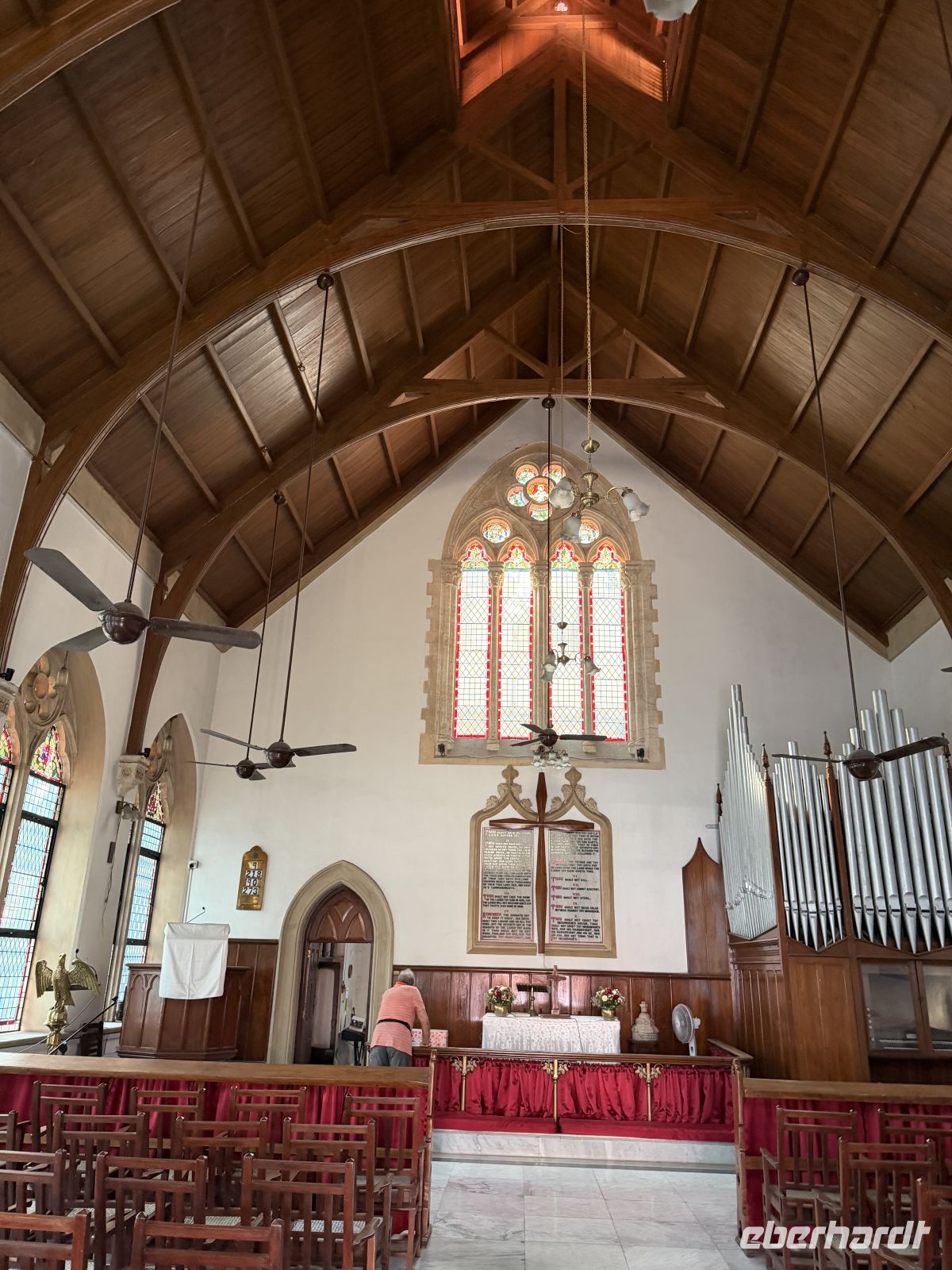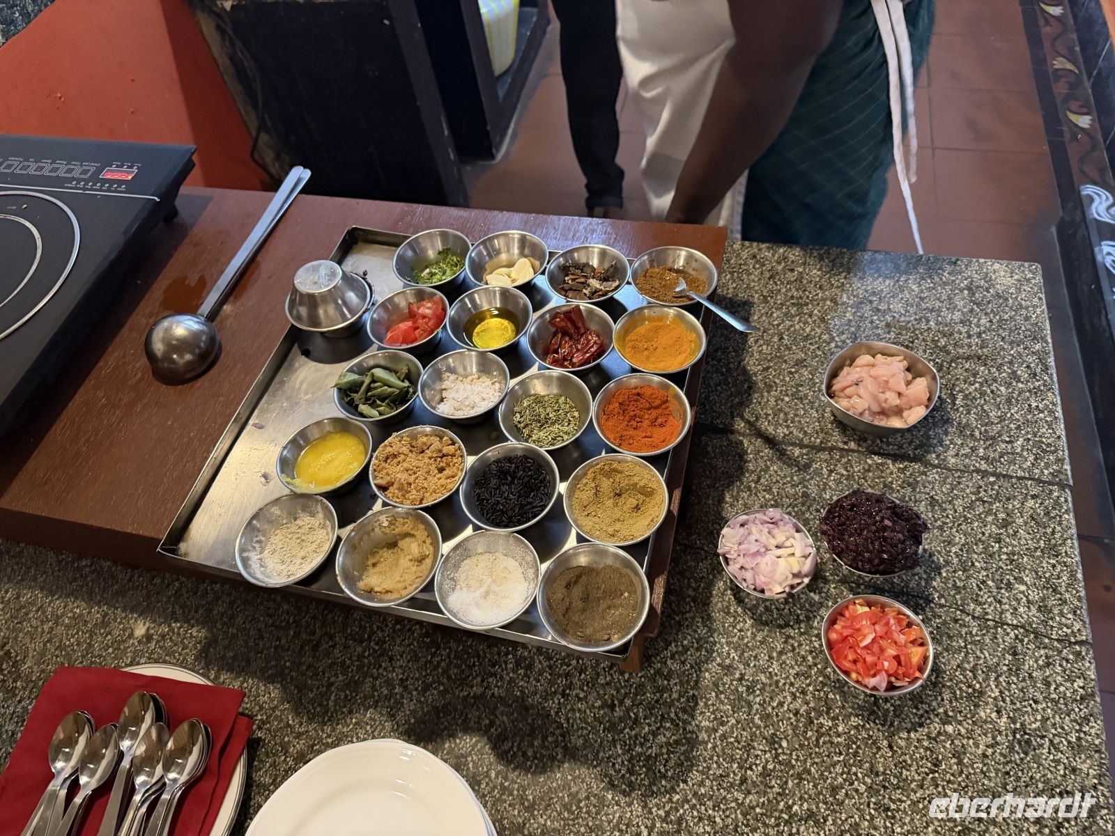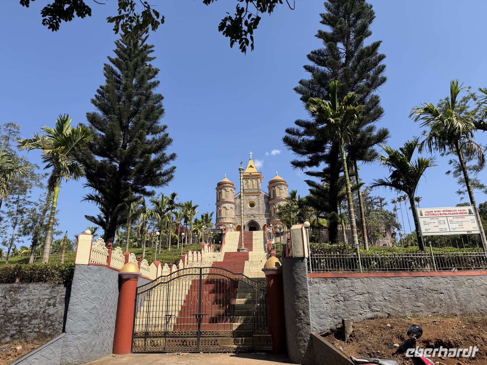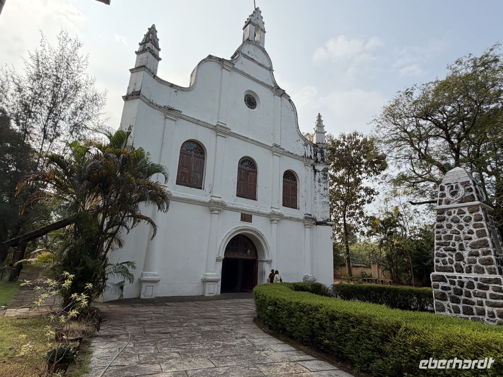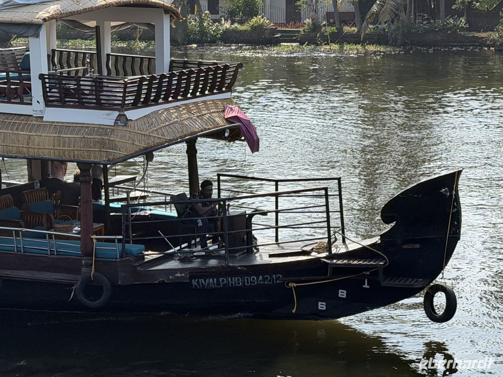 Aber erst besuchen wir eine Gewürzplantage mit Verkauf. Der Guide führt uns zu den verschiedenen Pflanzen und erklärt uns die Wirksamkeit, Wachstum, Blüte, Frucht und Ernten. Die Kardamom Pflanze blühte und die Kapseln konnten wir bereits erkennen. Einige Tüten der kostbaren Waren landeten in unseren Koffern. Serpentinen führen aus den Bergen mit ihren Malbari-Teeplantagen an die Küste des Arabischen Meeres. Die Backwaters in Kerala entstanden hauptsächlich durch natürliche geologische Prozesse, bei denen Wellen und Küstenströmungen des arabischen Meeres Sandbänke und Inseln bildeten. Diese Barrieren schnitten die Mündung von 44 Flüssen, die aus den Western Gathes fließen ab und schufen ein einzigartiges System aus Lagunen und Kanälen. Den Rest erledigten die Menschen und so entstand das Paradies für Mensch und Tier. Wir schiffen um 14:00 Uhr auf unseren Kettuvallams (Umgebaute Lastenboote) ein. 4 Kabinen sind unsere Unterkunft für die Fahrt auf den Kanälen der Backwaters. Es entschleunigt uns von den Anstrengungen der letzten Tage. Die Schiffsjungen bereiten uns ein einfaches und leckeres Mittagessen zu. Die Ruhe genießen wir auf dem Oberdeck. Das Boot gleitet über die ruhigen Gewässer und wir beobachten Tiere und das Ufer mit einfachen Behausungen zieht an uns vorbei. Frisch gebackene Bananenküchlein und Kaffee versüßen uns den Aufenthalt. Wir legen am Ufer des Hauptortes an und besuchen die St. Maria Basilica am Pamba River. Hier findet am heutigen Sonntag ein Gottesdienst statt. Viele Gläubige strömen in die alte Kirche (im Jahr 427 gegründet). Sie gehört zu den Thomaschristen-Kirchen und der Apostel Thomas soll sie selbst gegründet haben. Zahlreiche Felseninschriften und ein offenes Steinkreutz aus dem Jahr 1150 belegen diese Geschichte. Wir vertreten uns die Beine noch ein wenig und betreten das Boot zur Sonnenuntergangsfahrt Richtung Anker-Platz. Wasserhyazinthen schwimmen überall um uns herum. Das Boot wird mit einem dicken Stromkabel an Land angeschlossen und die Klimaanlage für die Nacht angeschaltet. Langsam geht die Sonne unter, wir bekommen unser Abendessen im „Bugrestaurant“ serviert und lassen den Tag gemütlich ausklingen.