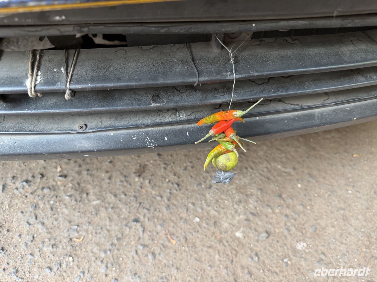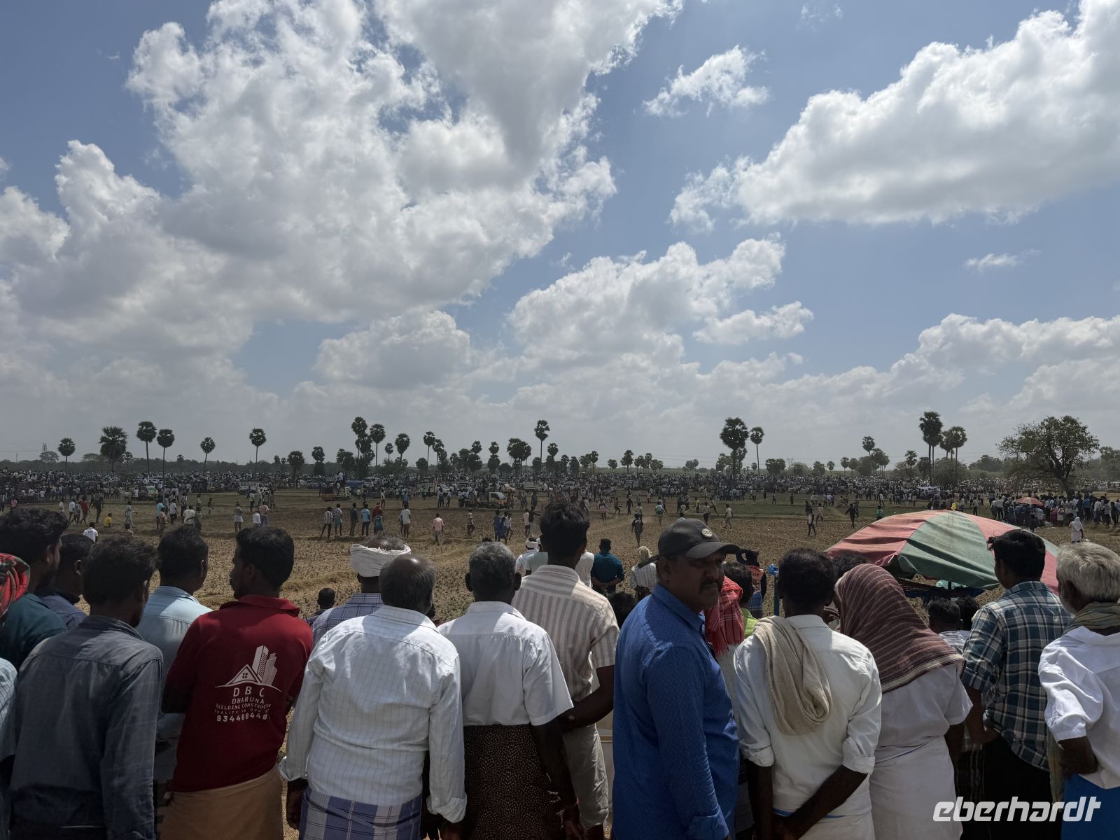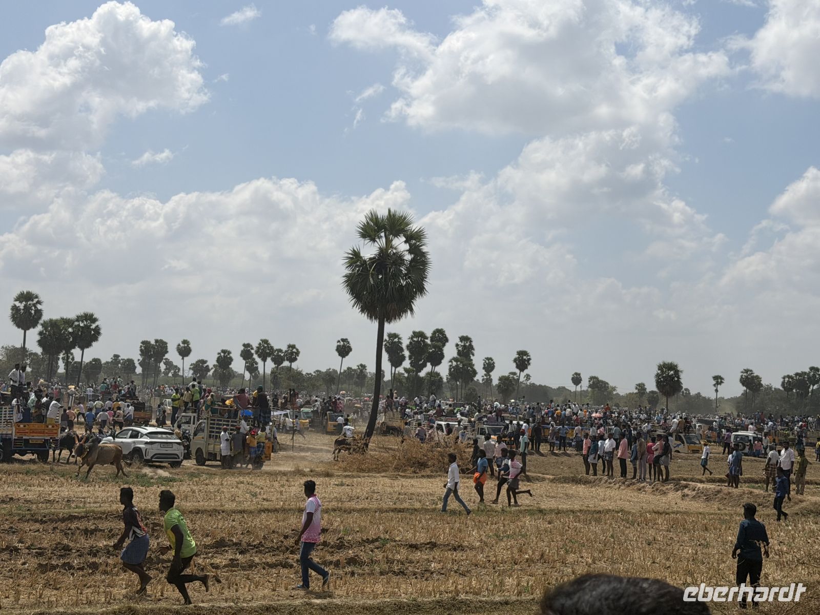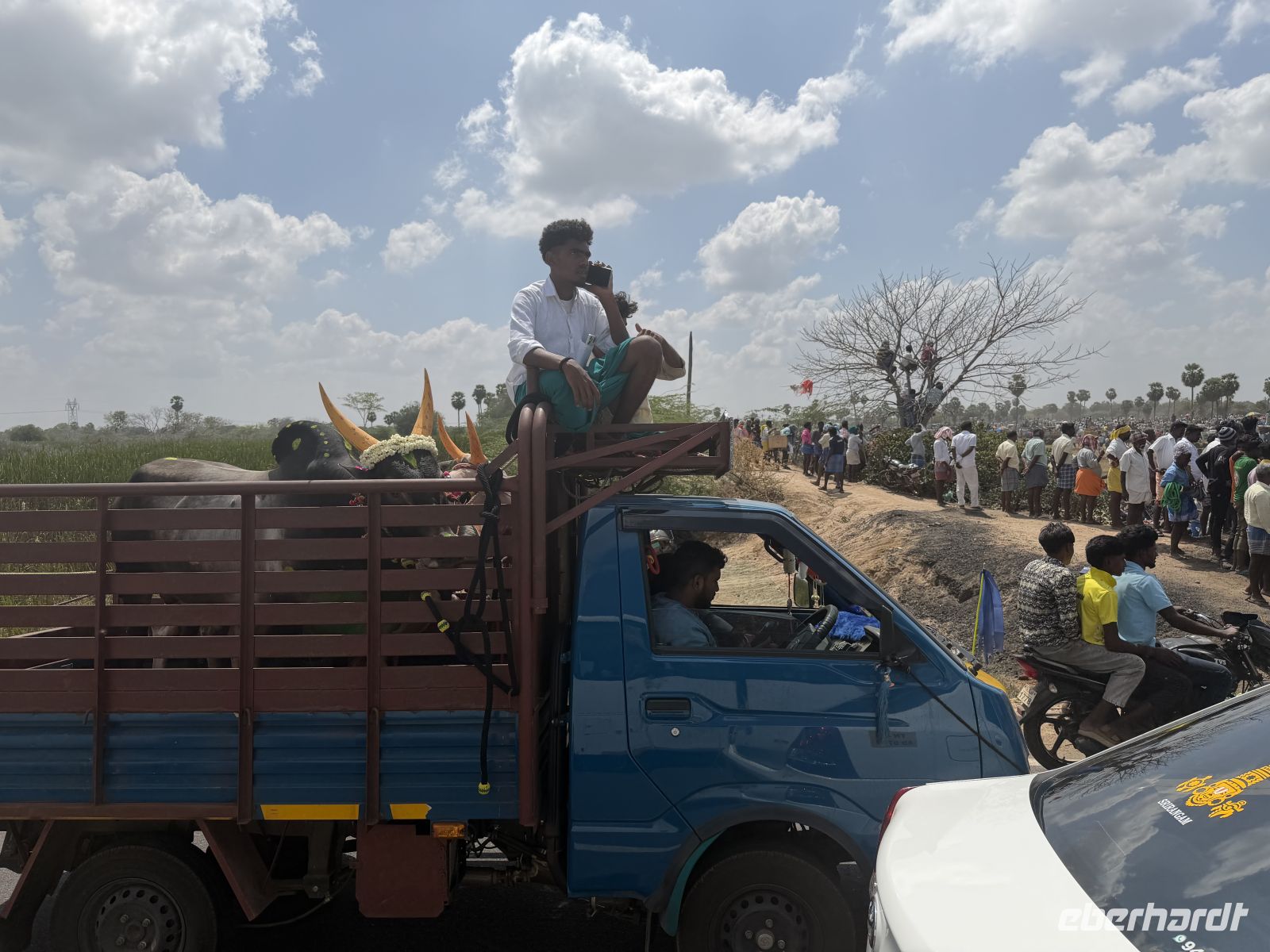 Am diesem Morgen spazieren wir erst einmal durch das Dorf. Es ist bereits heiß und wir erkennen schnell, dass der Ort um unser Hotel einmal sehr reich gewesen sein muss. Der Baustil verbunden mit der Lebensart ->Teakholz, Säulen aus Granit, Türmchen und geschwungene Linien hinterlassen ein reichhaltiges Kulturerbe. An den Wänden finden wir interessante Amulette, ein Stück Kohle, eine Zitrone und 7 Chillischoten aufgeschnürt. Sie sollen das Böse abhalten, vielleicht aber auch Insekten, denn für den Bösen Blick hängen Teufelsfratzen an den Türen. Unser Reiseleiter gibt uns wie jeden Morgen einen Überblick zu unserem bevorstehenden Programm. Es geht los Richtung Madurai. Gegen 11:00 Uhr auf der Autobahn 35 überholen uns viele Transporter mit Stieren auf der Ladefläche. Bunt bemalt und geschmückt, als sollten sie im Tempel einer Zeremonie beiwohnen. Plötzlich sehen wir 100derte von Männern am Straßenrand, auf Bäumen sitzend und auf einem großen Gelände stehen. Gejubel, wild gewordene Stiere rennen völlig panisch über das Gelände, Männer versuchen die Tiere wieder einzufangen, manches Tier schafft es zu entkommen, andere werden am Seil weggeführt. Dieses Fest heißt Jallikattu, ein traditionelles Stierbändigen nur in Tamil Nadu zu finden. Es war einmal verboten, wurde aber wieder aktiviert, da die Tradition während des Pongal Festes tief verwurzelt ist. Männer tragen den Sport aus, um Mut und Stärke zu beweisen, indem sie sich an den Buckel des Bullen hängen, 15-20 Meter und/oder drei Sprünge aushalten. Sicherlich nichts für Tierliebhaben und auch kritisch zu beäugen aus der Sicht von uns.