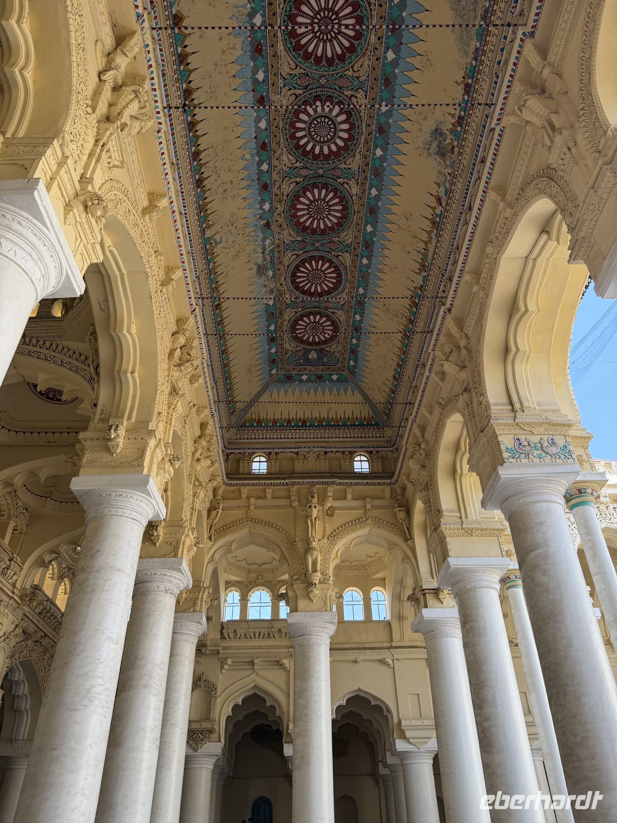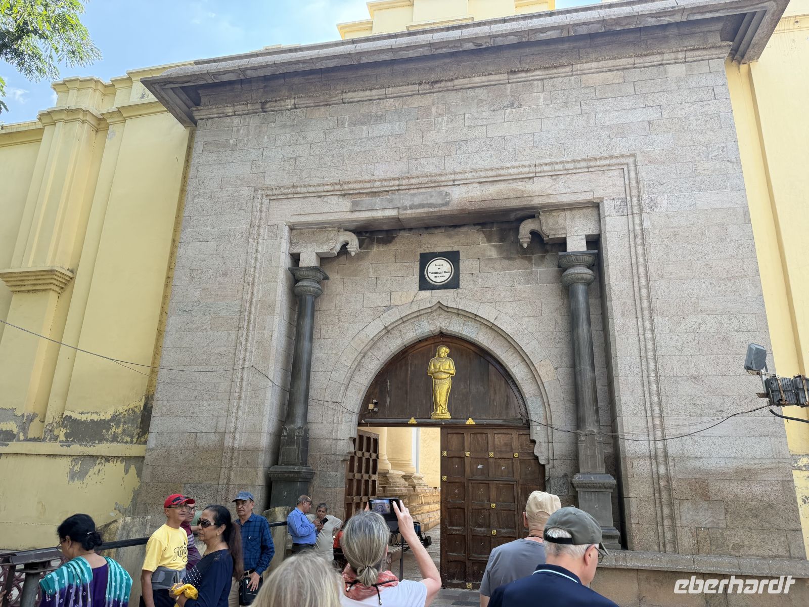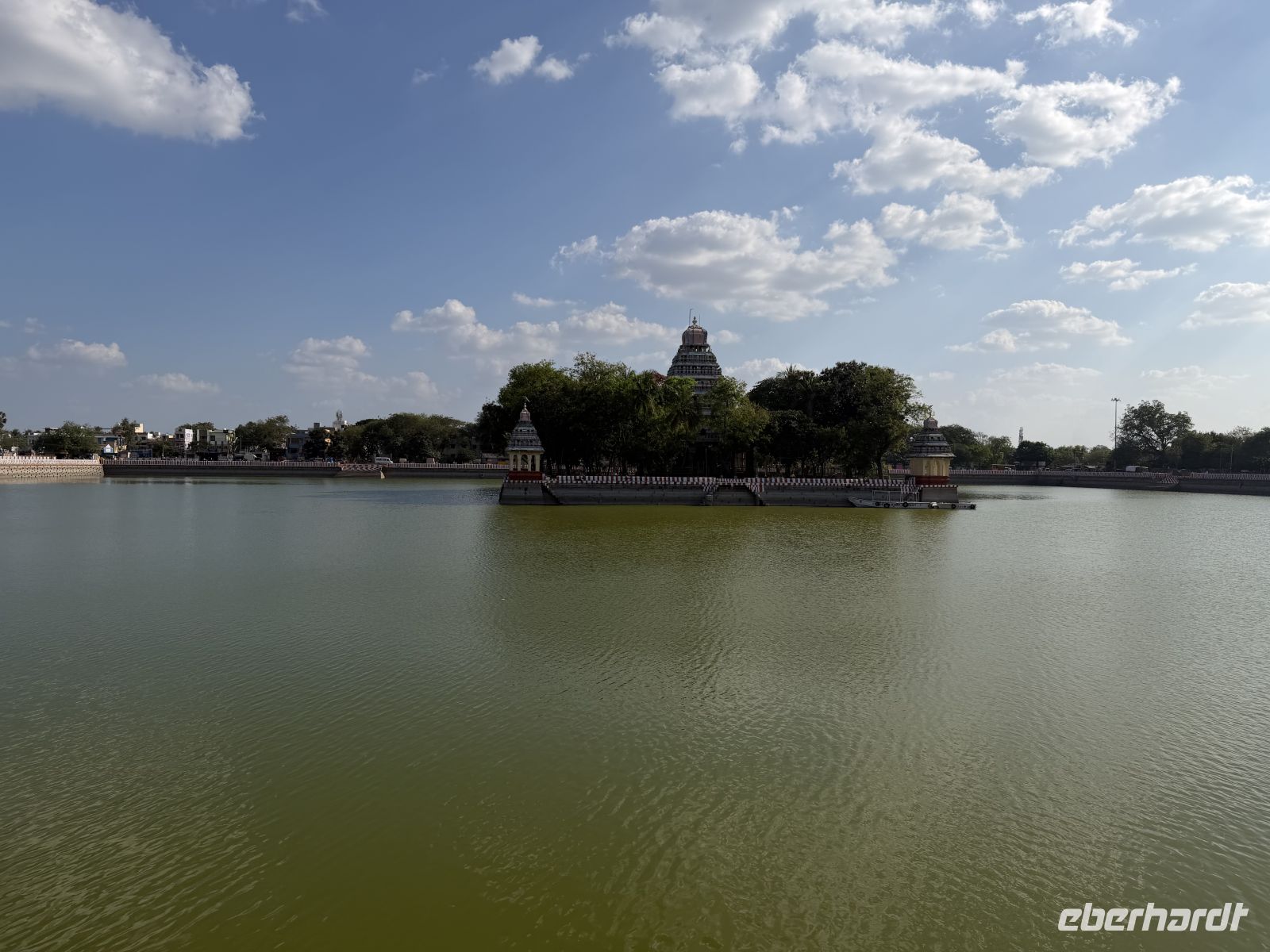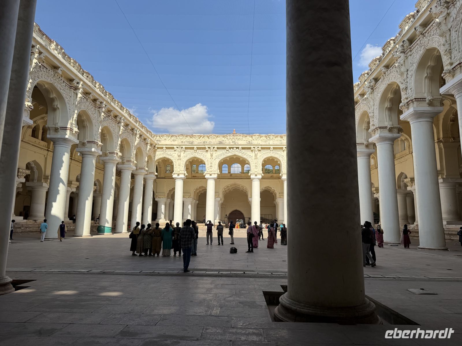 Langsam fahren wir weiter, kurz nach Mittag checken wir in Madurai ein, machen uns frisch und besuchen den Thirumalai Nayakkar Palast. Der Palast war einst 4x größer als heute. Teile wurden im 18. Jh. abgetragen, um einen anderen Palast zu bauen. Unter britischer Herrschaft diente der Palast als Militärlager, Fabrik und Gerichtsgebäude. Erst große Restaurierungsarbeiten Ende des 19.Jh. und später im 20/21. Jh. machten die kulturelle Verschmelzung der dravidischen, islamischen und europäischen Architektur wieder sichtbar. Wir sehen den Hauptsaal, Tanzhalle (Natakasala) mit Stuckarbeiten und riesigen weißen Säulen 20 m hoch und 4 m Umfang verbunden durch hohe dekorative Bögen. Nicht weit vom Palast mache wir einen Fotostopp an der Zisterne und spazieren anschließend durch die Altstadt zum Nord Gopuram des Sri Meenakshi Tempel. Hier erwartet uns ein komplett in Bambus eingerüsteter Turm. Er wird restauriert. Kaum erkennt man die Arbeiter, die fleißig die Figuren neu mit Farbe ausschmücken. Im Tempel ist das Fotografieren nicht erlaubt. Im Herzen der Altstadt ist der mystische Ort der Hochzeit der Meenakshi (Parvati) und Sundareswarar (Shiva) geweiht. Täglich werden Zeremonien abgehalten und viele Menschen besuchen den Komplex mit 12 Türmen und über 33.000 Skulpturen täglich. Wir erleben eines dieser Rituale mit. Meenakshi ist die Gottheit mit 3 Brüsten, nach der Hochzeit verschwindet eine wieder, da der rechte Mann gefunden ist. Zahlreiche Mandapams (Säulenhallen) wie die berühmte 1.000 Säulen Halle liegen um die 2 heiligsten Bereiche. Jede der Säulen hat andere Figuren und klingen beim Anschlagen. Wir machen am heiligen goldenen Lotus Teich eine Pause und lassen die Umgebung auf uns wirken.