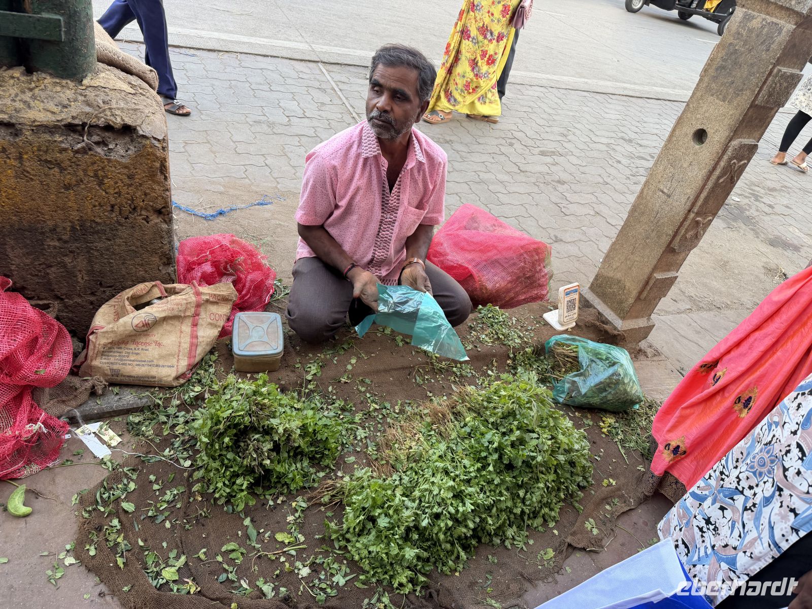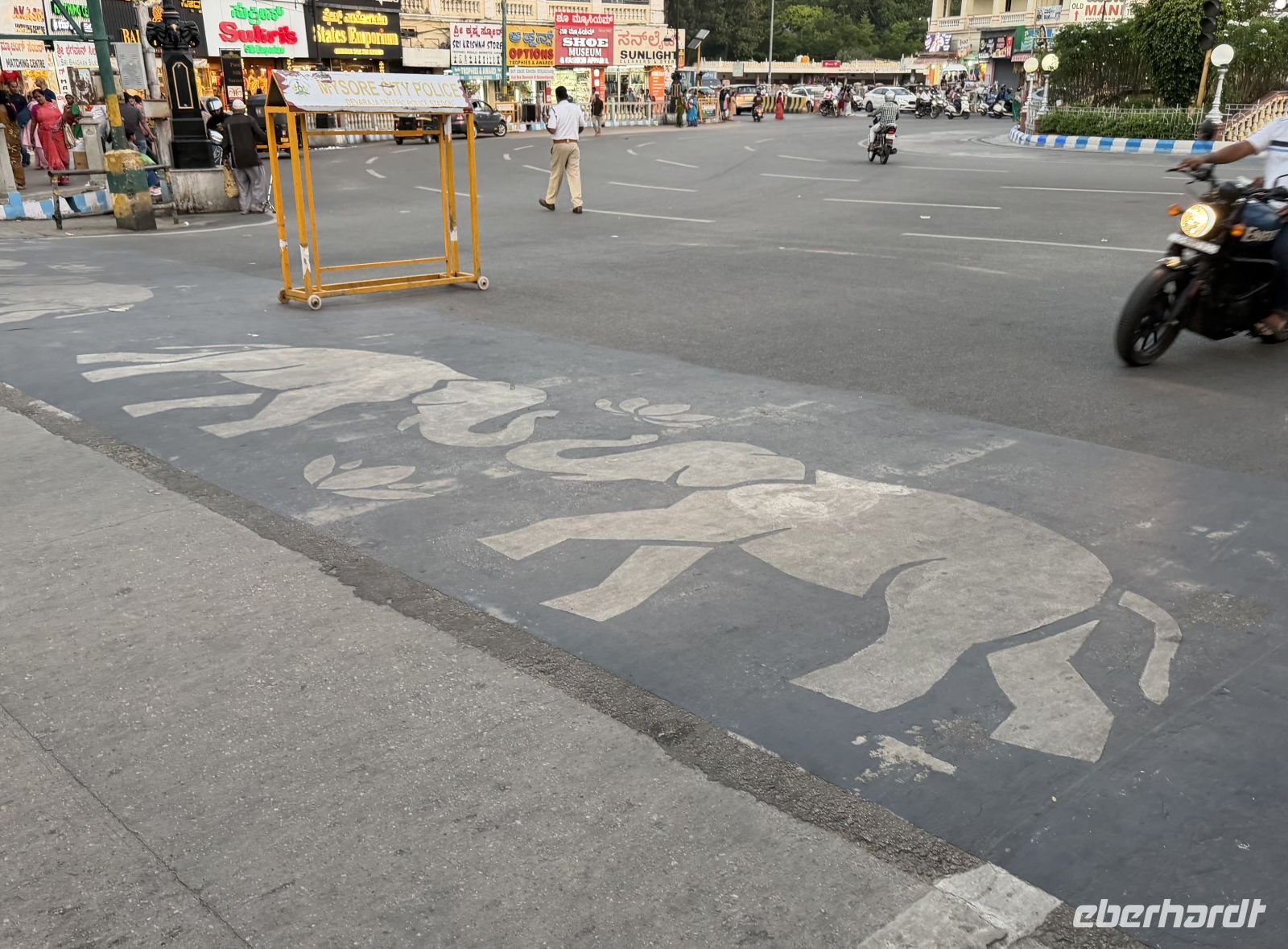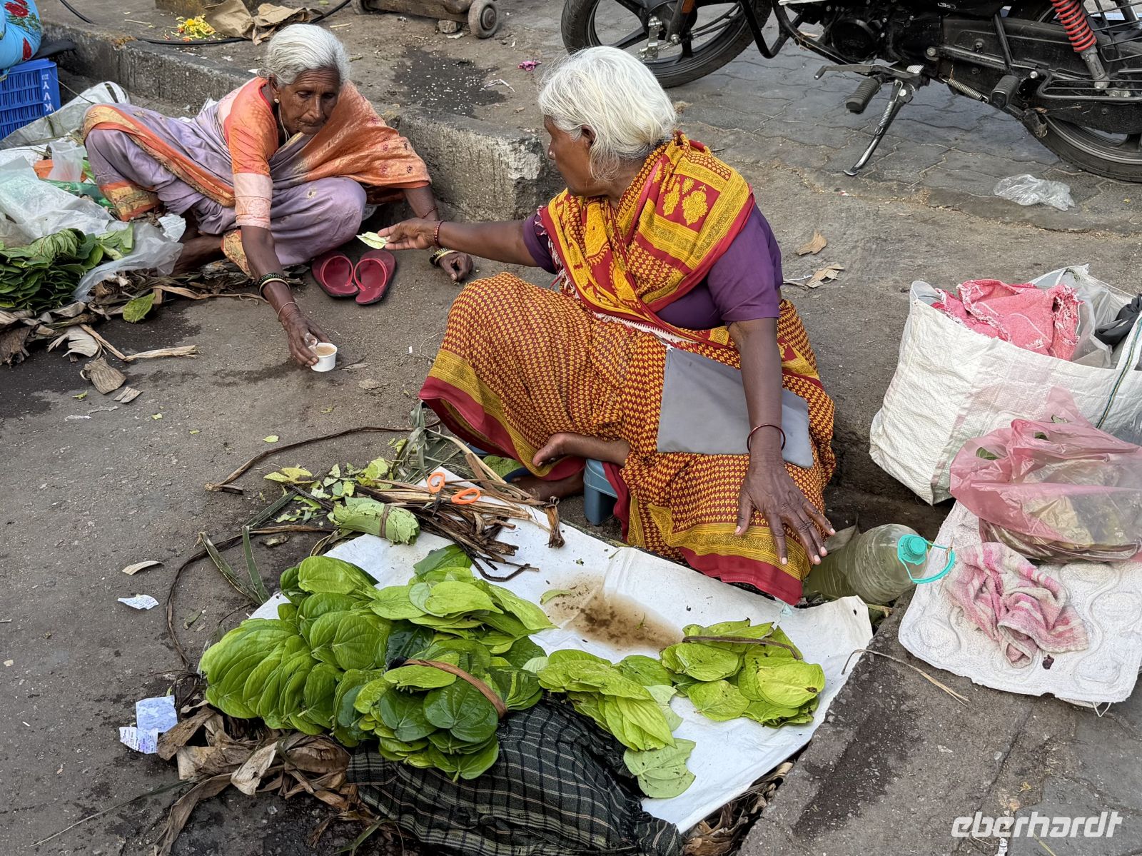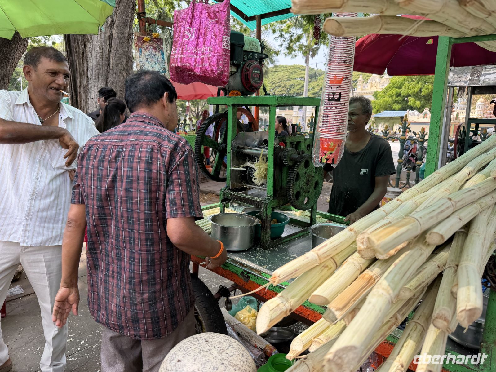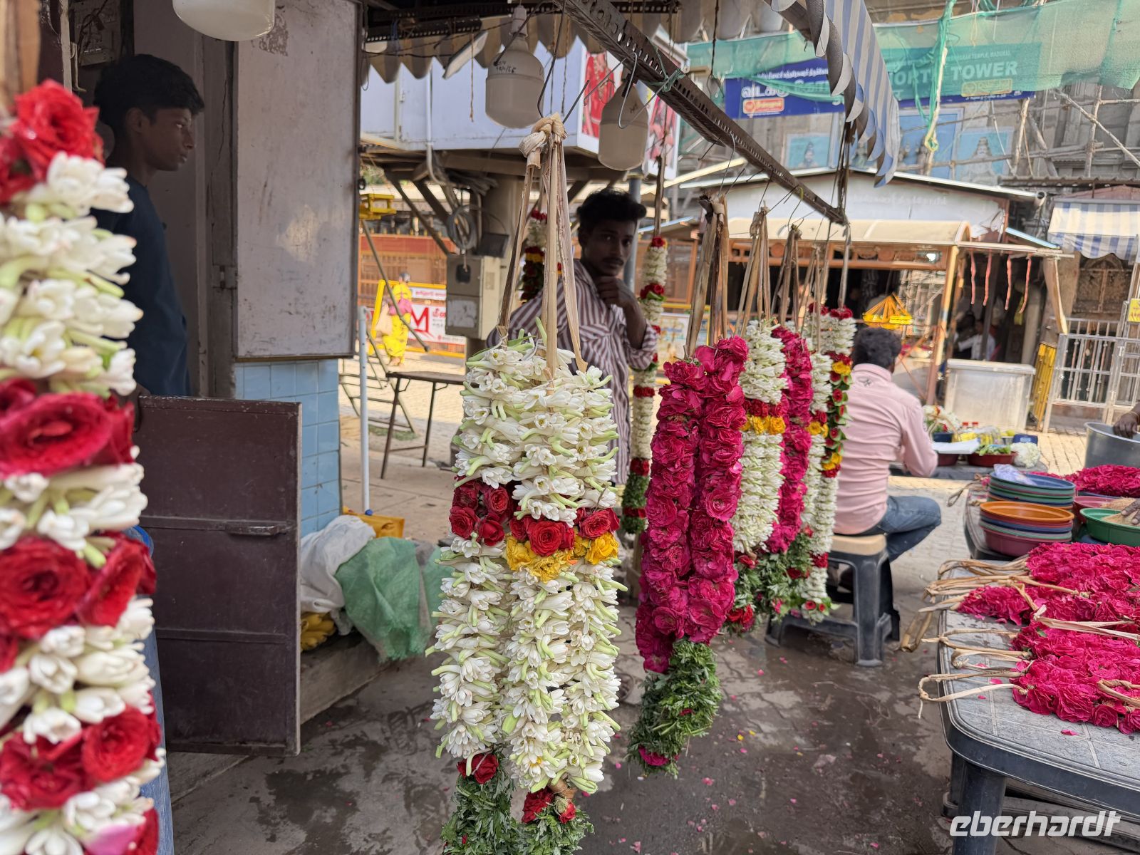Eine Pause im Hotel tut nun gut, doch am Spätnachmittag machen wir uns auf zum Devaraja Markt. Der Historische Markt ist um diese Zeit gut besucht. Kühe fressen Gemüsereste am Rande des Geschehens. Wir steuern erst mal den beliebtesten Stand des Marktes an. Guru Sweets und Verkosten eine Süßigkeit mit Kaffeegeschmack. Es ist nicht so süß, wie erwartet. Jetzt gehen wir in die schmalen Verkaufsstraßen des Marktes und schauen uns die Farben Pracht und die Vielfalt der Auslagen an. Immer wieder fragen wir uns, wer kauft all diese vielen Blumengirlanden, denn lange frisch bleiben werden sie nicht!? Wir verabreden eine Zeit und jeder schaut dort, wo er möchte. Den Markt verlassen wir über einen Elefanten-(Zebra)-Streifen. Der Bus holt uns ab und wir genießen als letzte Tat des Tages unser leckeres Abendessen im Hotel.