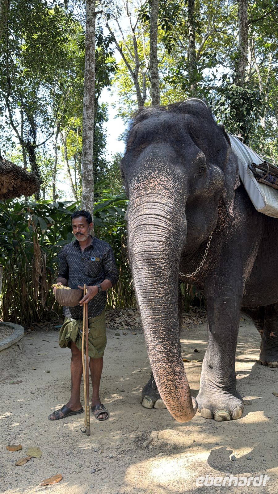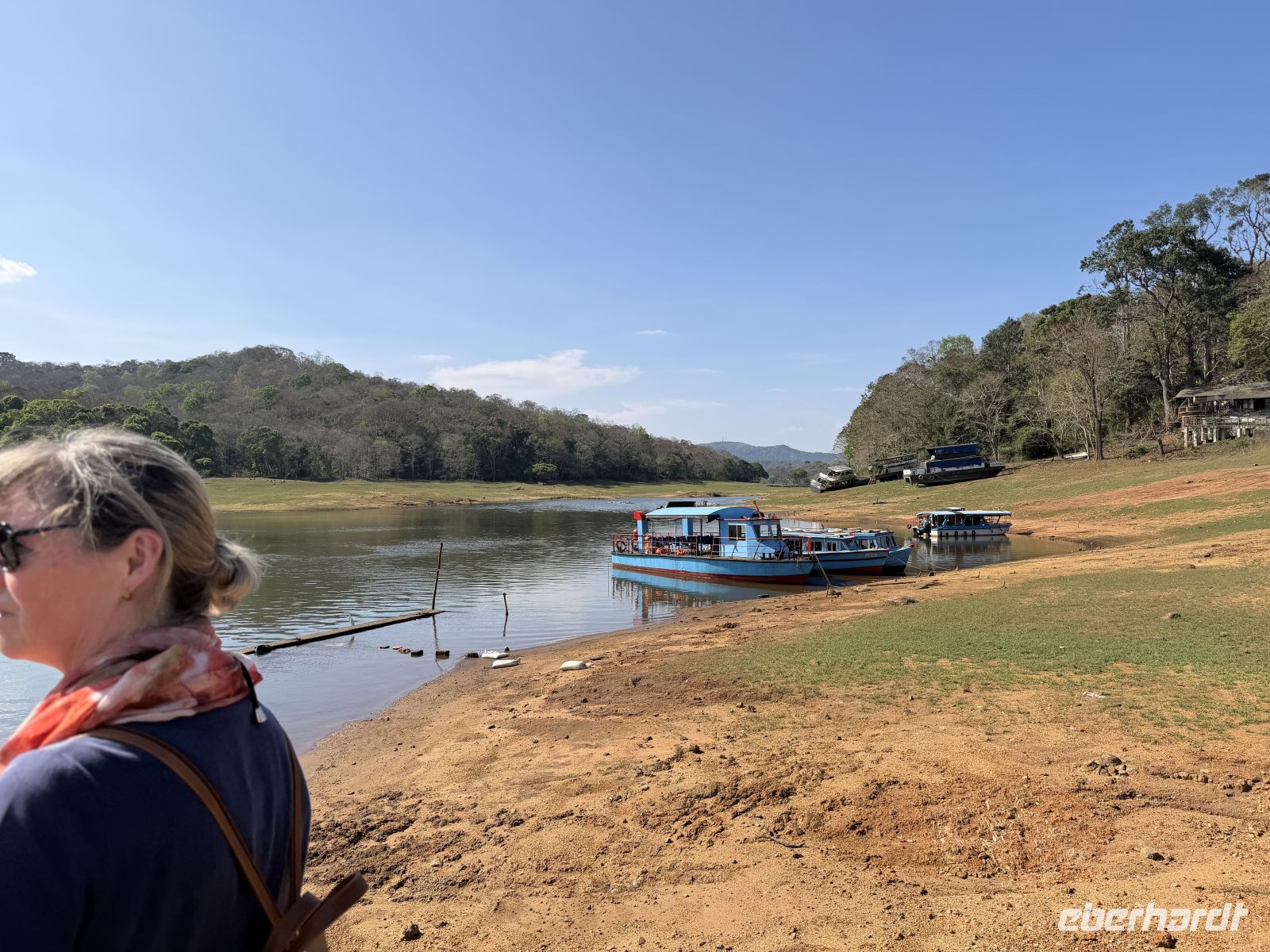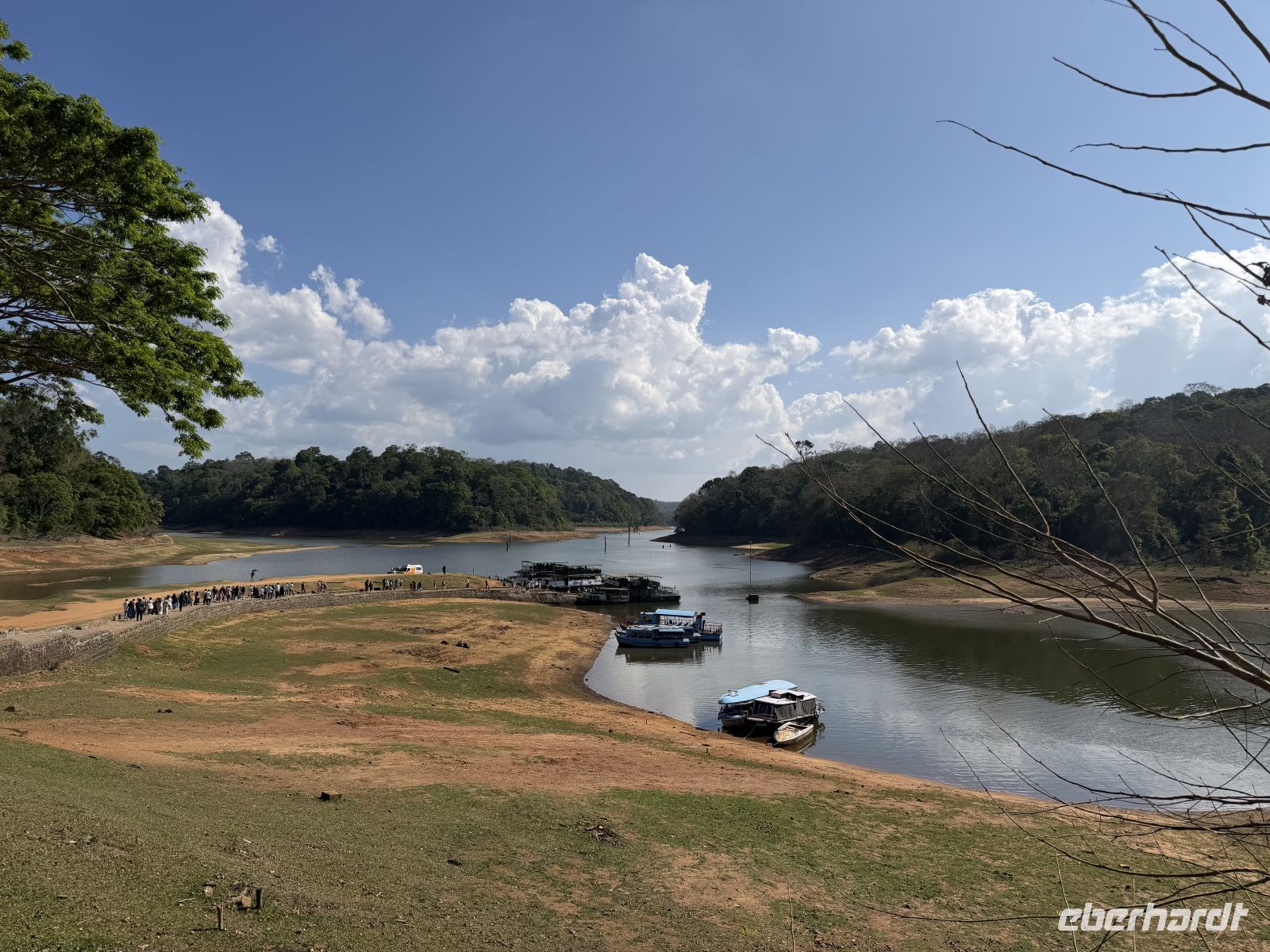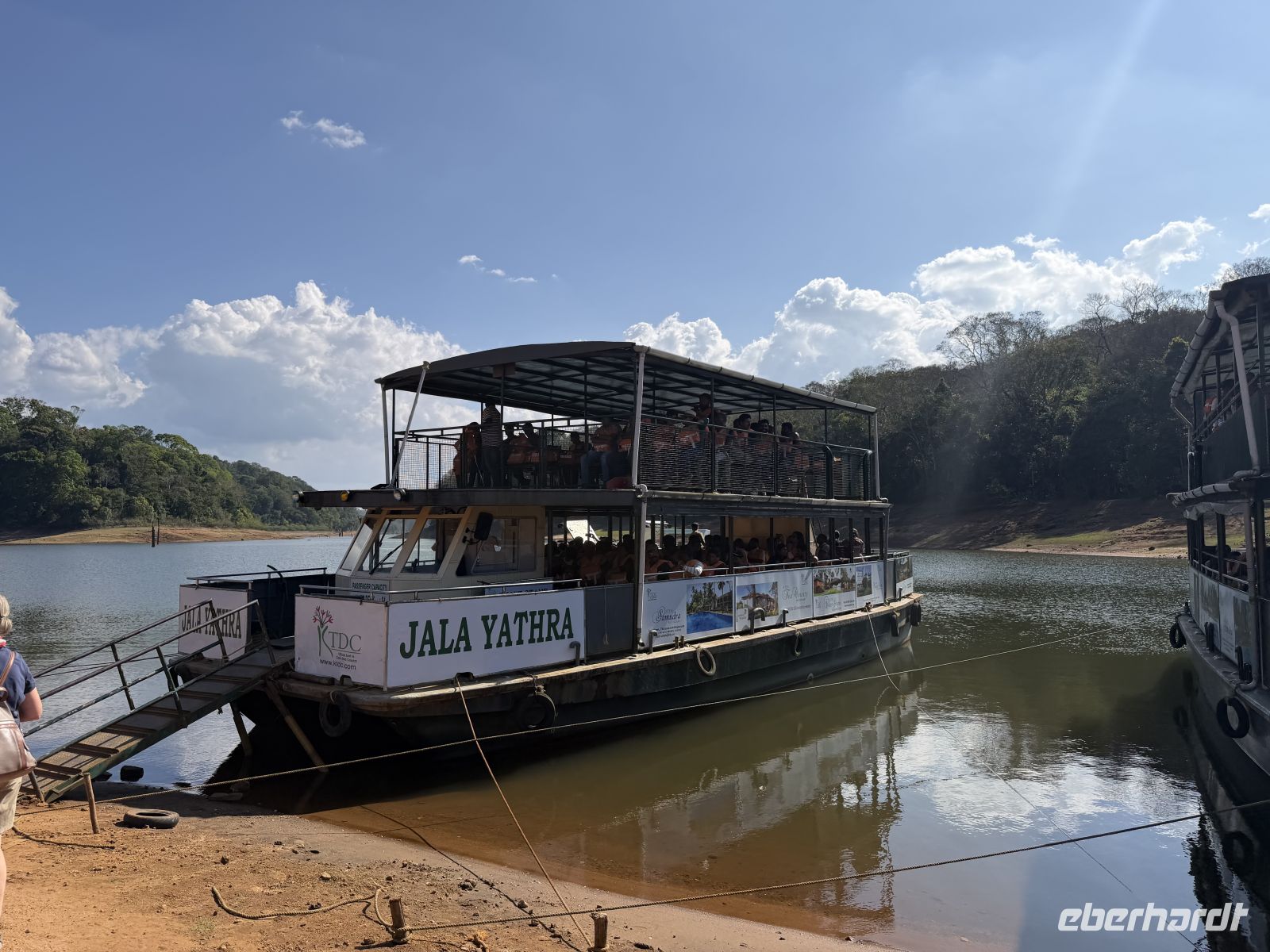 Berge, wir fahren in die Berge! Die Western Gaths ist eine Gebirgskette an der Westküste Indiens und vor Millionen von Jahren durch das Abspalten von Gondwana-Superkontinent entstanden. Unser Ziel ist der Periyar Wildlife Park in den Kardamom Hills mit seinem künstlich angelegten See durch die Briten 1895 als Wasserreservat. Heute leben viele geschützte Wildtiere dort auf 777 qkm. Die Fahrt ist lang und wir verlassen Tamil Nadu und begrüßen Kerala. Erst haben einige von uns eine Elefanten Tour gebucht. Wir fahren mit dem Jeep zur Elefant Junction. Meenakshi heißt die große 22-jährige Elefantendame, die uns auf ihrem Rücken durch die Station trägt. Zur Belohnung bekommt sie nachher Bananen von uns zugesteckt. Ruhig und gelassen darf sie nach unserem Ritt in die Pause gehen. Wir haben allerdings nun noch den Termin im Park zur Bootsfahrt. Mit dem Sammelbus geht’s zum Anleger. Wir haben feste Plätze auf dem Boot und zeihen brav die Schwimmwesten an. Die Boote legen ab und gleiten über den See. Rechts und links erblicken wir Hirche, wild Rinder, verschiedenste Vogelarten und da, ein Elefantenbulle, weitere Tiere und weitere Elefanten. Die Ranger machen mit ihren Ferngläsern wunderbare Fotos mit unseren Kameras. Zufrieden mit den Beobachtungen fahren wir nach 1,5 Stunden wieder ins Hotel. Im Nachgang, unser bestes Hotel, superfreundliches Personal, Top Buffet und freche Affen, die uns ein lächeln ins Gesicht zaubern.