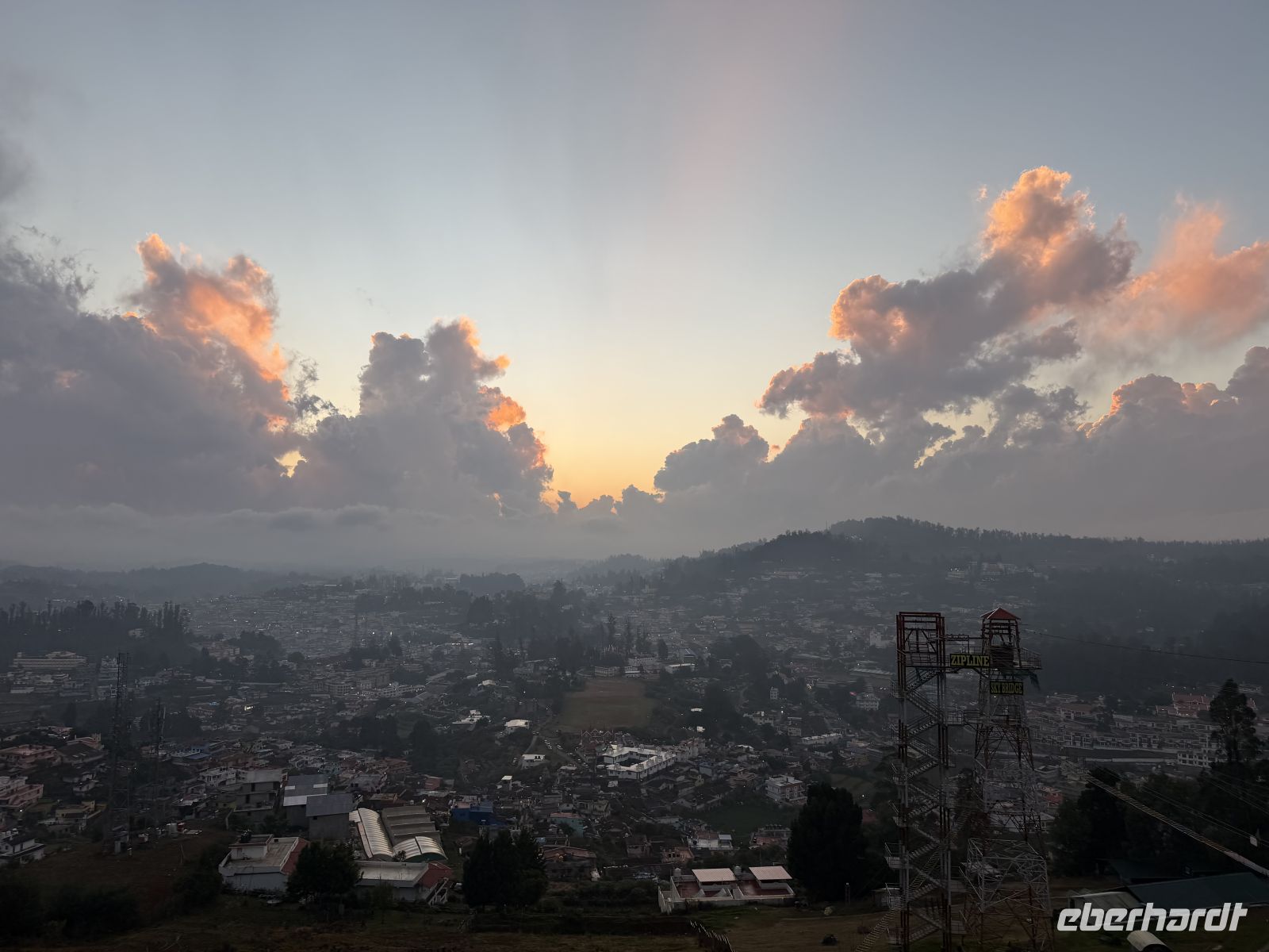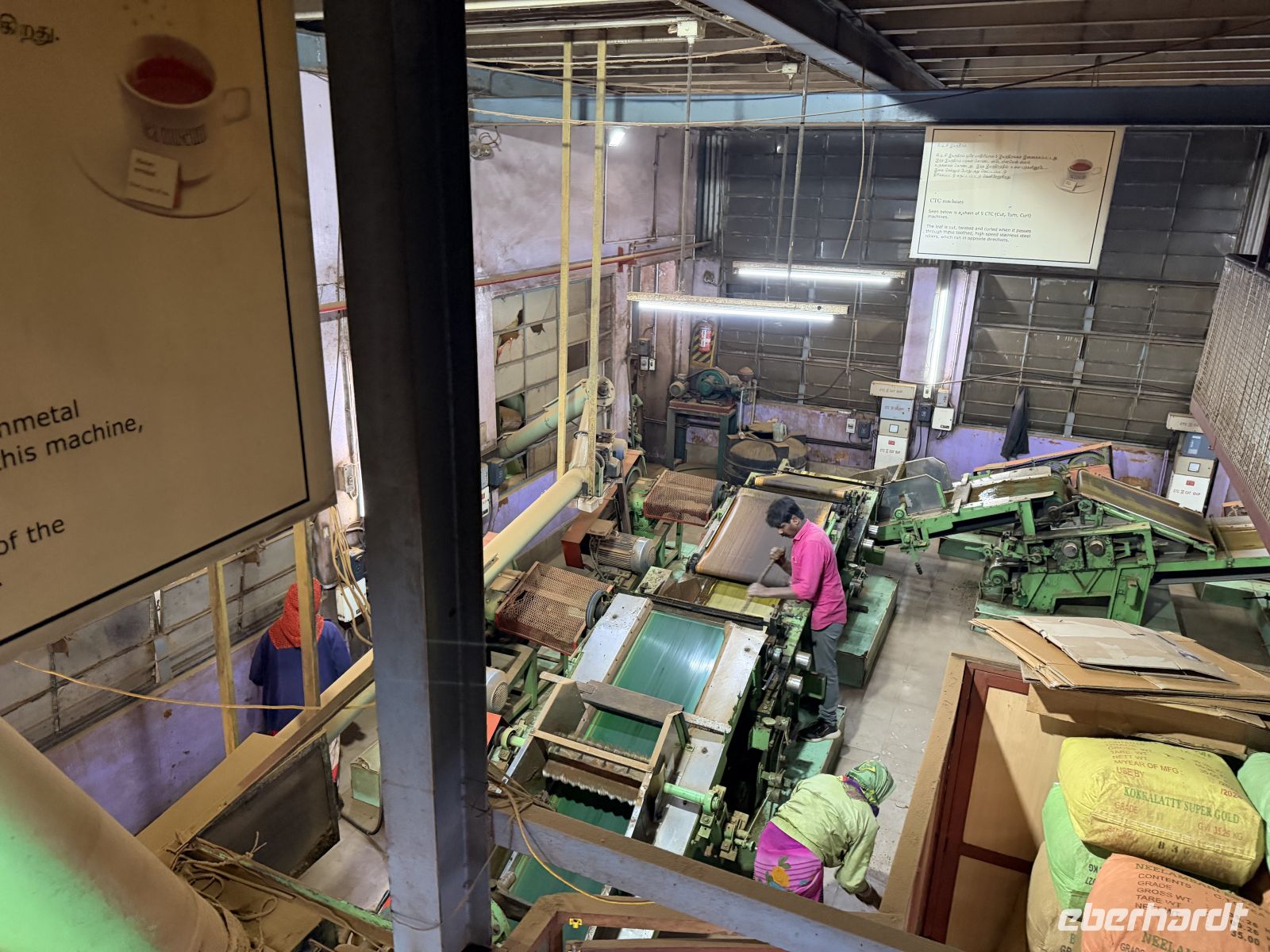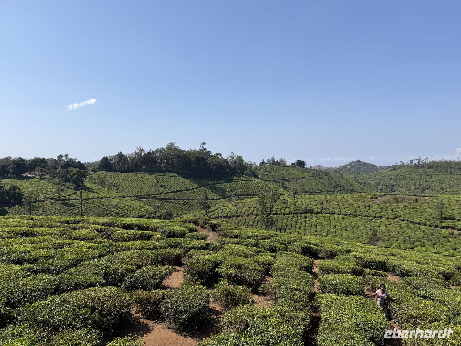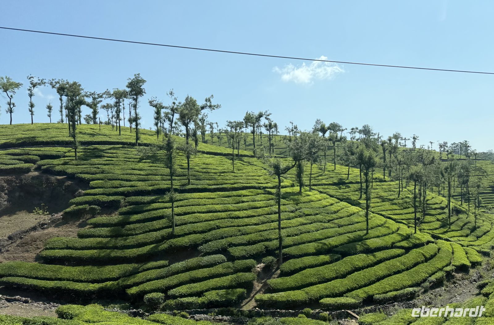 275 km ist die Tagesstrecke nach Ooty heute lang. 7 Stunden wird es wohl dauern. Uns wird noch einmal bewusst, als wir über viele Brücken Kochi verlassen, wie zerklüftet die Hafenregion ist. Bhawani erzählt uns, wie der indische Verkehr rollt und welche Regeln es eigentlich gibt. Prompt wird unser Bus von der Polizei angehalten. Der Fahrer wird kontrolliert. Es geht ohne Beanstandung weiter. Wir sehen, viele Baustellen im Land rund um den Straßenbau. Hier kann man den Aufschwung in Indien deutlicher nicht merken. Nach kurzen Pausen unterwegs, geht es endlich in die Nilgiri Berge. Wir sind erstaunt, dass Plastikflaschen verboten sind. Alle unsere Vorräte werden unsichtbar, da die Kontrolleure schauen. Teeplantagen gibt es auch hier an den Hängen. Die Gegend ist für ihre Schokolade bekannt. Bei einer Pause kaufe ich gleich mal eine Kostprobe für alle. Es wird bereits dunkel, als wir Ooty erreichen. Die Teeproduktion wollen wir aber trotzdem noch sehen. Über schmale Gerüste werden wir zu den einzelnen Herstellungsprozessen geführt. Bhawani erklärt die Schritte bis zur fertigen Tasse Tee. Nah klar kaufen wir für daheim Marsalla Chai oder White Tips. Das La Montana Hotel liegt gediegen an einem Hang mit einer großartigen Aussicht auf das Tal und die Stadt Ooty. Wir sind hungrig und marschieren auch zügig nach dem Check-in zum Restaurant. Hier gibt es keine alkoholischen Getränke, denn dafür benötigen Restaurants in Indien eine Lizenz. Müde von der langen Fahrt fallen wir auch bald schon in unsere Betten.