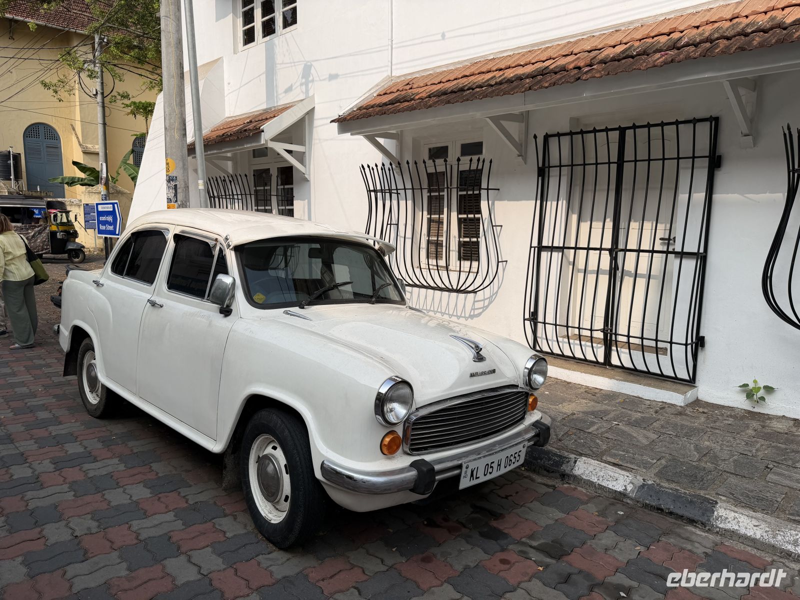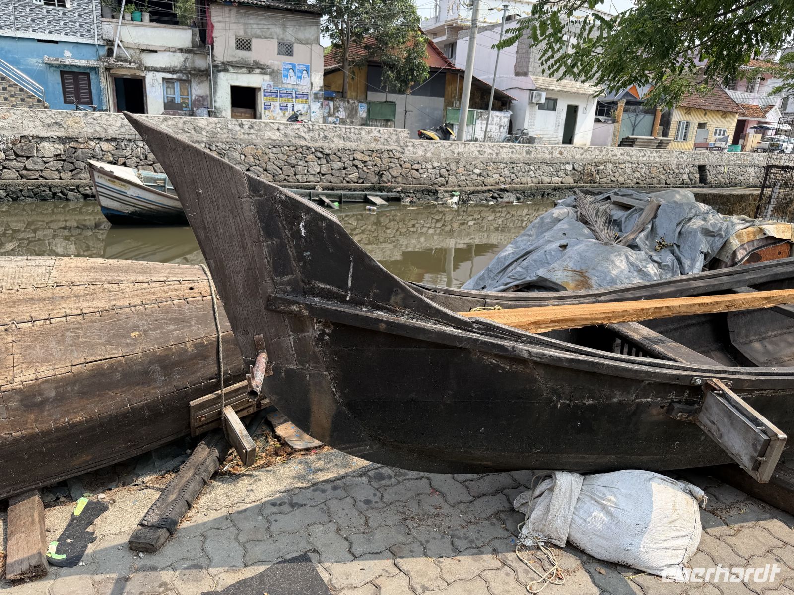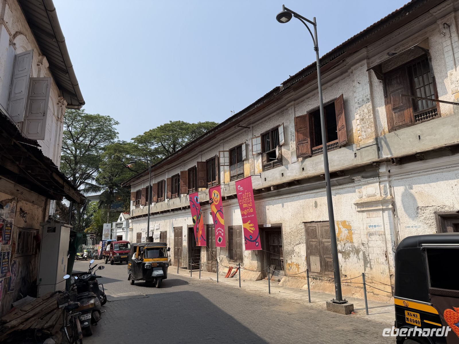 Das Boot legt schon wieder ab als wir am Morgen aufwachten. Das Frühstück wird serviert und wir packen schon wieder die Koffer als das Boot Richtung Alleppey unterwegs ist. Es geht durch schmale idyllische Wassergräben. Die Vögel sind schon aktiv und Menschen am Ufer gehen bereits ihren Beschäftigungen nach. Ein Junge sitzt am Ufer und putzt sich die Zähne. Grinst und grüßt! Das Wasser spielt eine Zentrale Rolle in dieser Gegend. Das Land ist fruchtbar und überall grünt und blüht es. Als wir uns dem Vembandad See nähern, beginnt das Elefanten Rennen der Boote. Von überall strömen die kleinen schwimmenden Hotels Richtung Hafen. Die Gäste werden in Zubringerboote umgeladen und am Hafen wieder dem Landgang überlassen. Bhawani wartet bereits mit unseren Busfahrern auf uns. Wir fahren nach Cochin. Unsere Zimmer im Hotel sind fast fertig und wir beziehen die Unterkunft schon mal bevor wir zu einem Spaziergang im östlichen Viertel aufbrechen. Die Hafenstadt besteht aus mehreren Halbinseln und Inseln. Die Portugiesen, dann die Holländer und schließlich die Briten drückten der Stadt ihren Stempel auf. Wir laufen durch die Gassen der Wohnviertel zur Bazaar Road. Hier werden und wurden die Gewürze und Handelswaren verkauft. Autos und Handkarren versperren die Straße. Wir schauen in die offenen Läden herein und besuchen eine Bilderausstellung der Biennale Kochi an, die zZ in vielen kleinen Ausstellungsräumen stattfindet. Ein Blick in die Bucht mit ihren bunten Schiffen, aber auch die Kanäle mit stinkenden Abwässern gehören zum Bild.