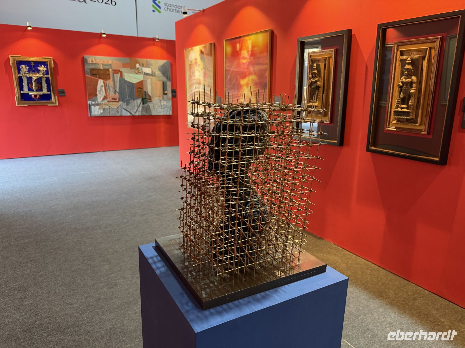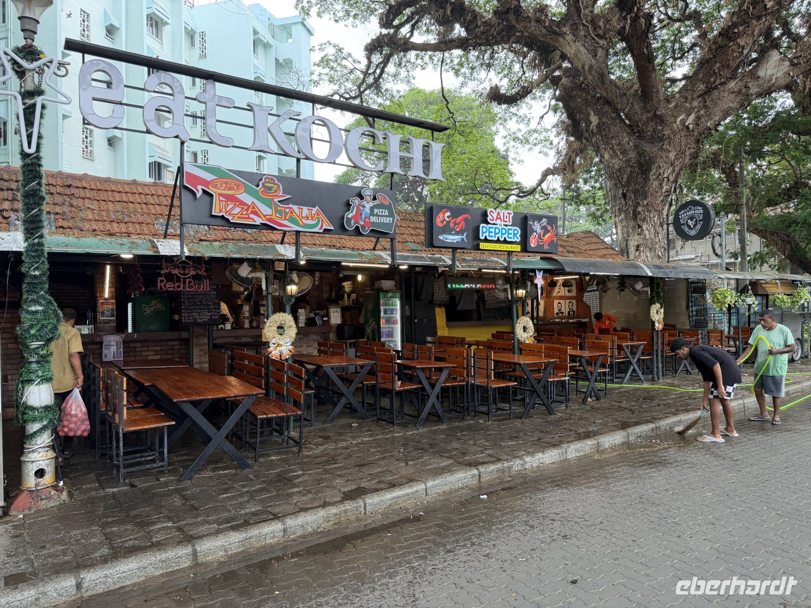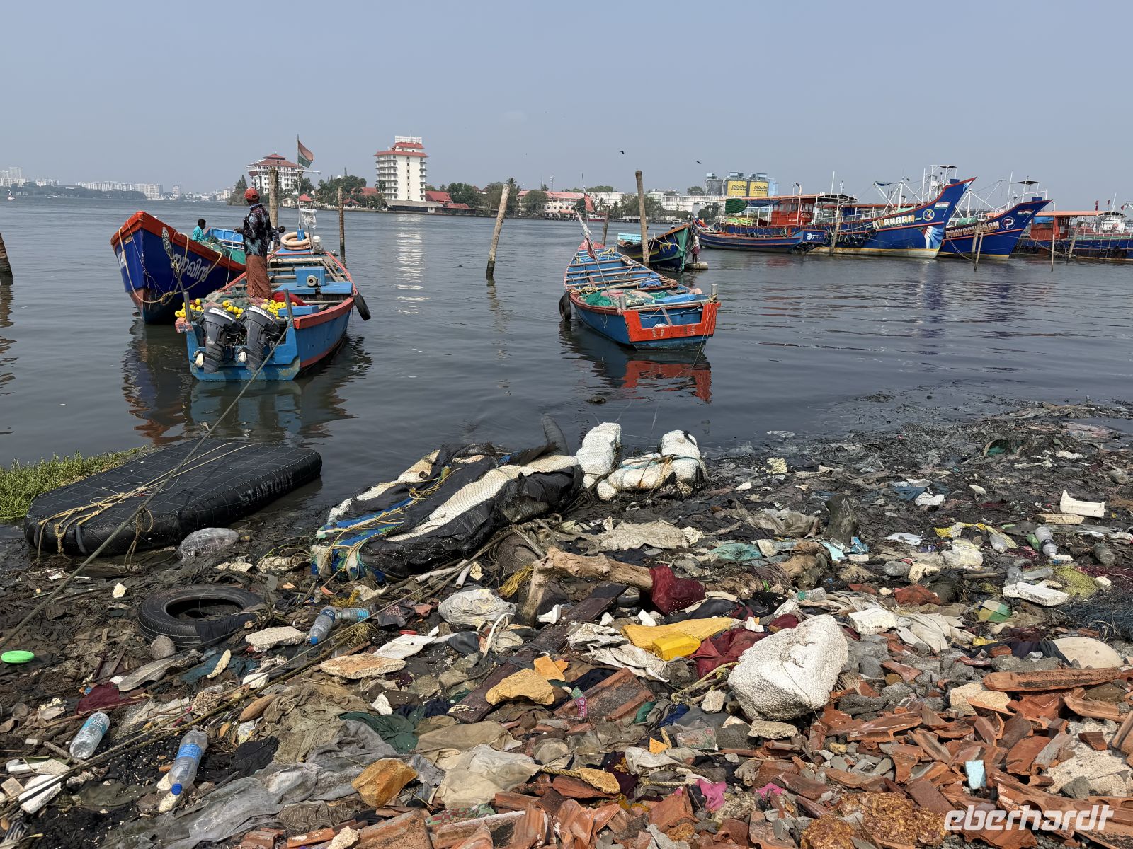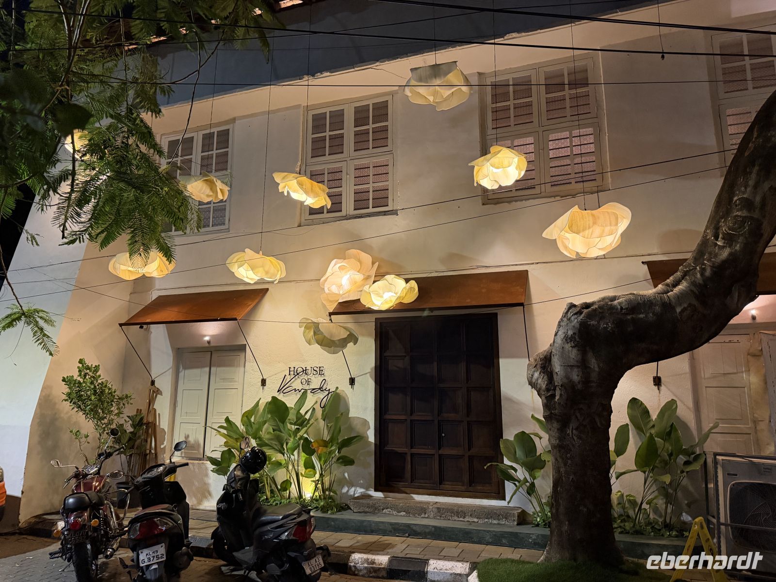 Das Boot legt schon wieder ab als wir am Morgen aufwachten. Das Frühstück wird serviert und wir packen schon wieder die Koffer als das Boot Richtung Alleppey unterwegs ist. Es geht durch schmale idyllische Wassergräben. Die Vögel sind schon aktiv und Menschen am Ufer gehen bereits ihren Beschäftigungen nach. Ein Junge sitzt am Ufer und putzt sich die Zähne. Grinst und grüßt! Das Wasser spielt eine Zentrale Rolle in dieser Gegend. Das Land ist fruchtbar und überall grünt und blüht es. Als wir uns dem Vembandad See nähern, beginnt das Elefanten Rennen der Boote. Von überall strömen die kleinen schwimmenden Hotels Richtung Hafen. Die Gäste werden in Zubringerboote umgeladen und am Hafen wieder dem Landgang überlassen. Bhawani wartet bereits mit unseren Busfahrern auf uns. Wir fahren nach Cochin. Unsere Zimmer im Hotel sind fast fertig und wir beziehen die Unterkunft schon mal bevor wir zu einem Spaziergang im östlichen Viertel aufbrechen. Die Hafenstadt besteht aus mehreren Halbinseln und Inseln. Die Portugiesen, dann die Holländer und schließlich die Briten drückten der Stadt ihren Stempel auf. Wir laufen durch die Gassen der Wohnviertel zur Bazaar Road. Hier werden und wurden die Gewürze und Handelswaren verkauft. Autos und Handkarren versperren die Straße. Wir schauen in die offenen Läden herein und besuchen eine Bilderausstellung der Biennale Kochi an, die zZ in vielen kleinen Ausstellungsräumen stattfindet. Ein Blick in die Bucht mit ihren bunten Schiffen, aber auch die Kanäle mit stinkenden Abwässern gehören zum Bild.