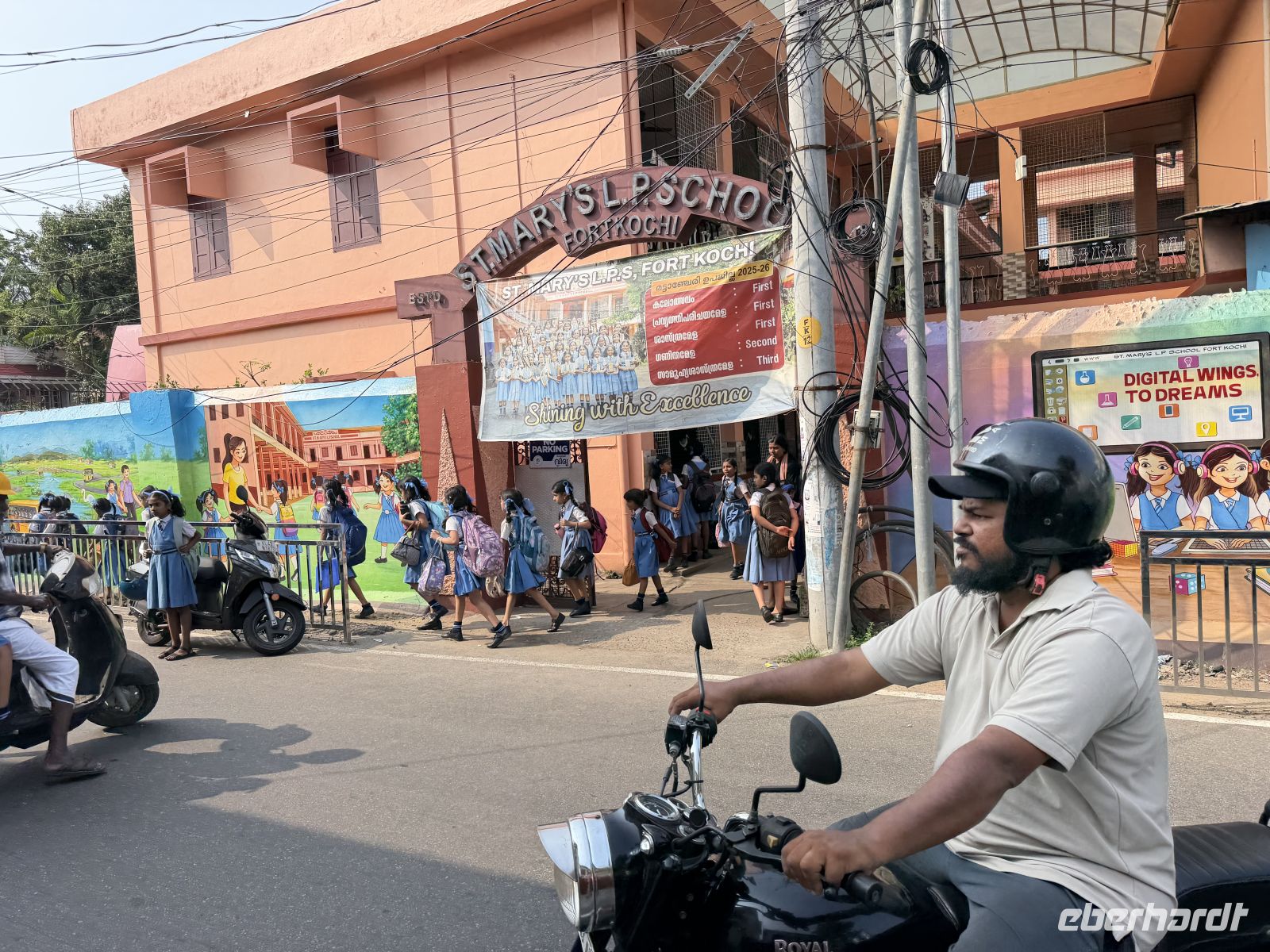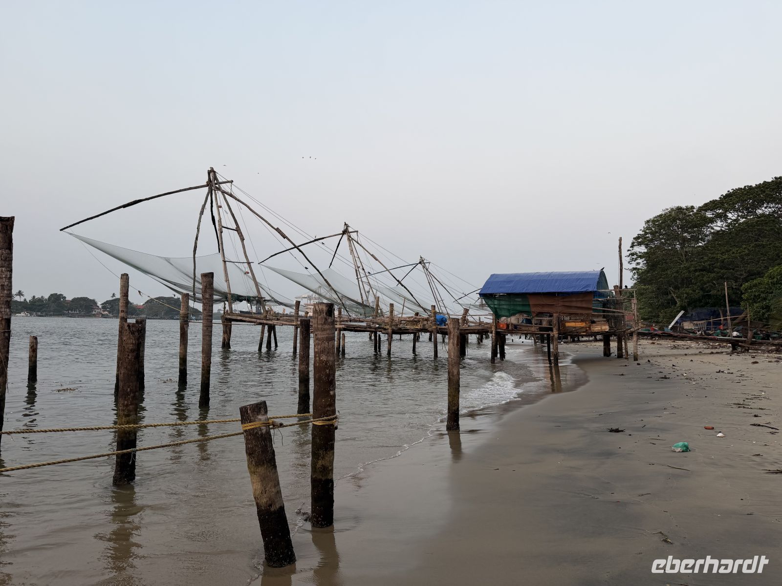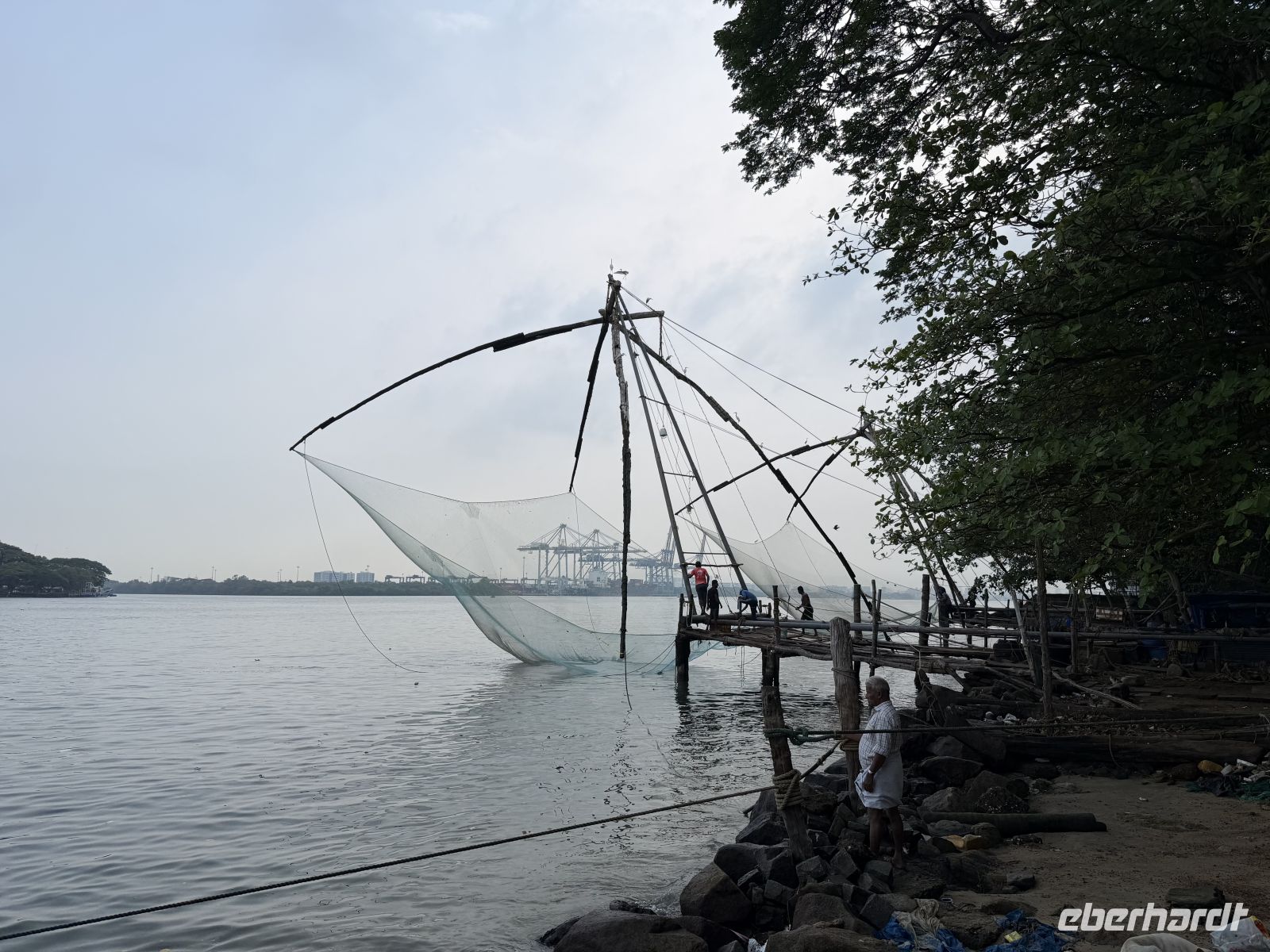 Heute beginnen wir den Tag mit einem kombinierten Spaziergang und Busfahrt durch Kochi. Fort Kochi ist das größte Eiland. Die in jedem Reiseführer abgelichteten Spinnennetze der chinesischen Fischer steht zuerst an. Wir schauen den Fischern beim Absenken der Netze zu und sind gespannt, wenn die Netze wieder hochgezogen werden.
