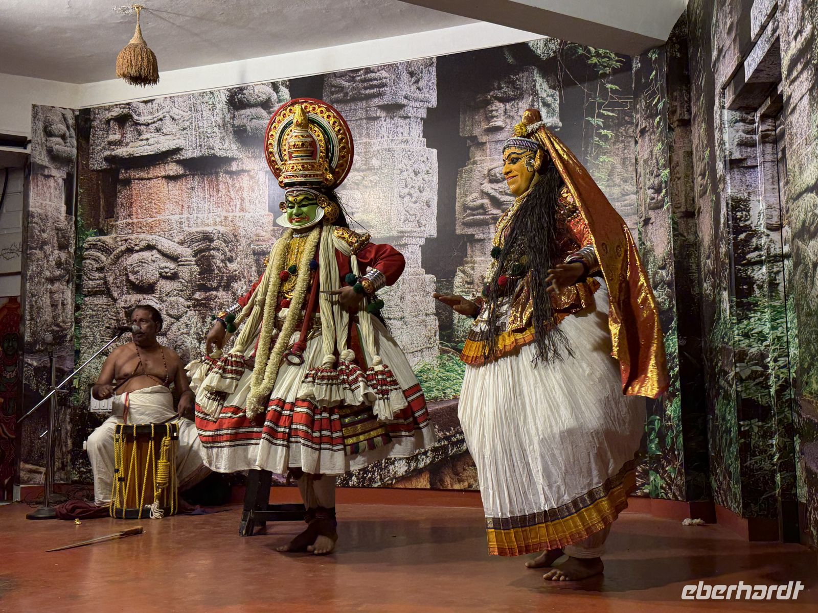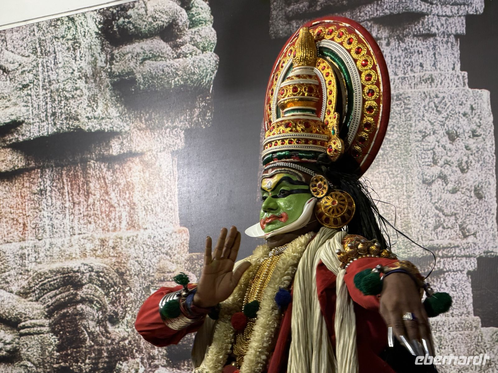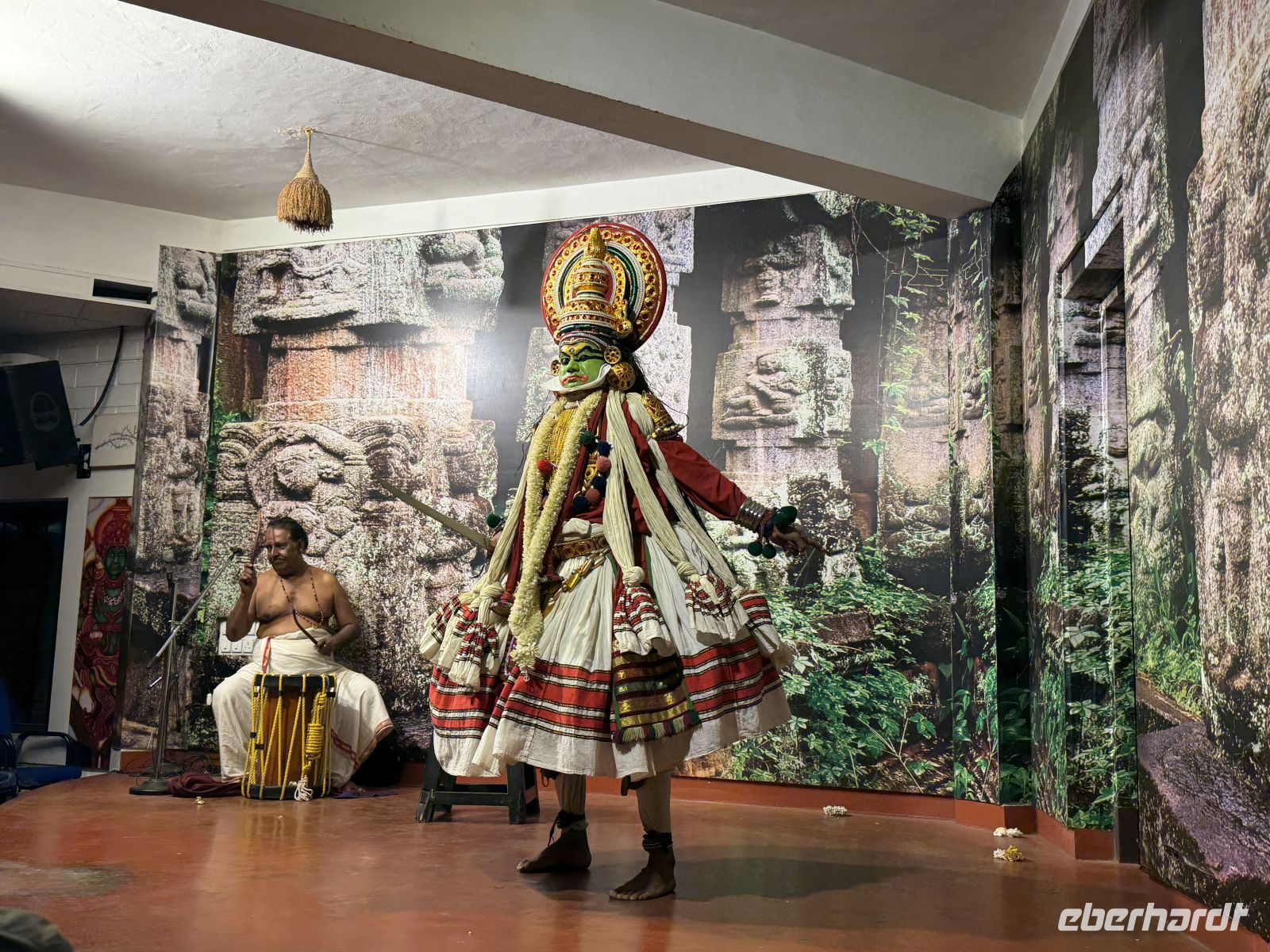 Bhawani holt uns am spätnachmittag im Hotel ab und wir laufen zur Kathakali Tanz Aufführung. Die spektakulären Tanzdramen sind eine Kunstform aus leuchtenden Farben, mächtigen Kostümen und intensiven Gesichtsausdrücken, denn gesprochen wird nicht. Pantomimisch wird eine Geschichte mit Trommelmusik untermalt. Geschichten aus dem Mahabharata und Ramayana werden hier weitergegeben. Wir schauen den Künstlern zuerst beim Schminken zu. Dann werden die Gefühle und Mimiken erklärt und dargestellt, daraufhin beginnt das Drama. Der Teufel in Form einer schönen Frau will den Prinzen verführen. Er merkt es und verjagt das Böse.