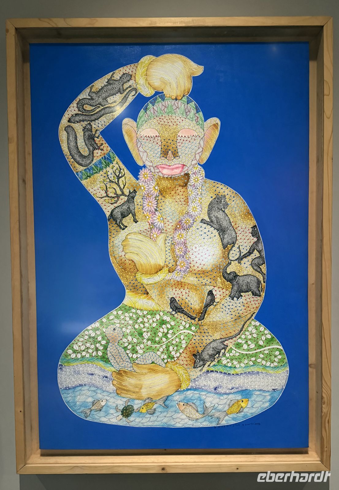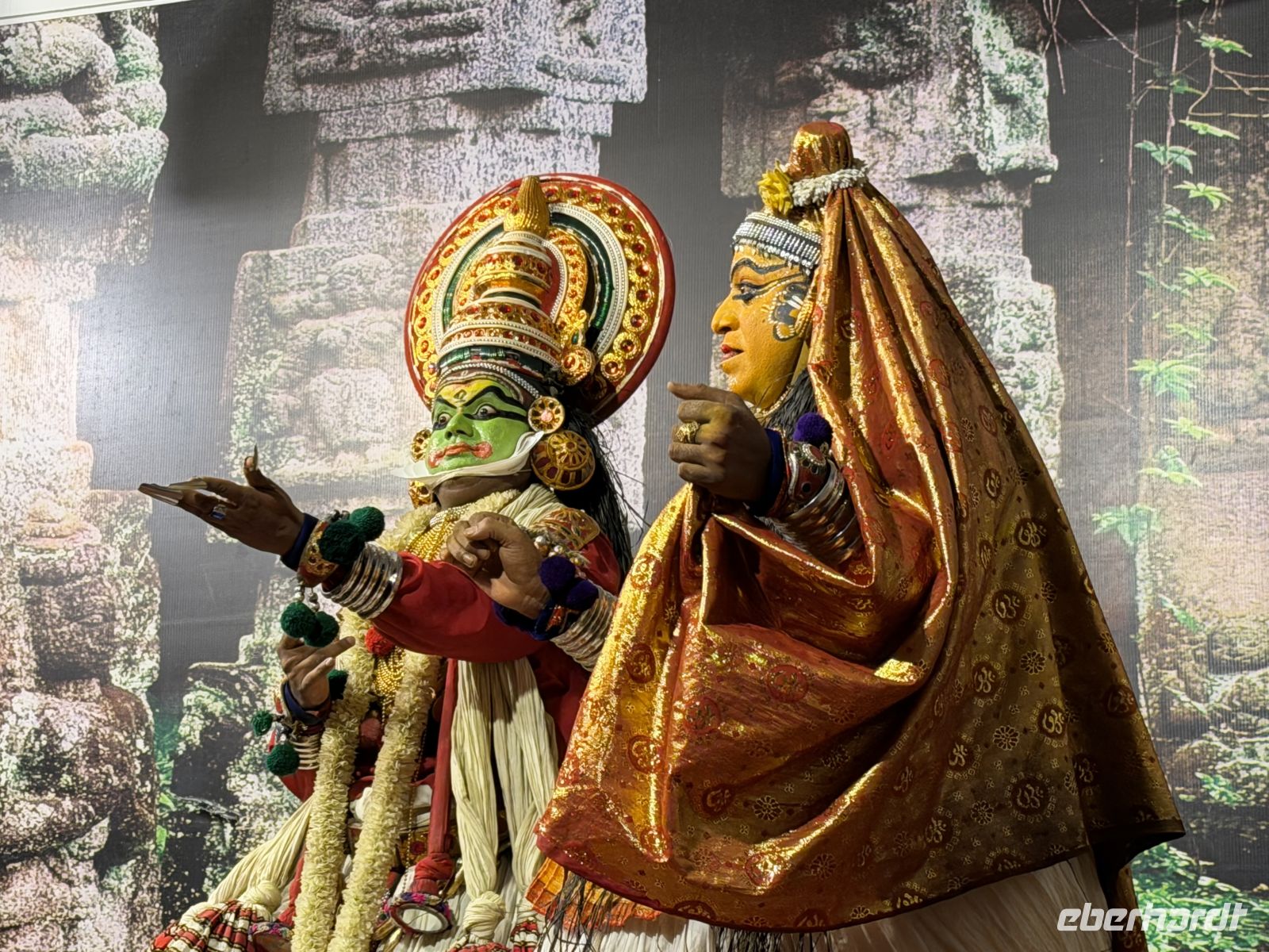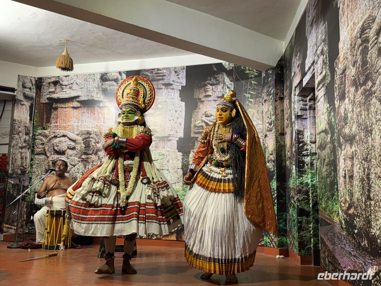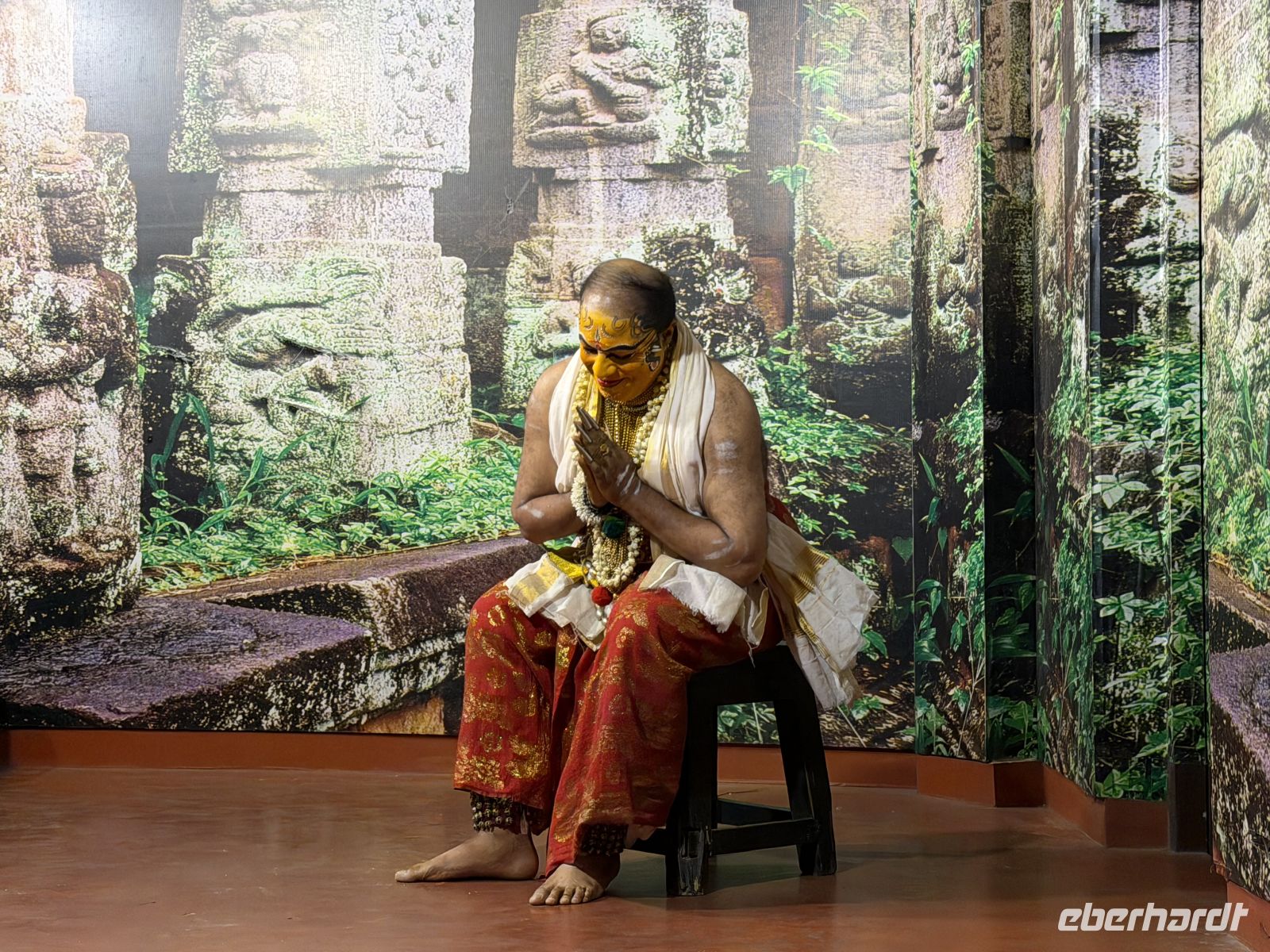 Bhawani holt uns am spätnachmittag im Hotel ab und wir laufen zur Kathakali Tanz Aufführung. Die spektakulären Tanzdramen sind eine Kunstform aus leuchtenden Farben, mächtigen Kostümen und intensiven Gesichtsausdrücken, denn gesprochen wird nicht. Pantomimisch wird eine Geschichte mit Trommelmusik untermalt. Geschichten aus dem Mahabharata und Ramayana werden hier weitergegeben. Wir schauen den Künstlern zuerst beim Schminken zu. Dann werden die Gefühle und Mimiken erklärt und dargestellt, daraufhin beginnt das Drama. Der Teufel in Form einer schönen Frau will den Prinzen verführen. Er merkt es und verjagt das Böse.