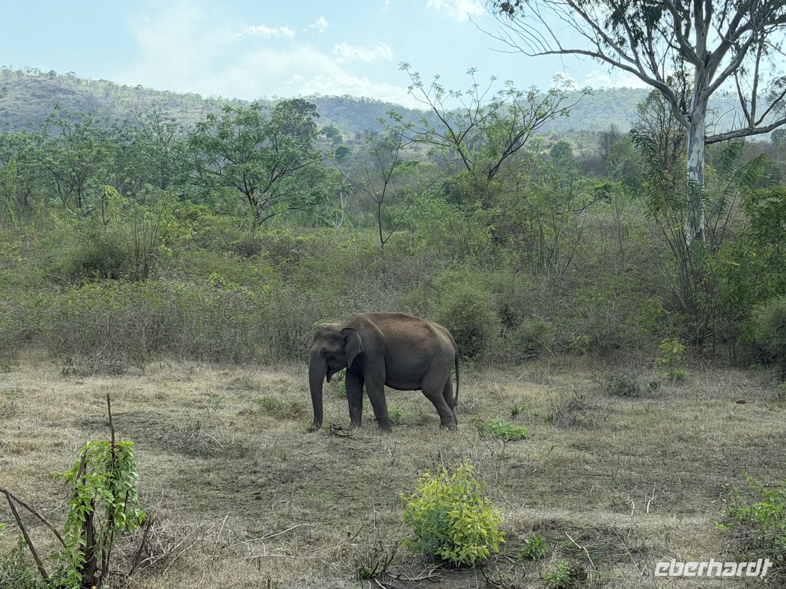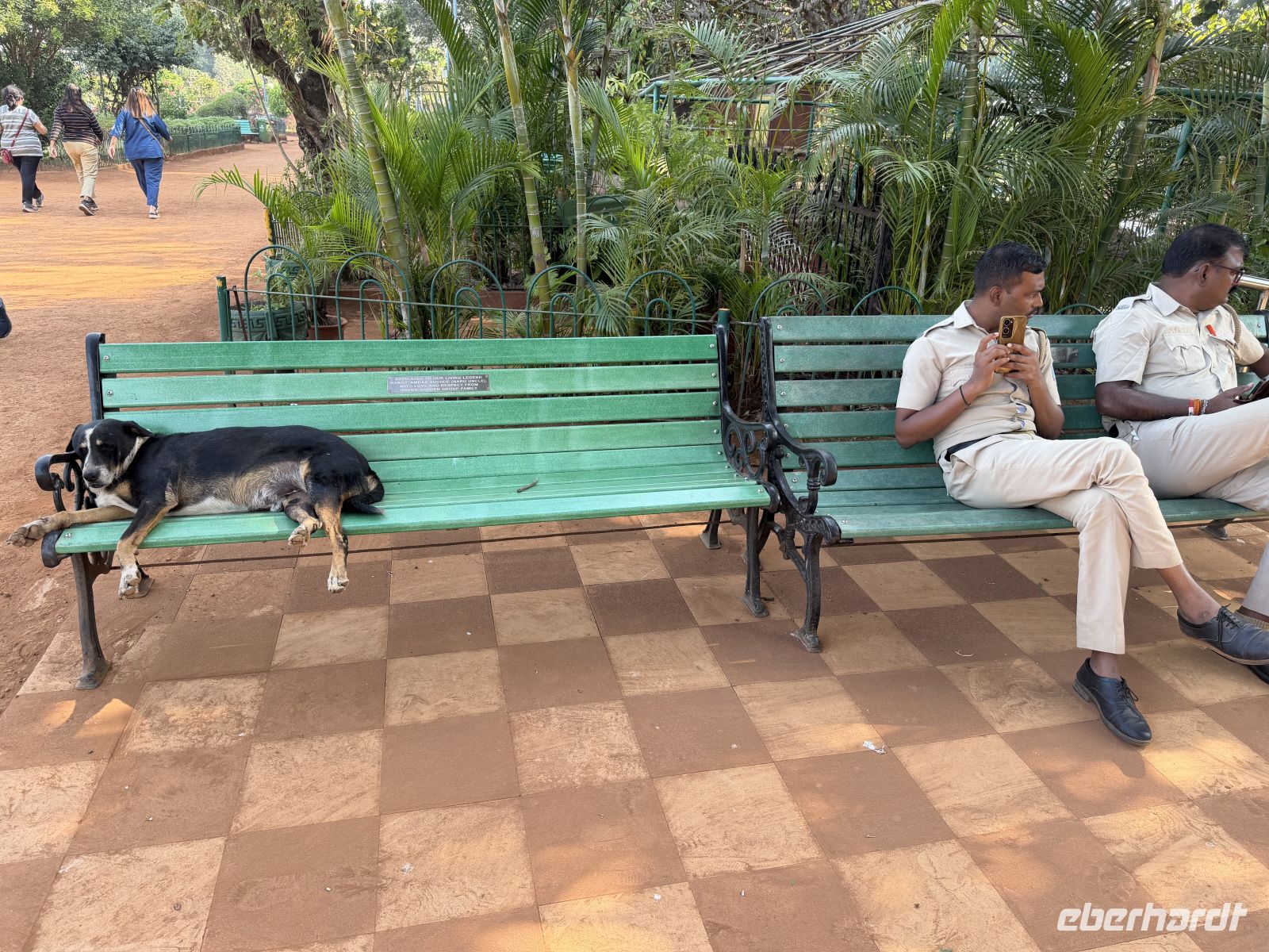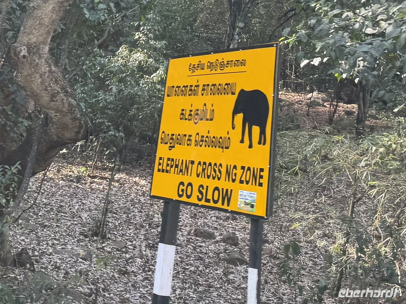 Holprige Serpentinen führen uns an Teeplantagen vorbei. Bauern erledigen fleißig ihre Feldarbeit. Endlich kommen wir durch die Tiger Reservate und wir halten unsere Augen auf. Bhawani sieht als erstes den großen Elefantenbullen im Dickicht des Waldes stehen. Wir brauchen einige Zeit bis sich die Augen gewöhnen und ihn im Gestrüpp erspähen. Es gibt viel zu sehen. Viele Axishirsche verweilen am Straßenrand und haben keine Angst vor den vorbeirollenden Waagen. Die Languren mit ihrem weißen Fell und schwarzen Gesichtern sind da etwas ängstlicher unterwegs. In dem Gebiet sollen auch Tiger leben, aber die haben wir nicht gesehen. Macht nichts, wir kommen gut in Mysore an und genießen am Abend unser traditionelles indisches Essen mit den Fingern.