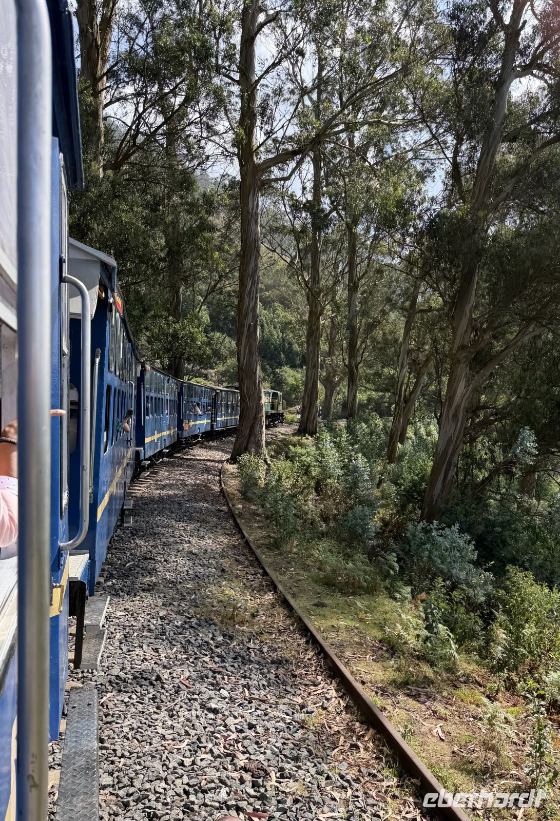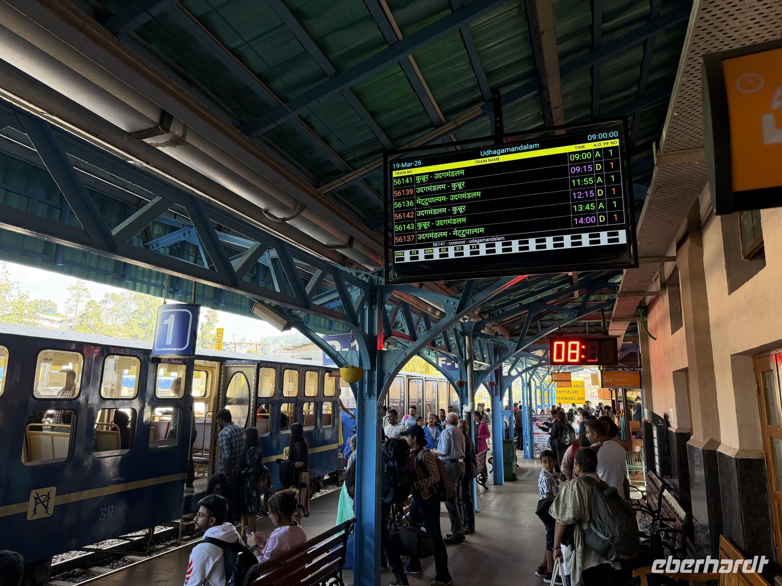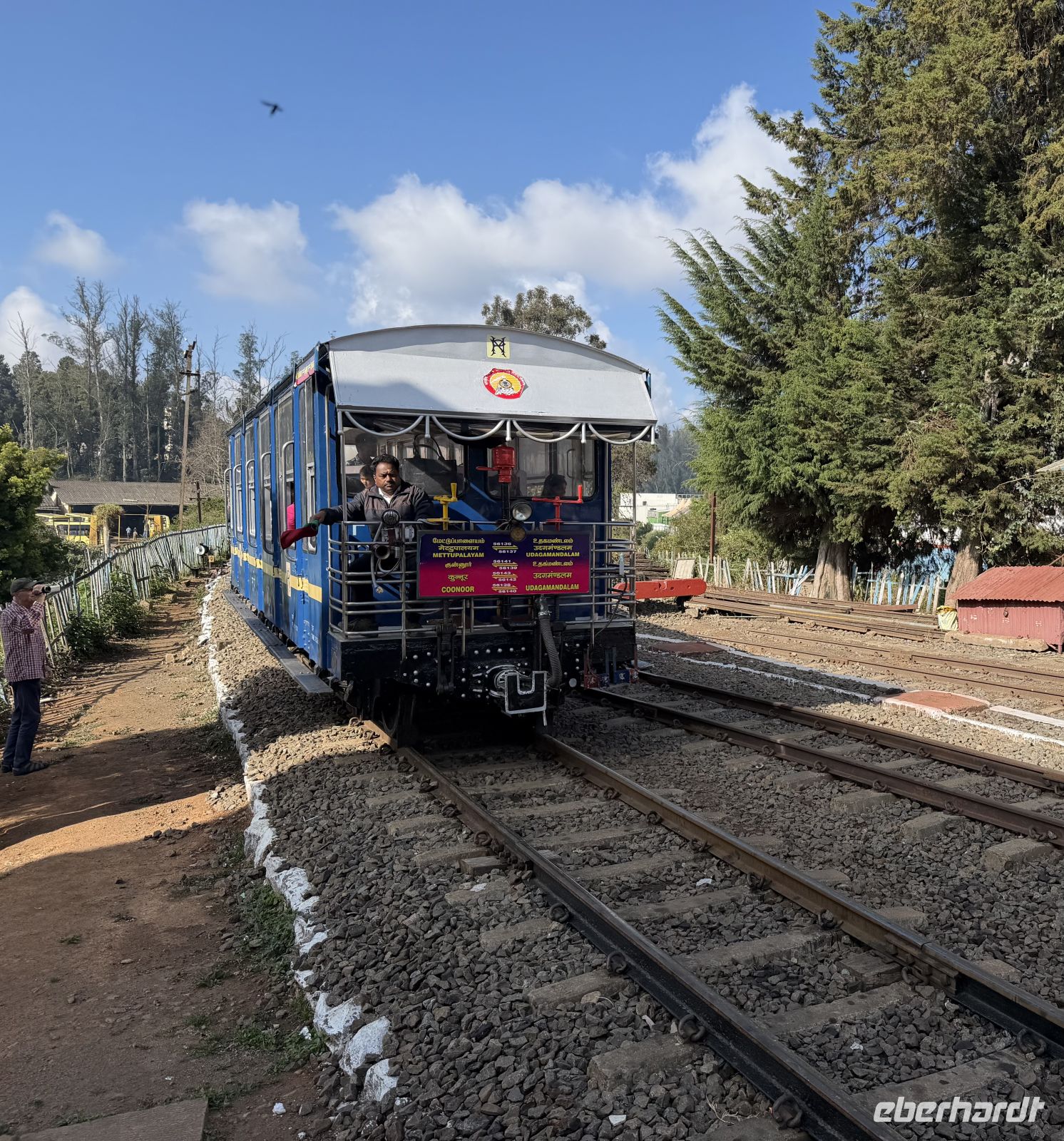 Wir beginnen den Tag mit dem Transfer zum Bahnhof nach Ooty. Hier haben wir genug Zeit zum Fotografieren. Der alte Bahnhof mit den Toy-train Fahrten nach Coonoor gehört zum UNESCO Weltkulturerbe. Die Nilgiri Mountain Railway fährt zwischen Ooty und Coonoor mit der berühmten Bergbahn, die sich die Briten 1854 ausgedacht haben. Die Idee war die Ebene mit den Nilgiri Hügeln zu verbinden. 1891 wurde der Baubeginn durch den dichten Dschungel, Felsmassiv und extremen Steigungen begonnen und 1908 war die komplette Strecke fertig. Die 19 km lange Teil-Strecke erklimmt die Bahn in einer guten Stunde. Wir beobachten die Dampflokomotive, wie sie langsam in den Bahnhof schnaubt. Die Konstruktion ist einzigartig. Die Lok schiebt bergauf und bremst über die Zahnstange bergab. Das merken die Fahrgäste allerdings nicht. Die Waggons sind mit einfachen Bänken ausgestattet und wir sitzen uns gegenüber im Abteil. Wir fahren an den Teeplantagen, Wäldern und Kolonialbahnhöfen bis Coonoor. Steigen nun von der Bahn in den Bus, um die Stadt Mysuru zu erreichen. (145 km)