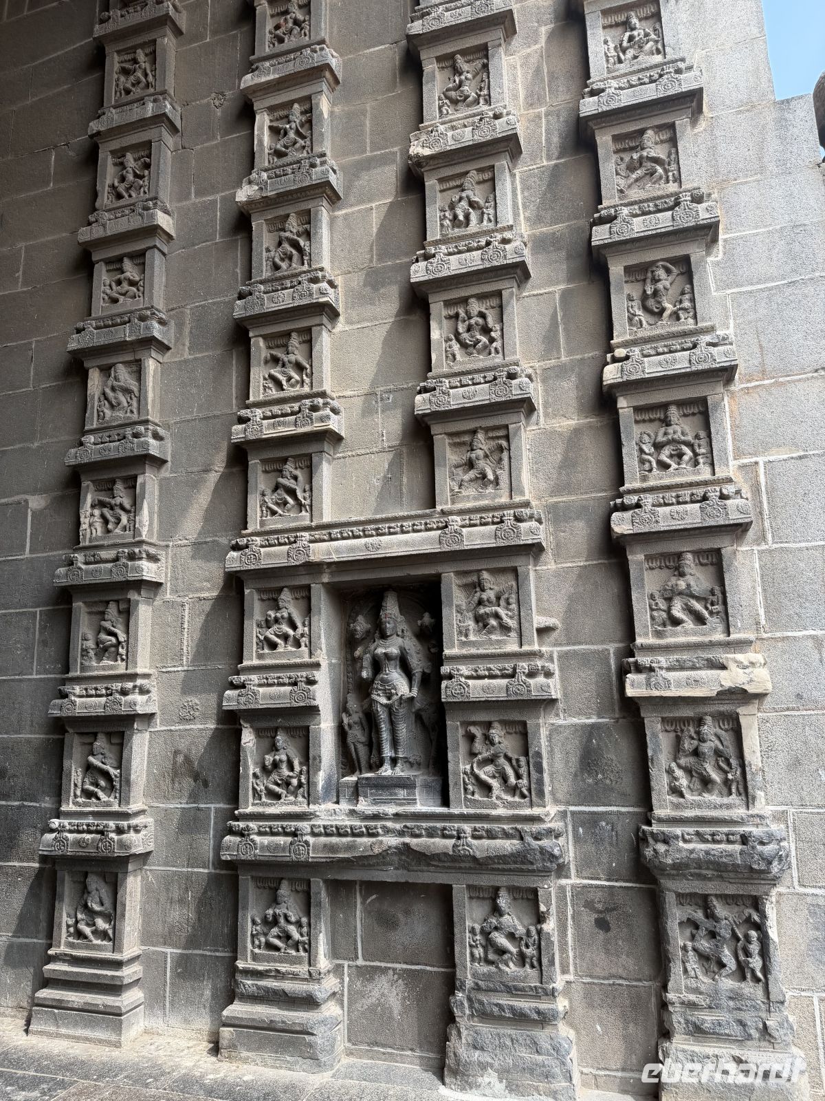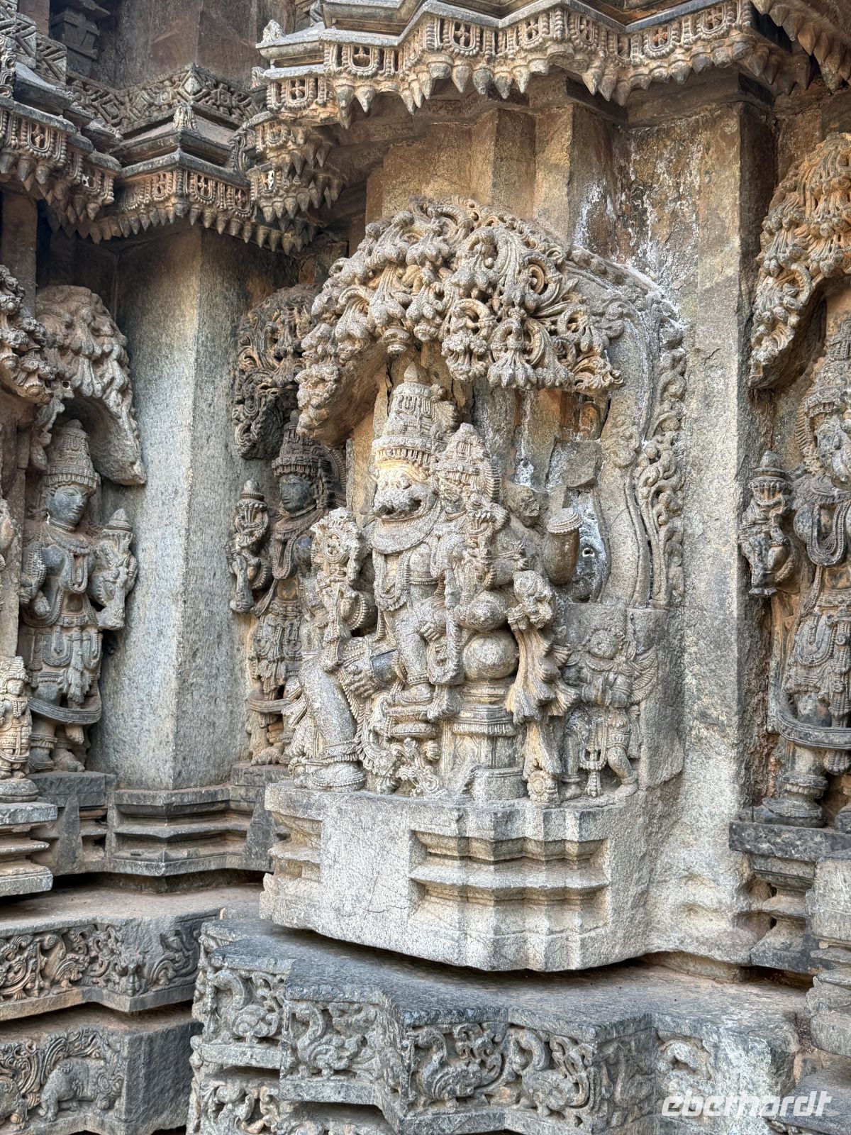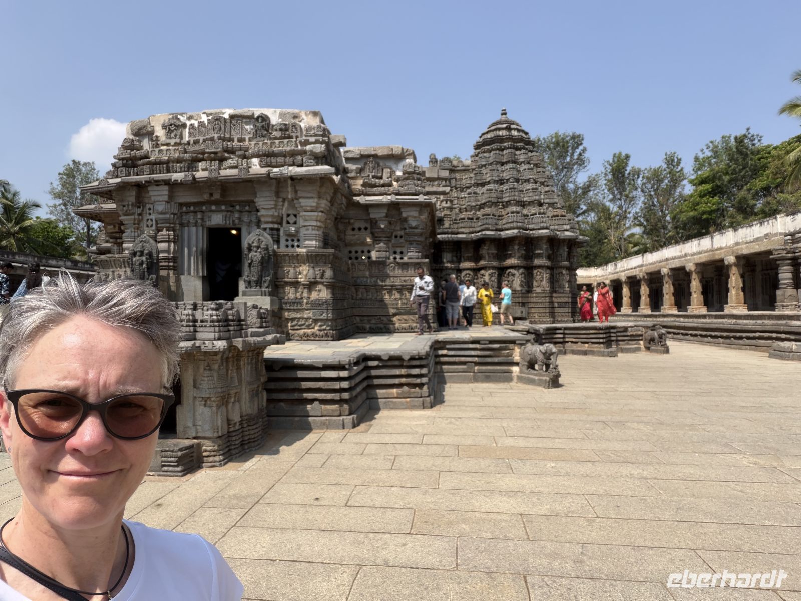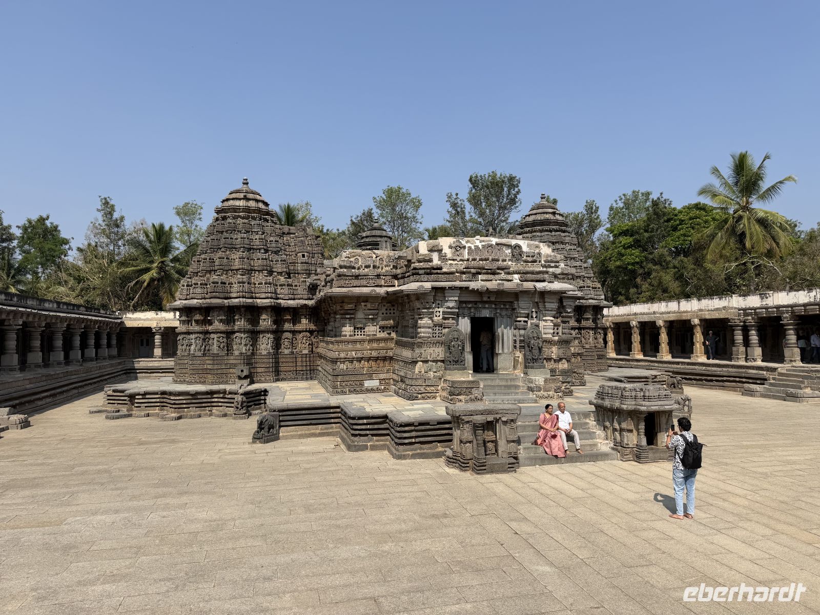 Wir befinden uns nun im Bundesstaat Karnataka und fahren ca. 1 Stunde von Mysore bis nach Somanathapura. Der Shri Chennakeshava Swamy Tempel gilt als Meisterwerk der Hoyasala Kunst. Es ist ein filigranes Steinuniversum aus dem 13. Jh. und natürlich von der UNESCO geschützt. Der Tempel steht erhöht auf einer sternförmigen Plattform. Vishnu wird in drei Formen dargestellt. Drei Schreine sind über einem Sabha-Mandapa verbunden – ein Wald aus künstlich gedrehten Säulen. Die Außenwände sind überdeckt mit Szenen aus dem Ramayana, Mahabharata und Bhagavata Purana -> Miniaturfriesen, Götterdarstellungen, Tänzerinnen, Tiere und Ornamente. Der Ort Somanatha wurde im 13 Jh gegründet als eine Brahmanensiedlung mit Vishnu und Shiva-Tempeln. Dieser Tempel gilt als Mittelpunkt des Ortes. Auch wenn der Tempel immer wieder beschädigt wurde, haben folgende Herrscher den Tempel restauriert und wir können heute die Reliefs detailreich und vollständig stundenlang bewundern und Geschichten daraus erkennen.