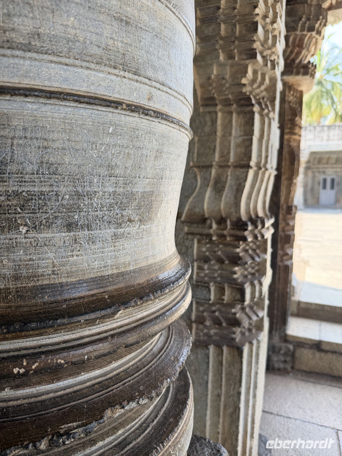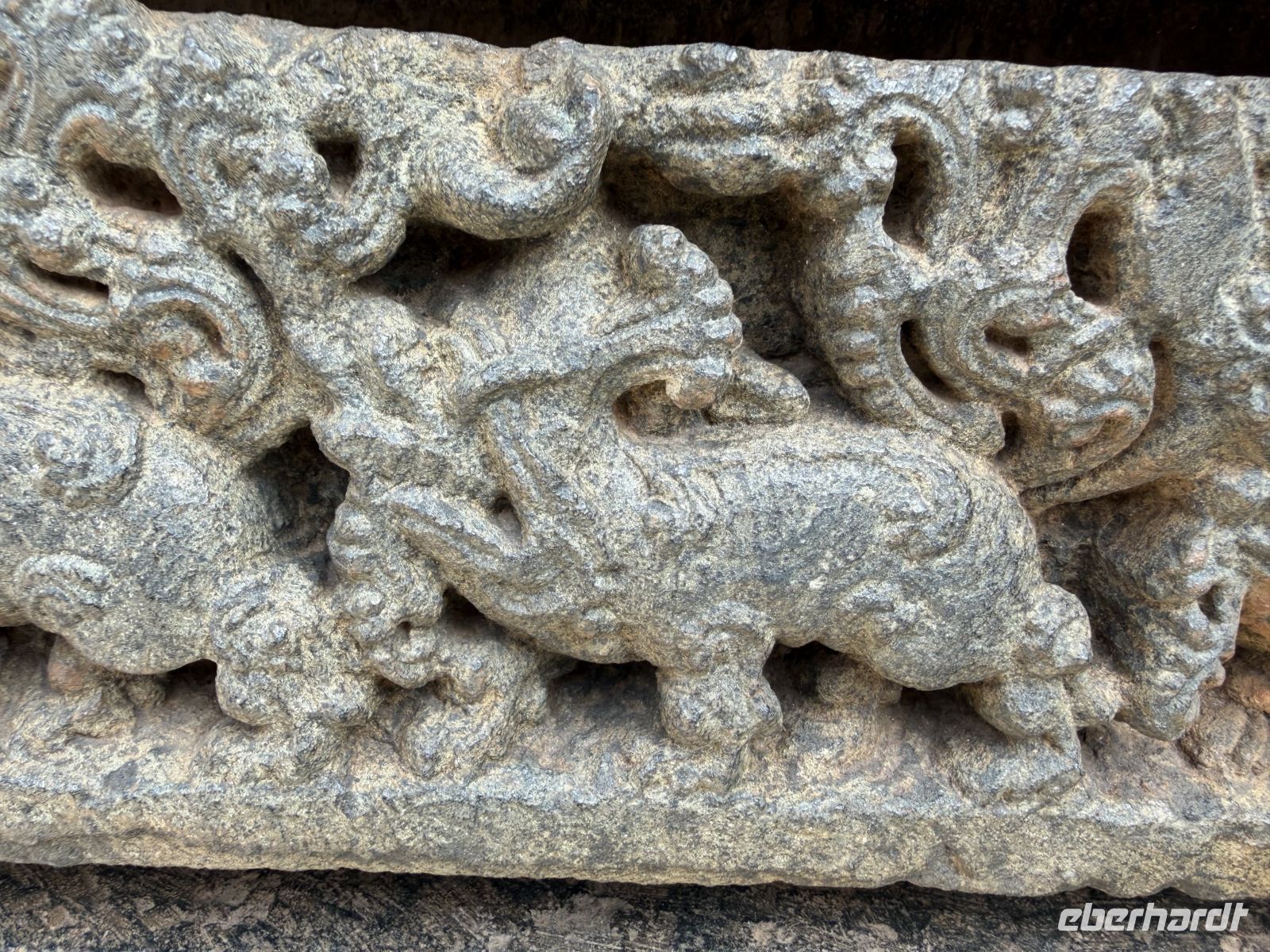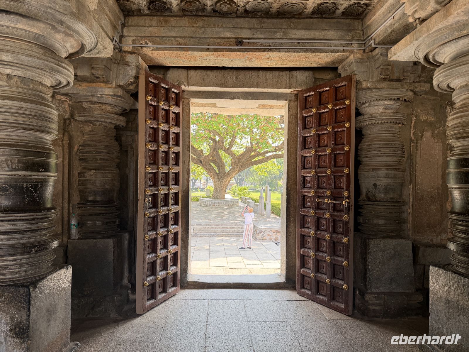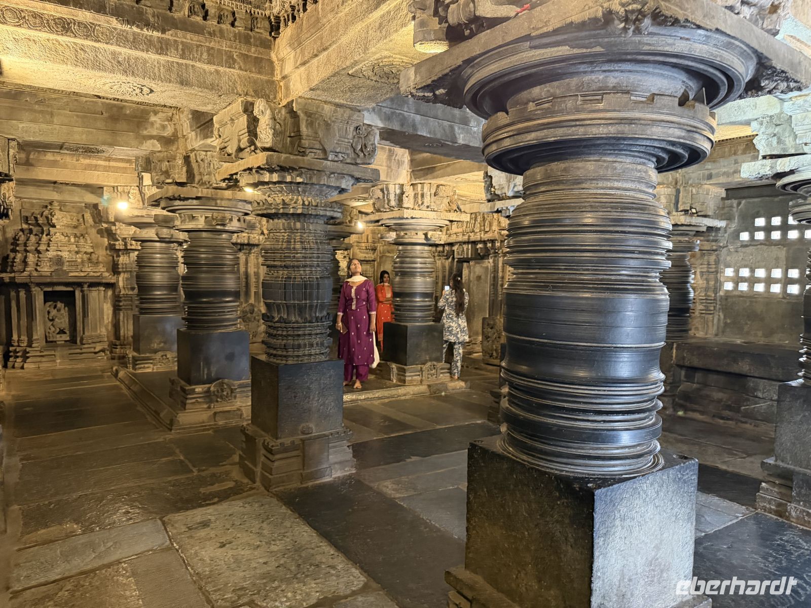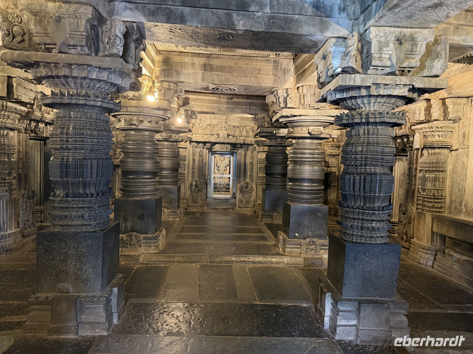 Wir befinden uns nun im Bundesstaat Karnataka und fahren ca. 1 Stunde von Mysore bis nach Somanathapura. Der Shri Chennakeshava Swamy Tempel gilt als Meisterwerk der Hoyasala Kunst. Es ist ein filigranes Steinuniversum aus dem 13. Jh. und natürlich von der UNESCO geschützt. Der Tempel steht erhöht auf einer sternförmigen Plattform. Vishnu wird in drei Formen dargestellt. Drei Schreine sind über einem Sabha-Mandapa verbunden – ein Wald aus künstlich gedrehten Säulen. Die Außenwände sind überdeckt mit Szenen aus dem Ramayana, Mahabharata und Bhagavata Purana -> Miniaturfriesen, Götterdarstellungen, Tänzerinnen, Tiere und Ornamente. Der Ort Somanatha wurde im 13 Jh gegründet als eine Brahmanensiedlung mit Vishnu und Shiva-Tempeln. Dieser Tempel gilt als Mittelpunkt des Ortes. Auch wenn der Tempel immer wieder beschädigt wurde, haben folgende Herrscher den Tempel restauriert und wir können heute die Reliefs detailreich und vollständig stundenlang bewundern und Geschichten daraus erkennen.