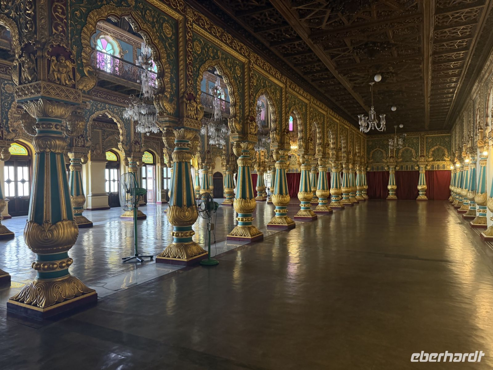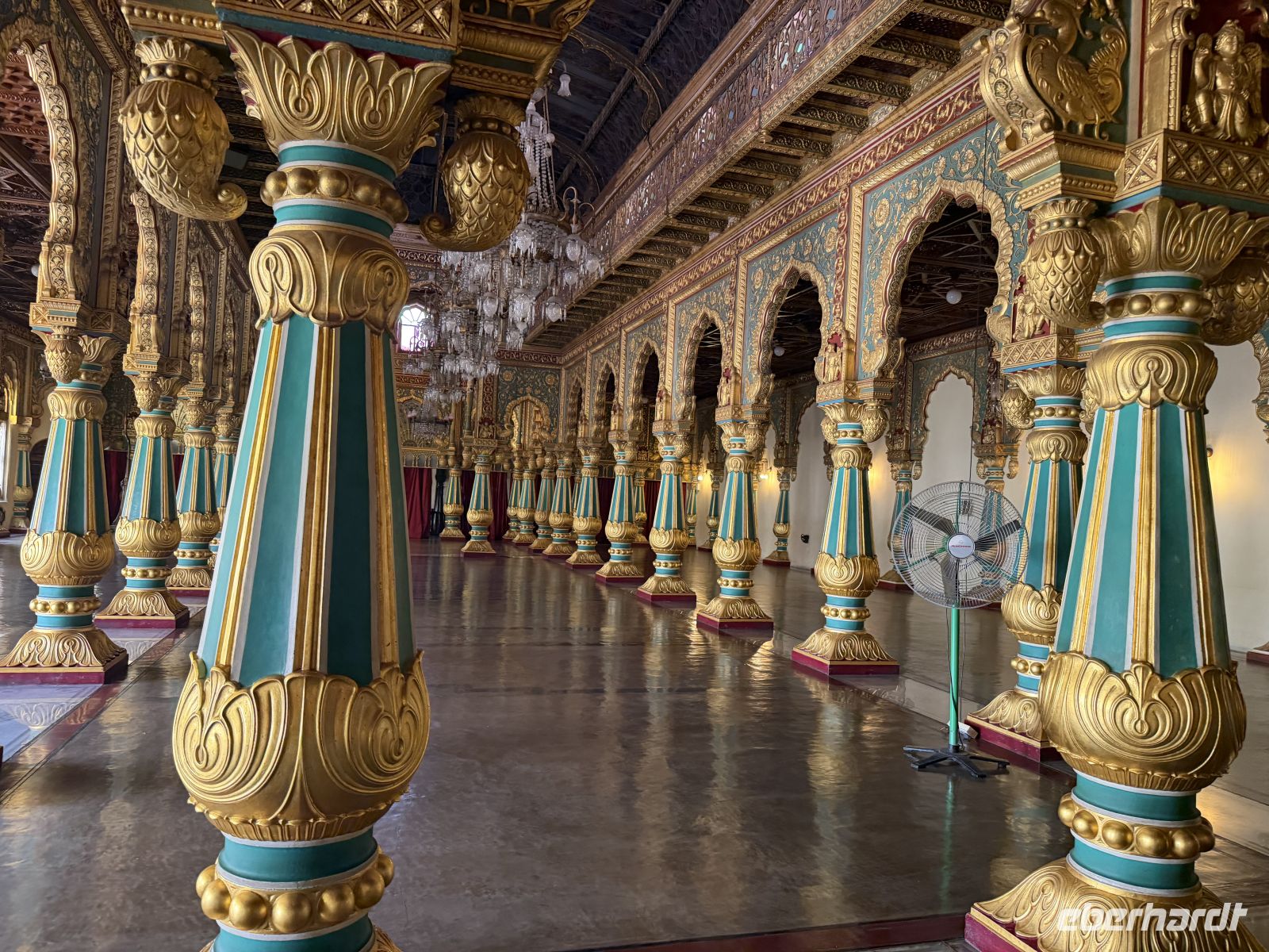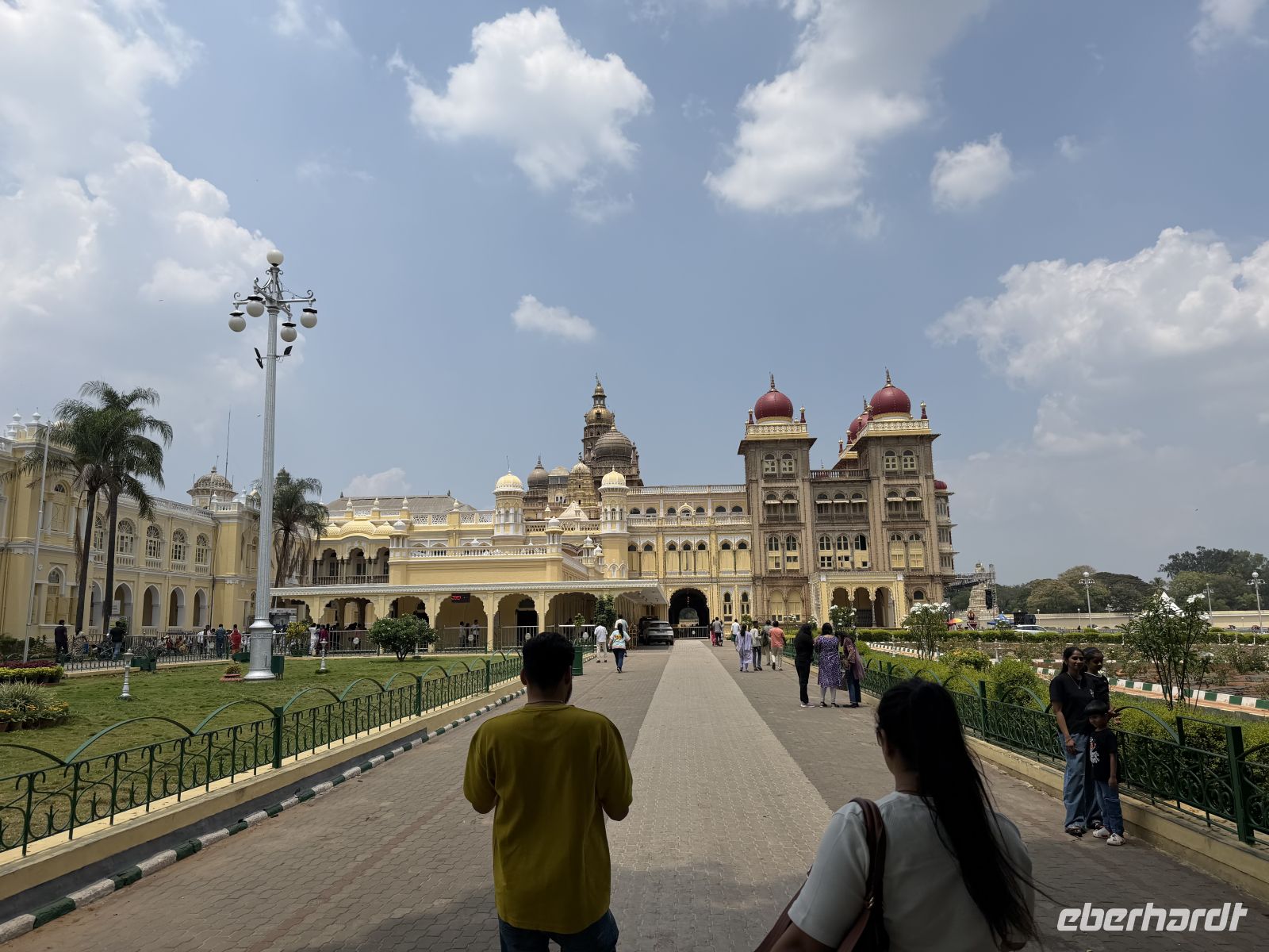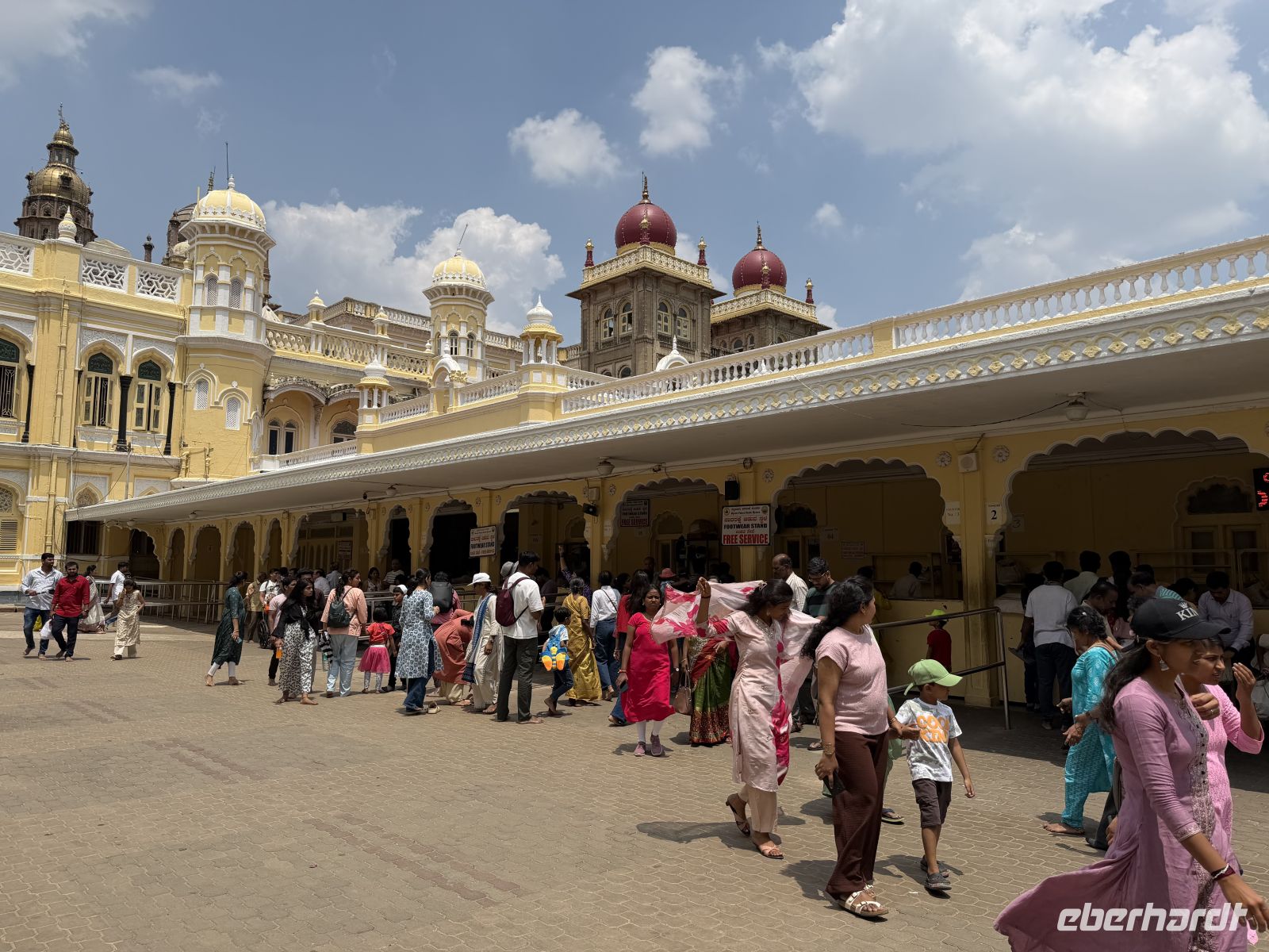 Der Maharadscha Palast von Mysuru ist deines der meistbesuchten Bauwerke Indiens (3.mio Besucher/Jahr) und Paradebeispiel indo-sarazenischer Architektur. Er wurde zwischen 1897 und 1912 erbaut und diente der Wadiyar -Dynastie als königliche Residenz. Der Brite Henry Irwin arbeitete die Architektur aus, so findet man ein Gemisch aus unterschiedlichen Baustilen wieder. Wir wandern durch die verschiedenen Räume, wie die Durbar Halle, die riesige Audienzhalle mit türkisen Säulen und vergoldeten Elementen. Oder der Ambavilasa, dem privaten Audienzsaal mit Elfenbein-Einlegearbeiten.