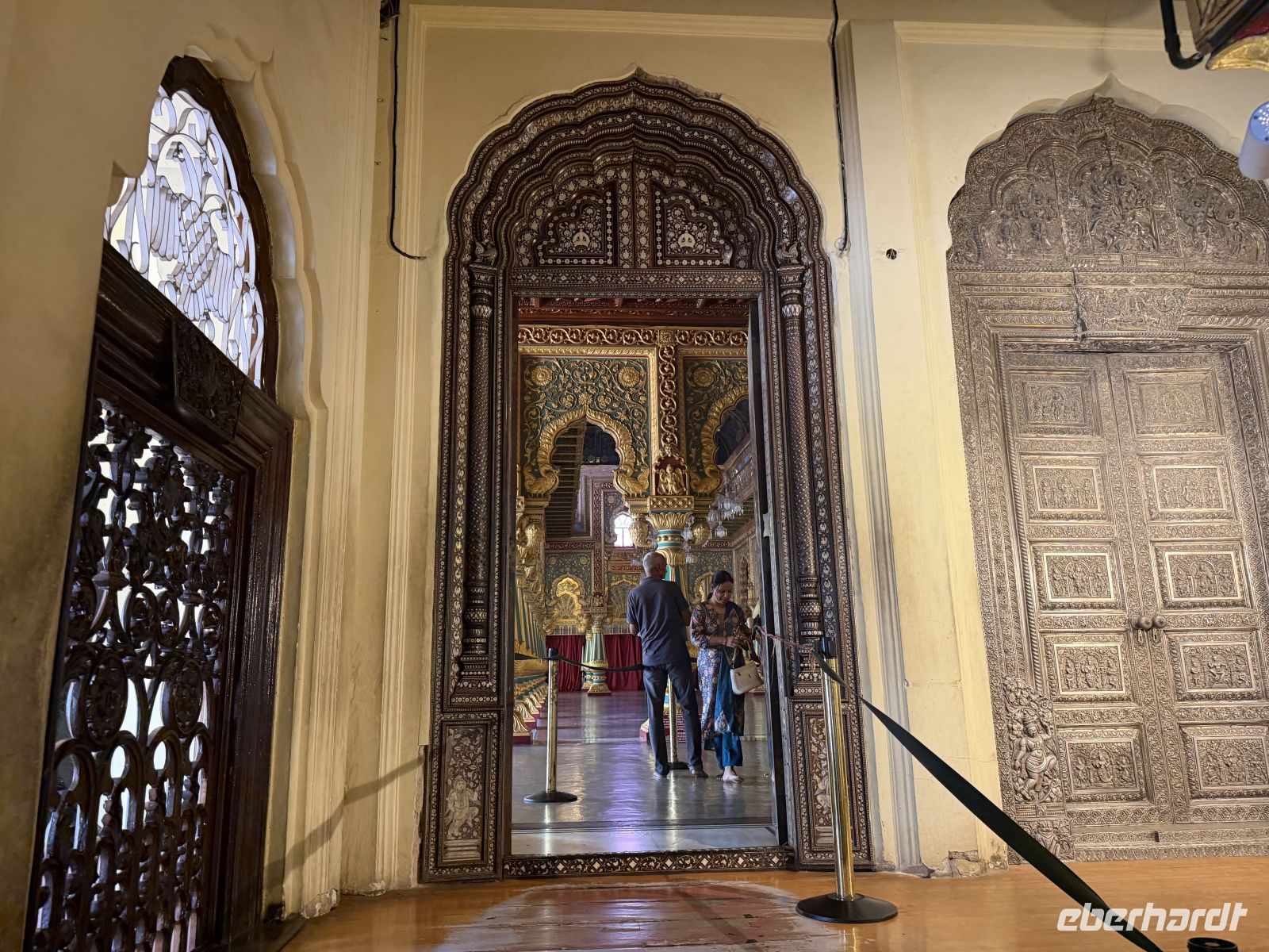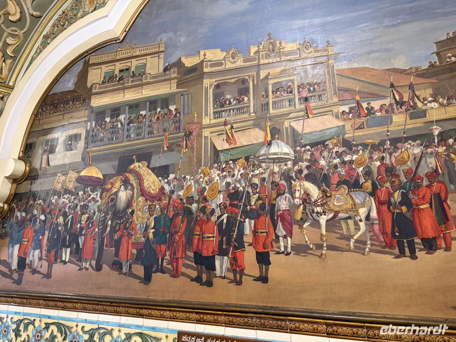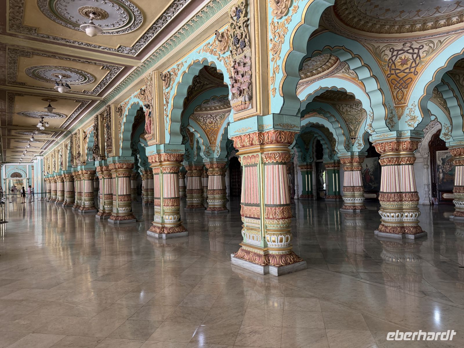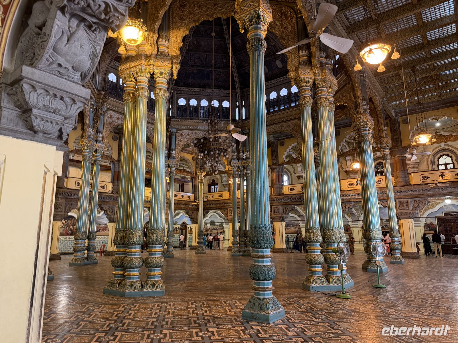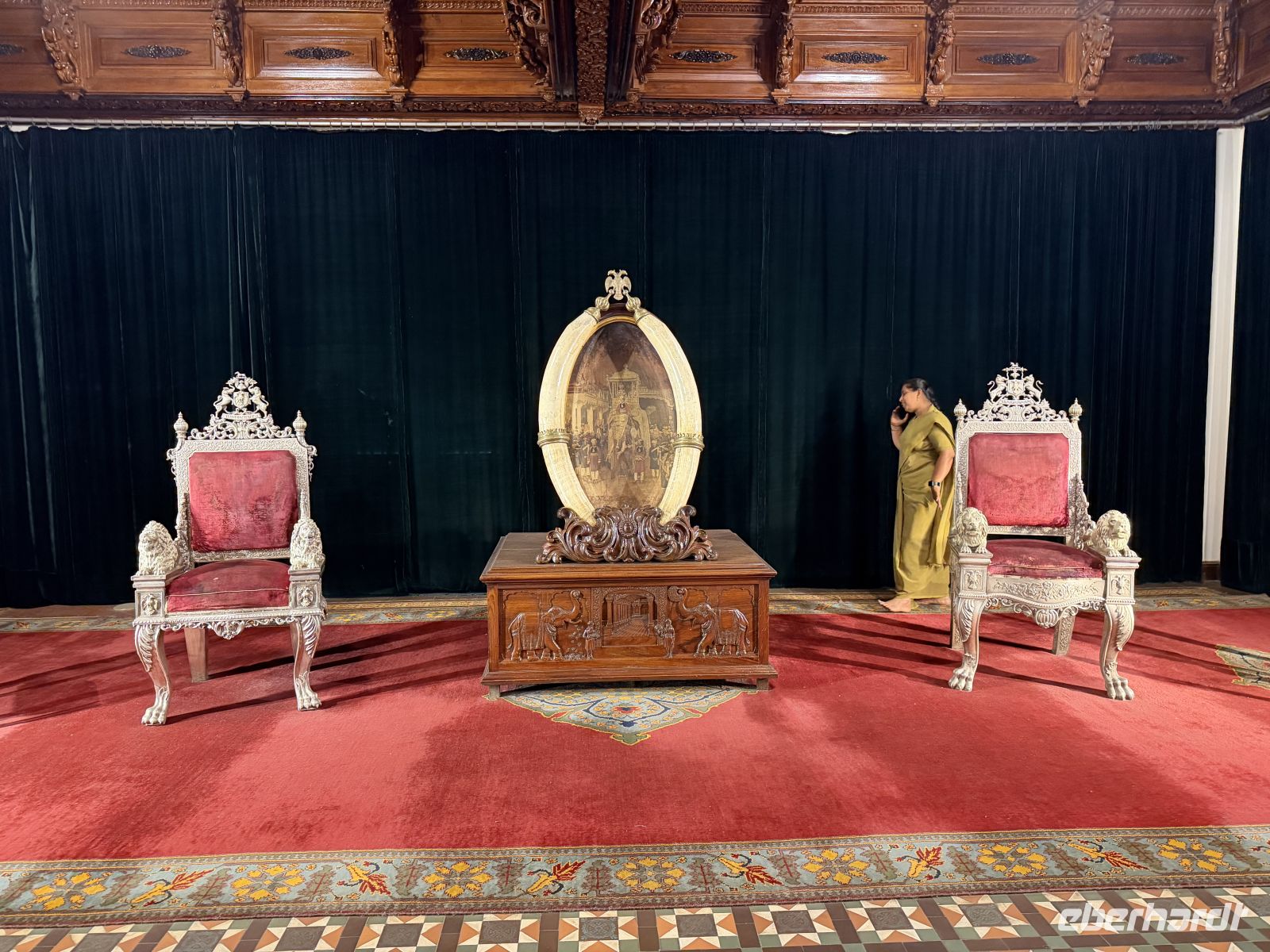 Der Maharadscha Palast von Mysuru ist deines der meistbesuchten Bauwerke Indiens (3.mio Besucher/Jahr) und Paradebeispiel indo-sarazenischer Architektur. Er wurde zwischen 1897 und 1912 erbaut und diente der Wadiyar -Dynastie als königliche Residenz. Der Brite Henry Irwin arbeitete die Architektur aus, so findet man ein Gemisch aus unterschiedlichen Baustilen wieder. Wir wandern durch die verschiedenen Räume, wie die Durbar Halle, die riesige Audienzhalle mit türkisen Säulen und vergoldeten Elementen. Oder der Ambavilasa, dem privaten Audienzsaal mit Elfenbein-Einlegearbeiten.