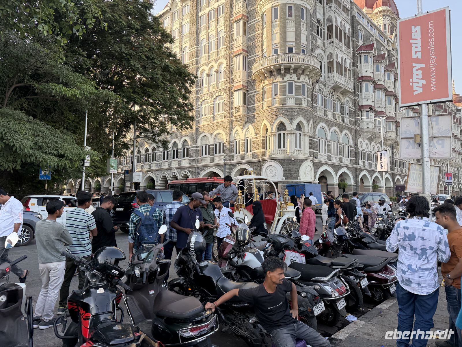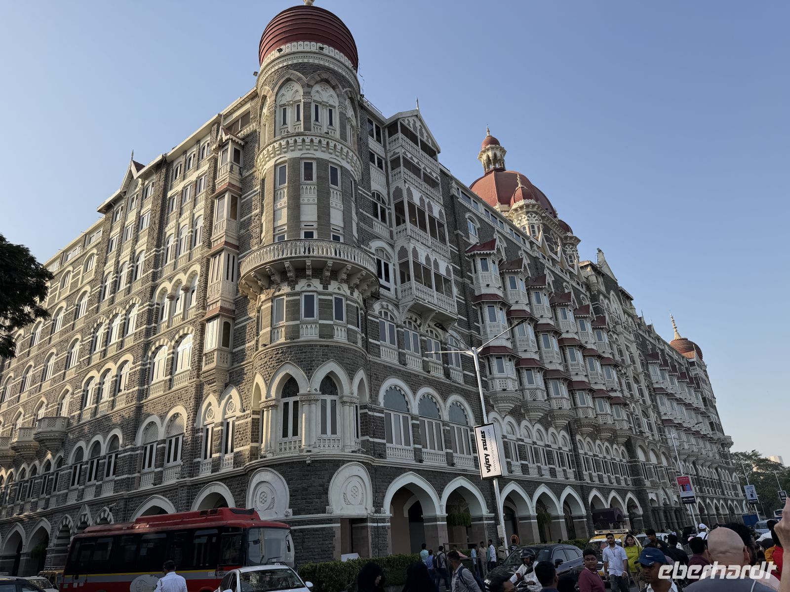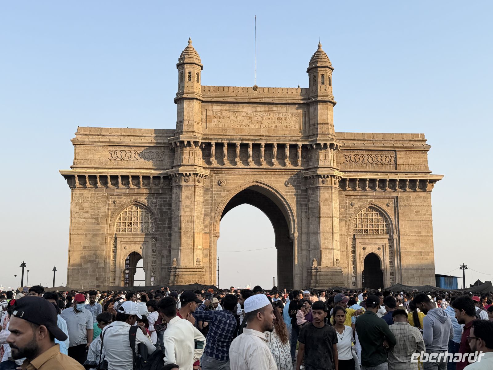 Unsere letzte Etappe steht an. Die Verabschiedung vom Busteam am Flughafen ist kurz und knapp. Die Sicherheitsvorkehrungen im Flughafen sind streng und dauern länger als gedacht, so dass wir direkt in den Flieger steigen. Zwei Stunden später sind wir bereits in Mumbai und das neue Busfahrerteam bringt uns gekoppelt mit einer kleinen Stadtrundfahrt zum Hotel. Wir beziehen unsere Zimmer. Als die Hitze ein wenig nachlässt, laufen wir mit Bhawani am Fischerhafen entlang zum Gateway of India. Je näher wir kommen, desto mehr Menschen drängeln sich vor und auf dem Platz zum Gateway. Wir hören die Geschichten zum Taj Mahal Hotel und Tower von Bhawani. Auch die Geschichte zum monomentalen Torbogen, erbaut von dem Briten 1924 ist sehr interessant. Gut, dass die Gruppe so übersichtlich ist, und wir schaffen es zusammen den Platz wieder zu verlassen. Überwältigt von den Massen freuen wir uns im Hotel wieder Ruhe zu finden und genießen das Buffet im Stadthotel.