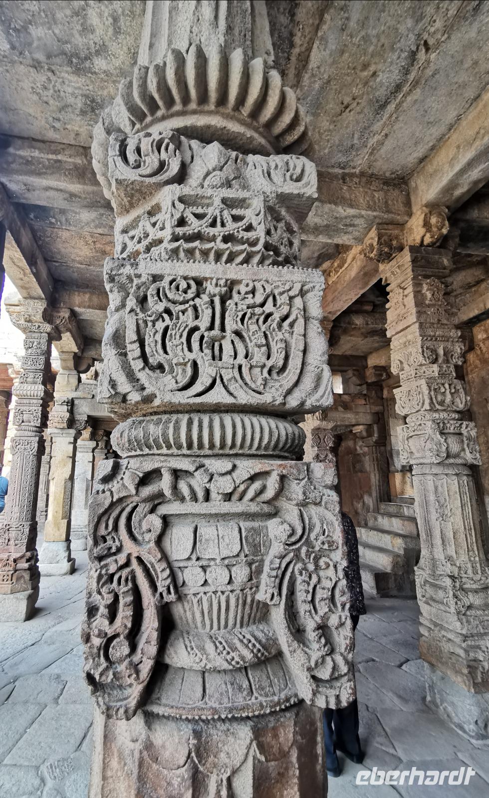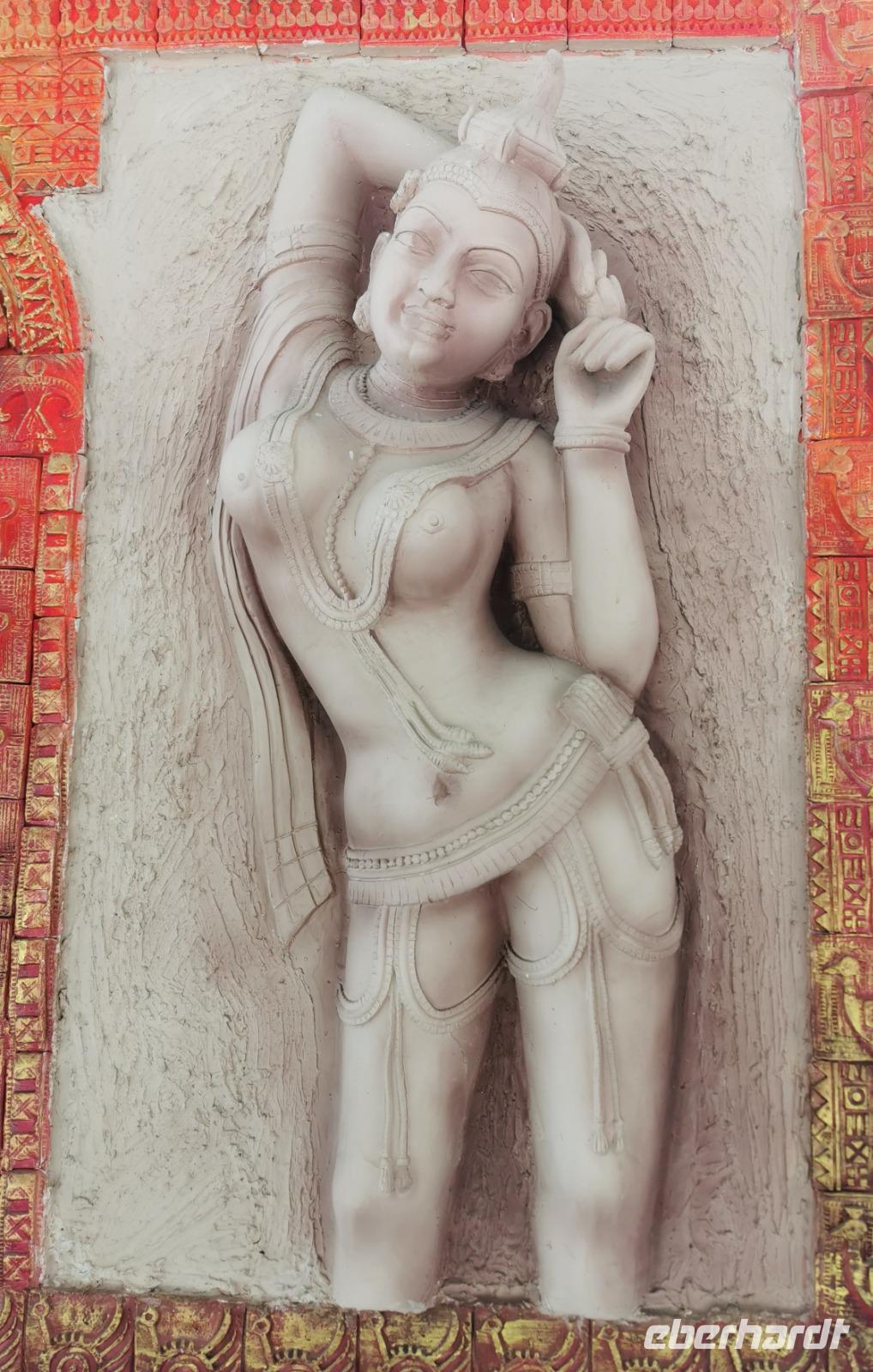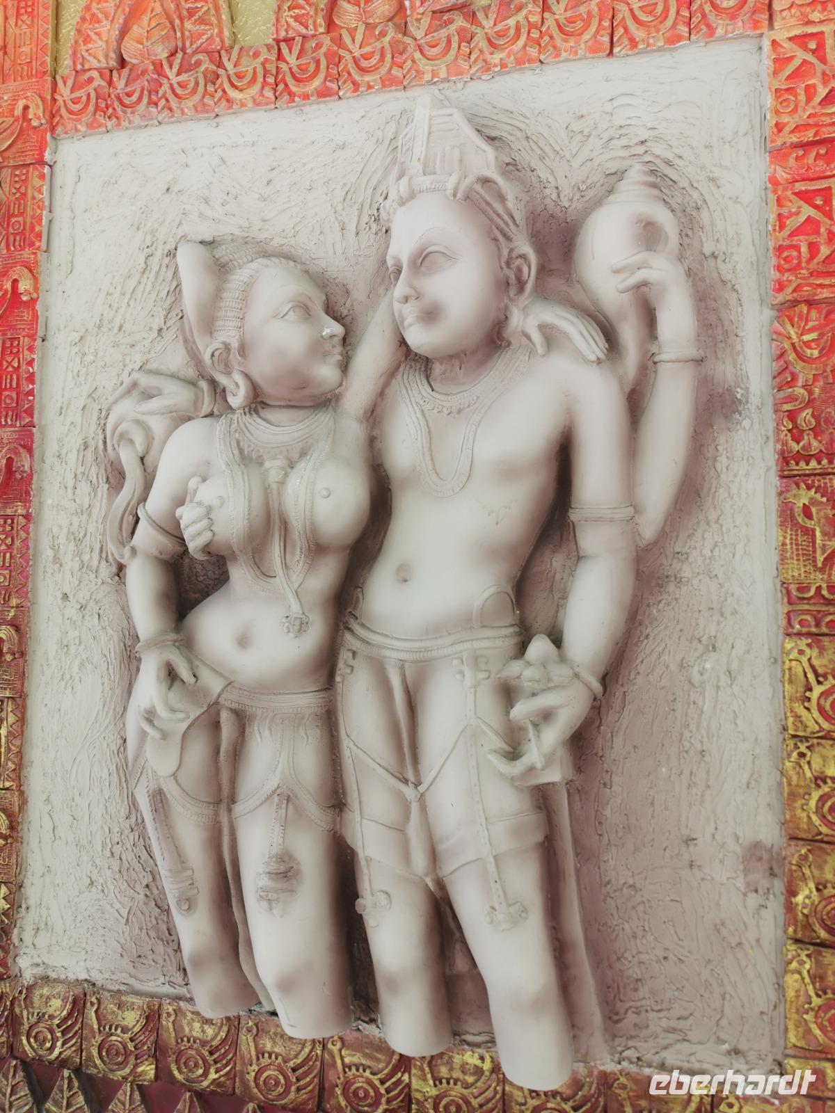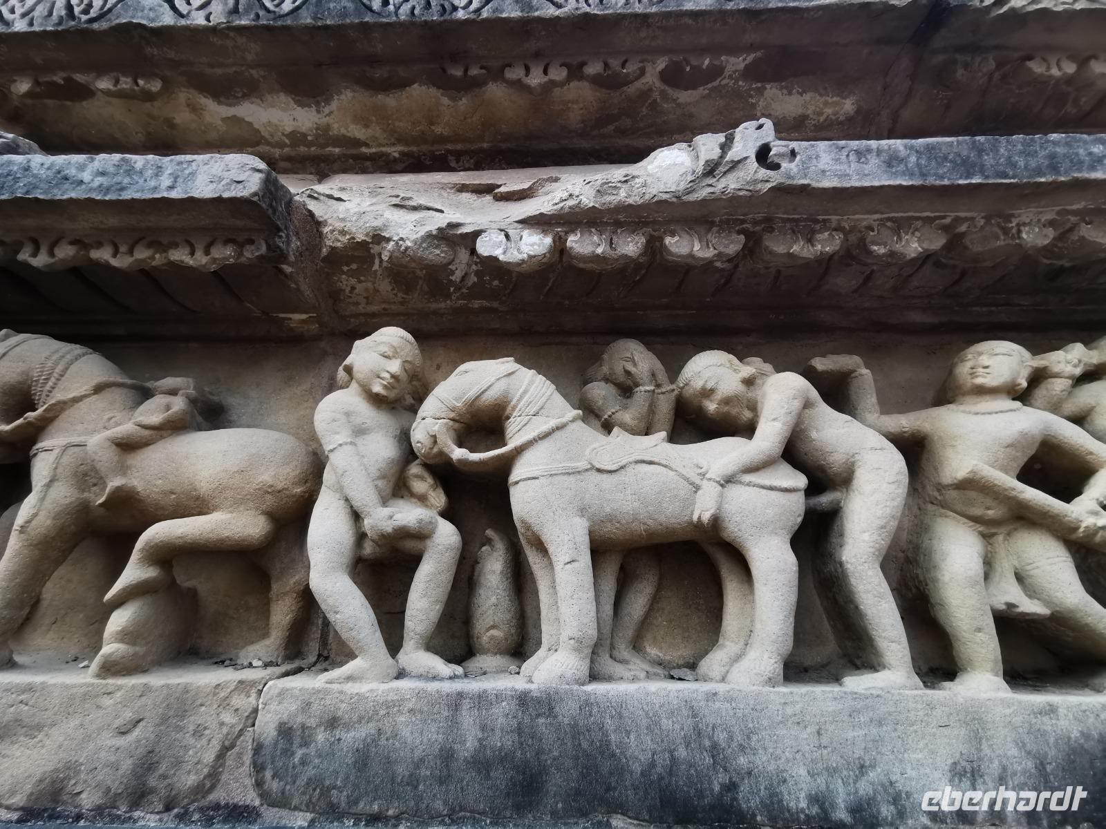 Die meisten dieser Tempel sind hinduistischen Hauptgöttern geweiht, einige jedoch sind Jaintempel. Fast alle dieser Bauten sind gen Osten ausgerichtet, so daß die aufgehende Sonne das Innere erleuchtet und einstmals tanzten auf Podesten im Inneren Tempeltänzerinnen. Jeder dieser Tempel ist mit beeindruckenden Figuren überzogen, viele davon sind höchst erotische Darstellung von vollbusigen halbnackten Damen und Liebespärchen in allen erdenklichen Positionen. Wir spazieren durch die Anlage und genießen die Ruhe unter schattigen Bäumen bei kühlen Getränken.