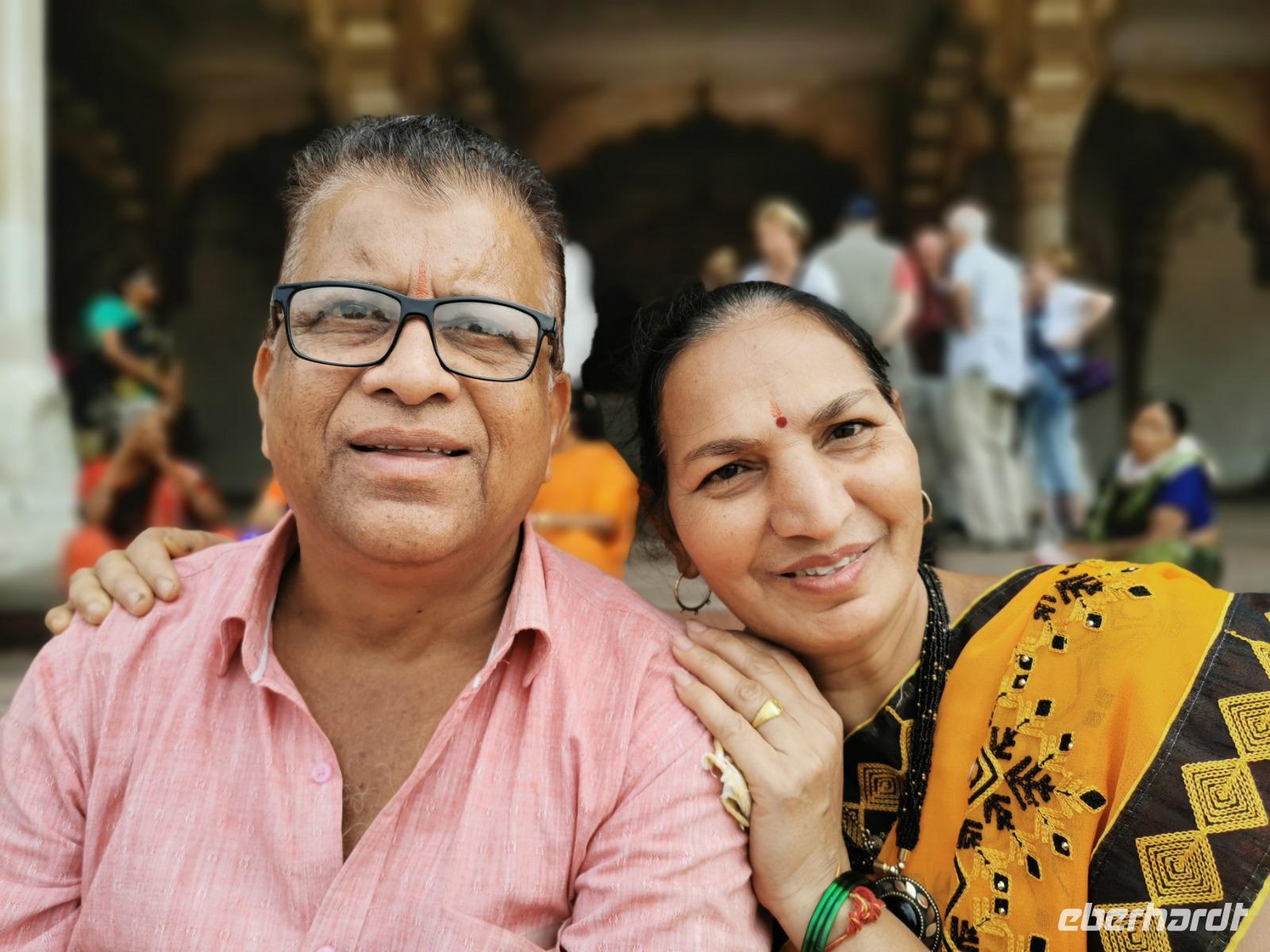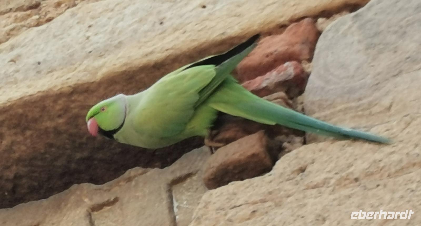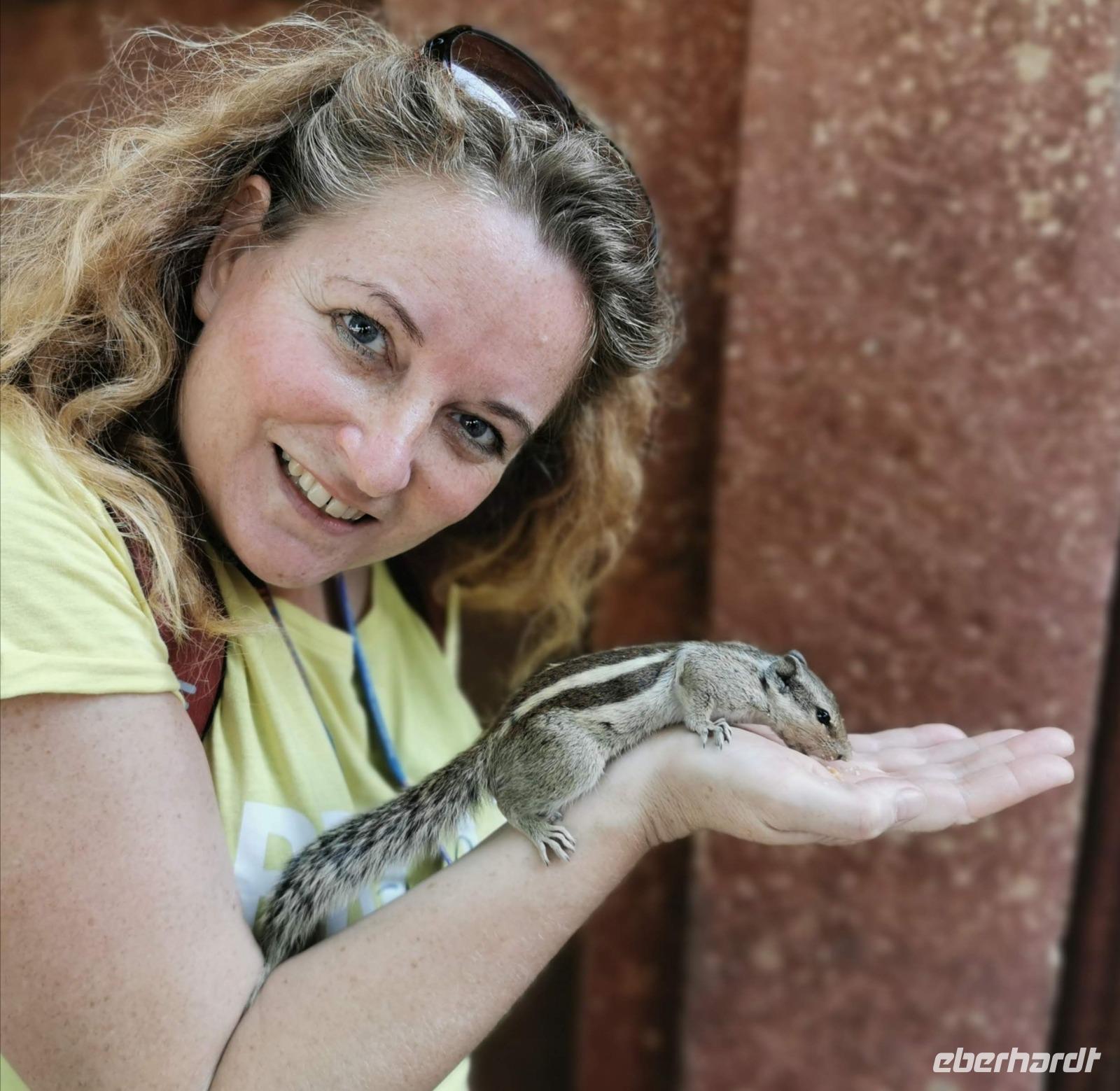 Wir erfreuen uns in der Anlage zuerst an den grünen Halsbandsittichen, die auf den historischen Mauern sitzen und den Streifenhörnchen, die überhaupt nicht scheu angesprungen kommen und nachsehen wollen, ob nicht der ein oder andere Keks für sie herausspringt. Neugierig umringen uns auch die indischen Besucher und wollen wissen, woher wir kommen.