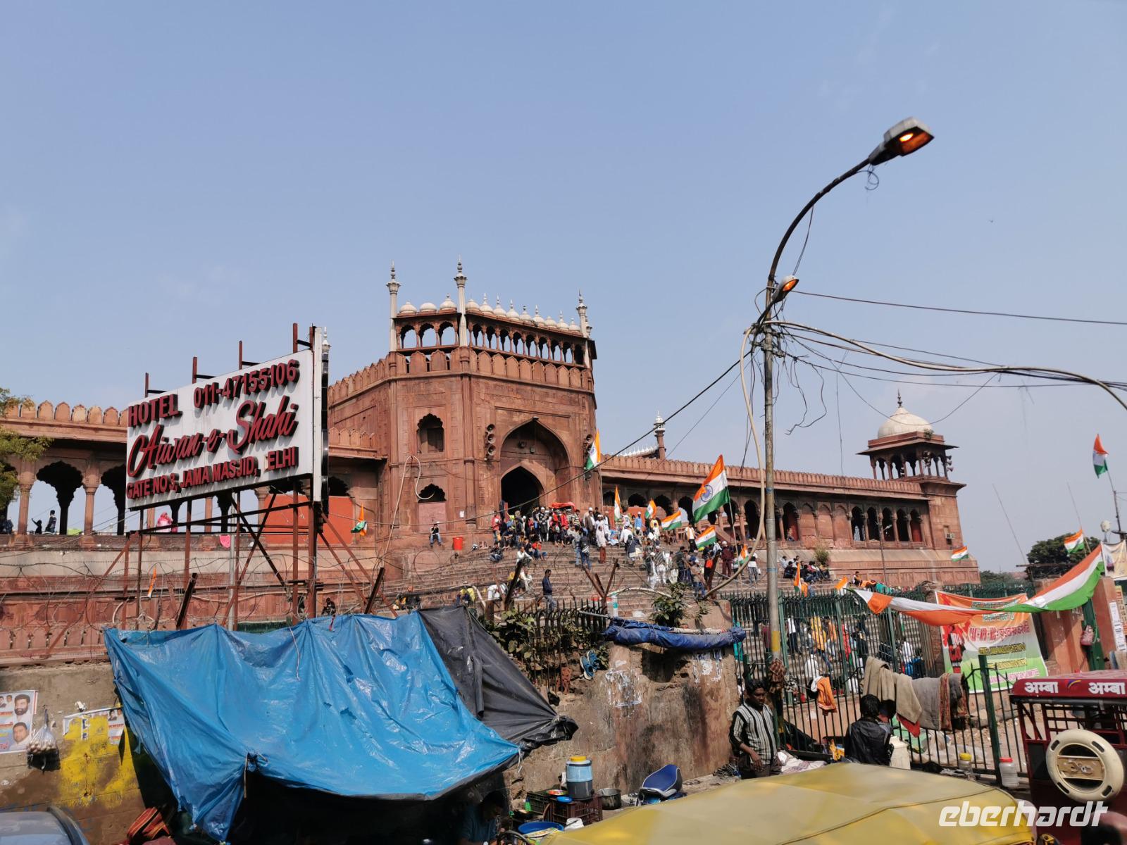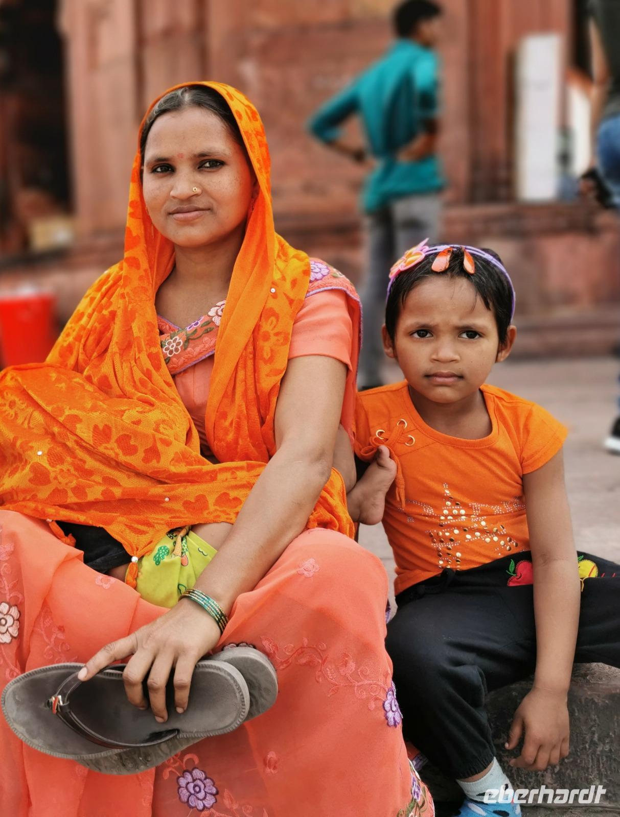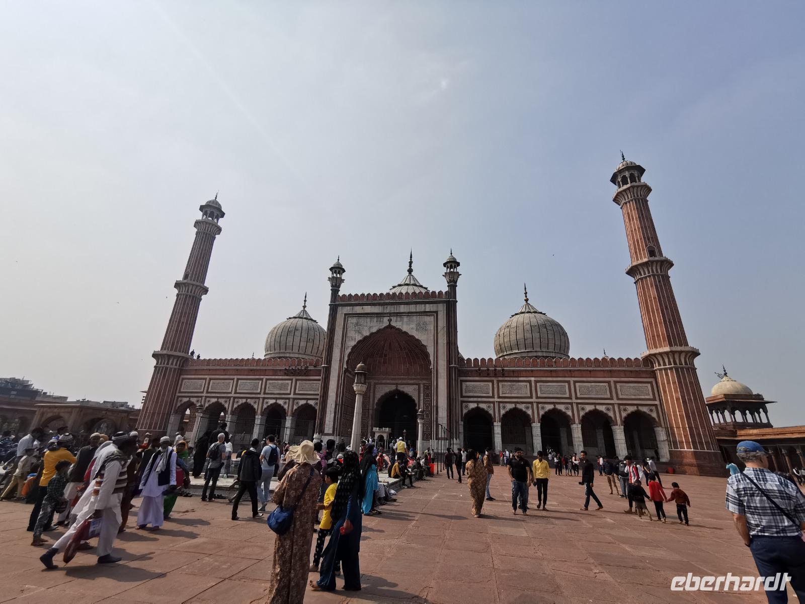 Beim anschließenden Besuch der Jama Masjid, der großen Moschee in Delhi, müssen sich die Damen der Gruppe verhüllen, dann dürfen wir hinein. Von allen Seiten strömen die Einheimischen zu uns und wir werden auf etliche Fotos gebannt. Wieder erkundigt man sich neugierig, wo wir herkommen. Diese Moschee in Alt-Delhi ist die größte in ganz Indien und wurde zwischen 1650 und 1658 von 5.000 Handwerkern errichtet. Der Auftraggeber war übrigens Shah Jahan, er ließ ebenfalls das wohl bekannteste Bauwerk ganz Indiens errichten - das Taj Mahal.