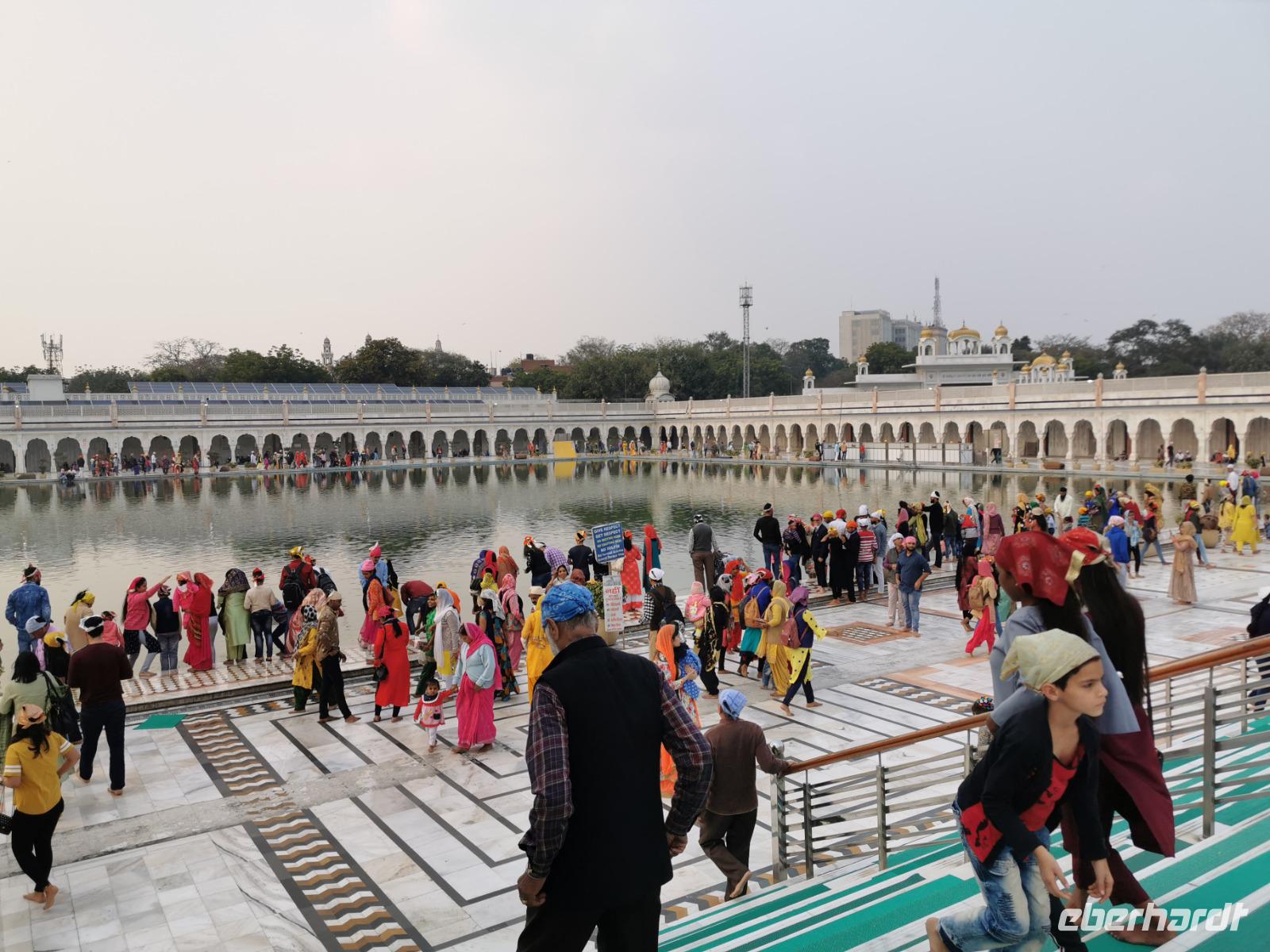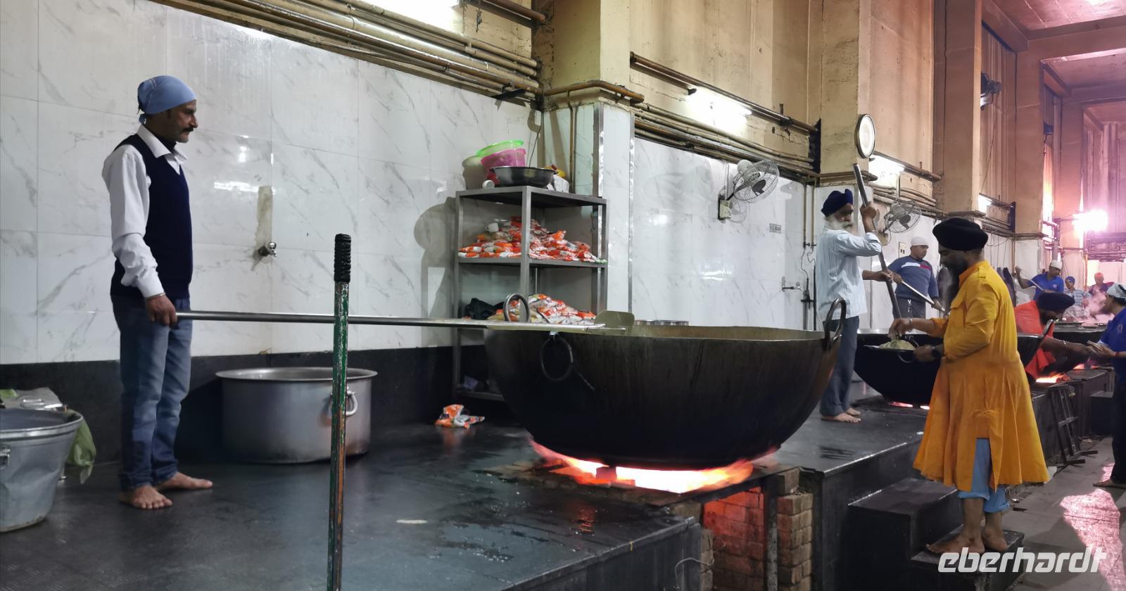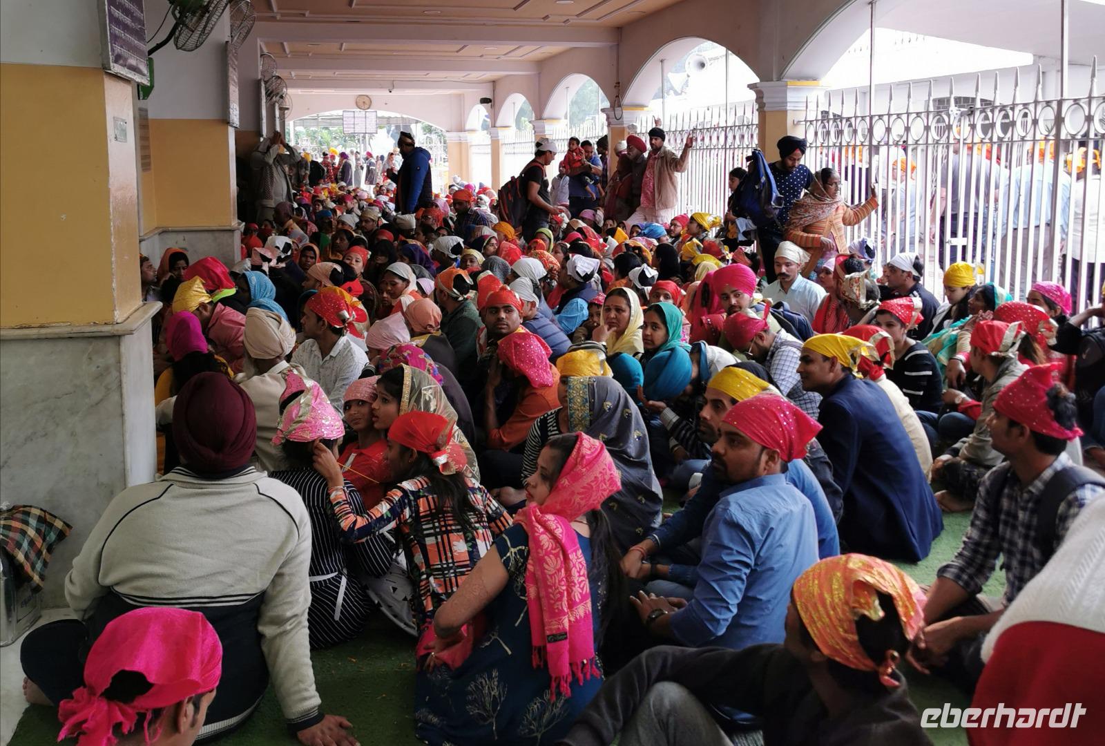 Wir kommen zur richtigen Zeit im Tempel an, am Sonntag essen alle Sikhs hier gemeinsam und wir dürfen zusehen, wie in riesigen Pfannen mit langen Metallstangen Essen für derart viele Gläubige zubereitet wird. Brot wird wie am Fließband gebacken und wir schauen gespannt den imposanten Erscheinungen mit ihren bunten Turbanen beim gemeinsamen Mahl zu. Und wieder werden wir überall freundlich empfangen, alle lächeln uns an und präsentieren uns ihre Kinder. Mit diesen schönen Eindrücken geht unser erster Tag auch schon zu Ende, morgen werden wir die Hauptstadt verlassen und nach Jaipur fahren ...