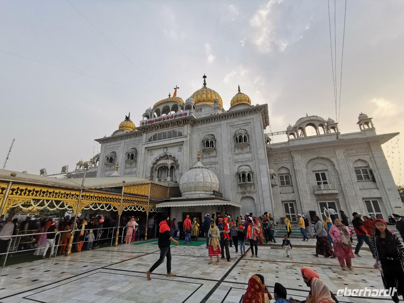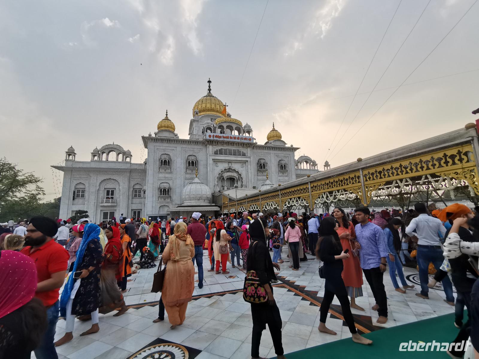 Unser letzter Programmpunkt heute ist der Besuch des Banglasageb Gurudwara Tempels. Dieser Tempel wird vor allem von der Religionsgemeinschaft der Sikh besucht. Diese monotheistische Religion wurde von Guru Nanak Dev im 15. Jahrhundert gegründet und ihre Anhänger leben vor allem im nordindischen Bundesstaat Punjab. Sikhs betonen die Einheit der Schöpfung und verehren einen Schöpfergott, der weder weiblich noch männlich ist. Sie lehnen auch das bei den Hindus im Alltag noch sehr präsente Kastensystem ab, welches Menschen von Geburt an einer bestimmten Standeshierarchie bzw. Berufsgruppe zuordnet.