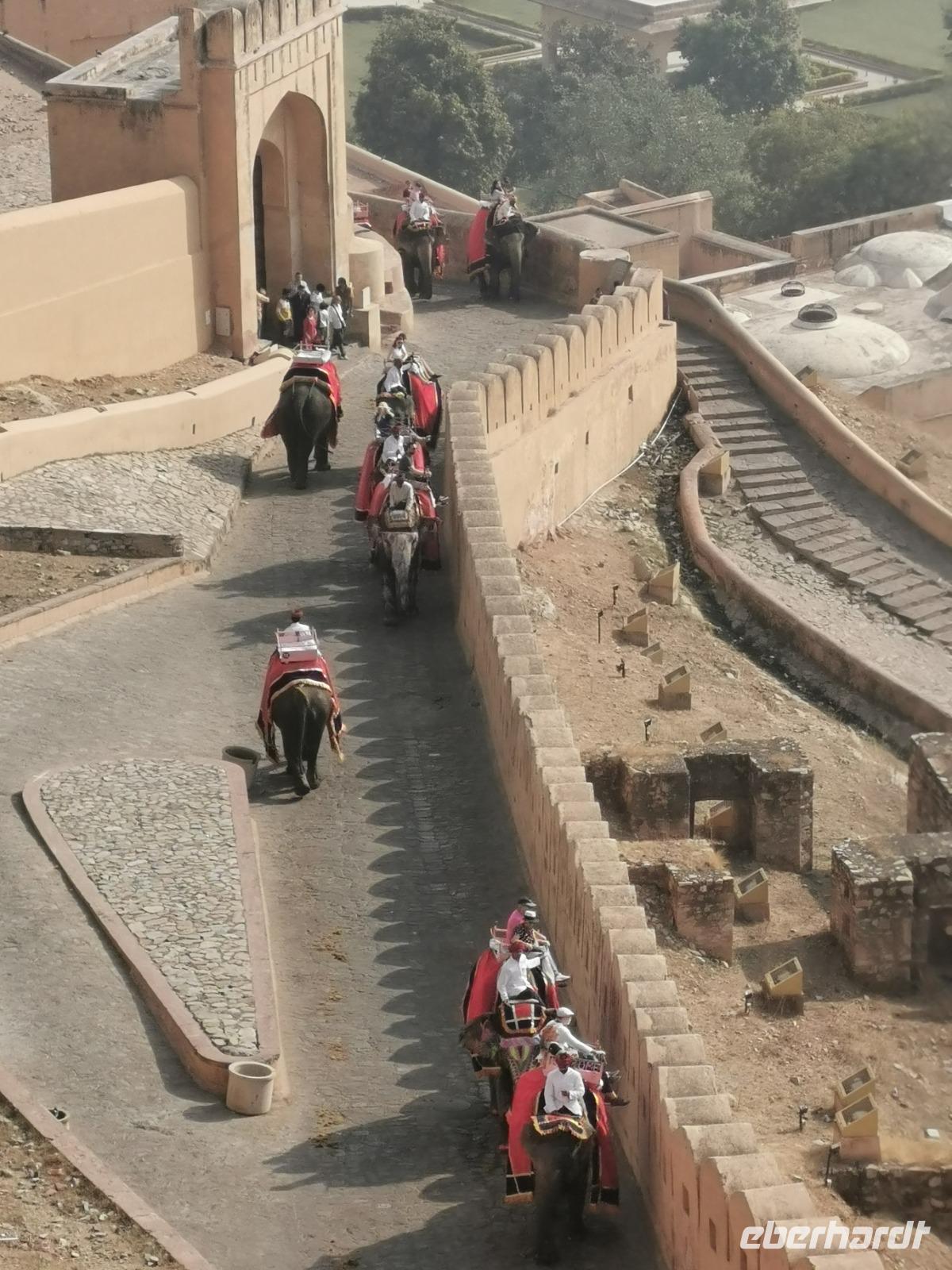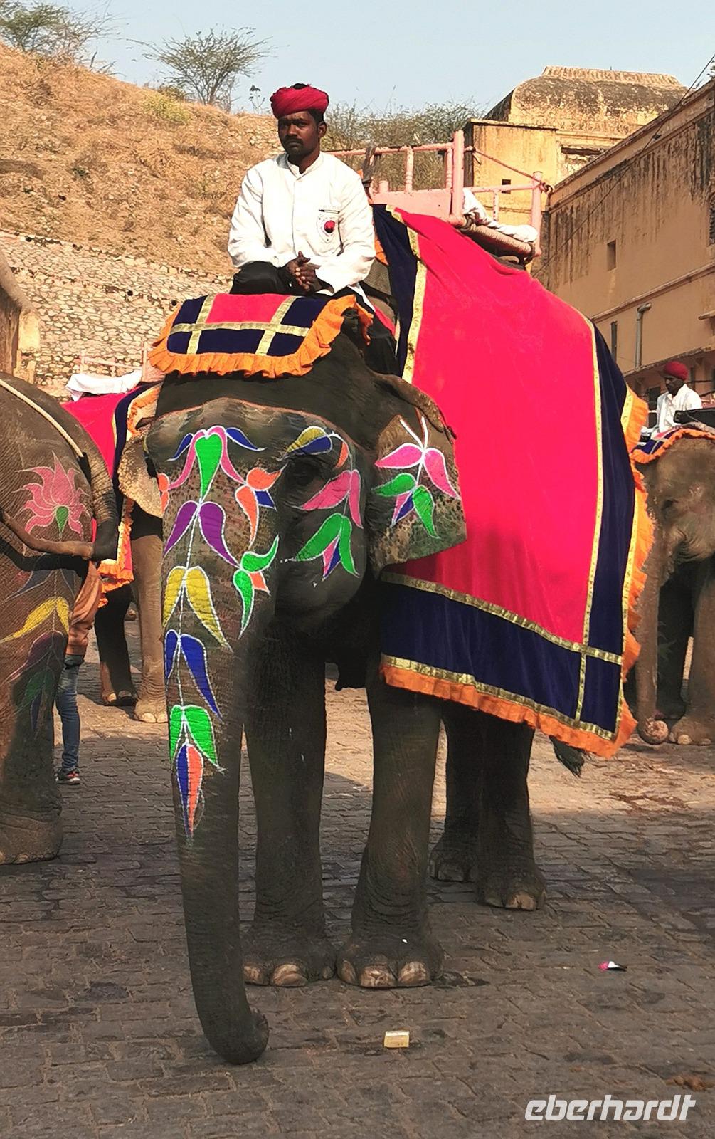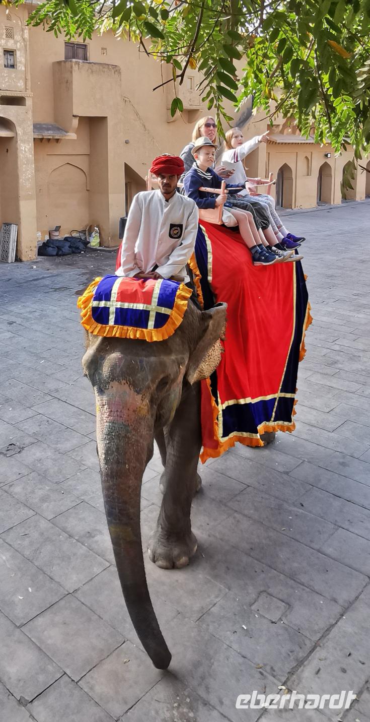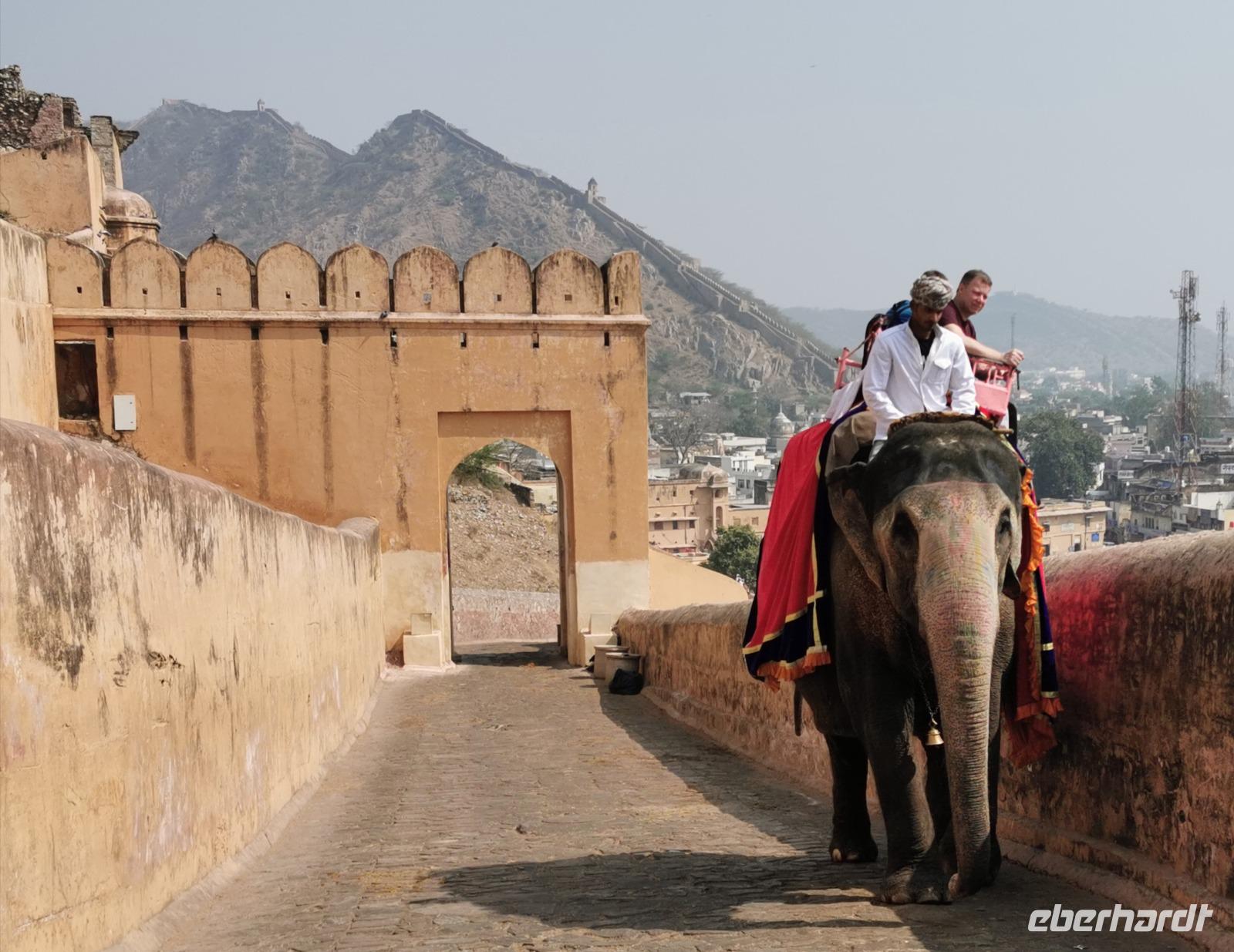 Ganz klassisch lassen wir uns auf dem Rücken eines Elefanten zum Fort hochtragen. Ein Erlebnis!