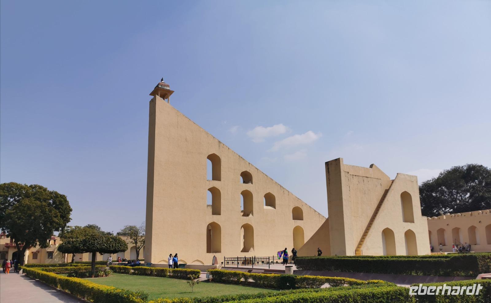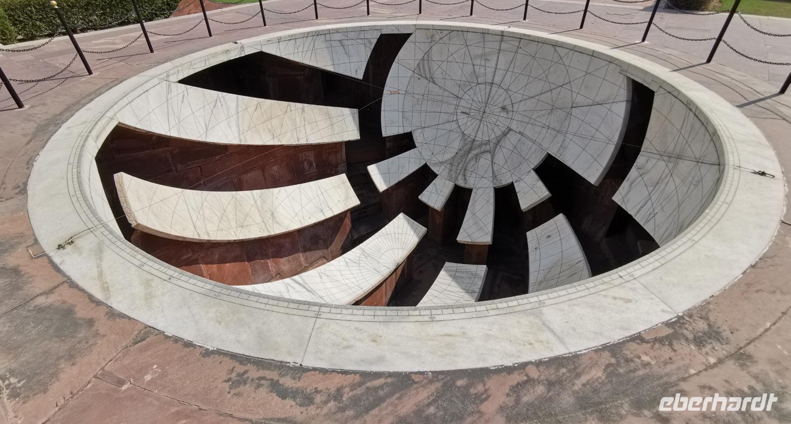 Im Anschluß laufen wir zum gleich gegenüber liegenden royalen Observatorium Jantar Mantar. Dieser Komplex gehört zu fünf historischen Sternwarten, die alle von Maharadja Jai Singh II. in den Jahren 1724 bis 1734 in Delhi, Ujjain, Mathura, Varanasi und Jaipur errichtet wurden. Bei all diesen Observatorien wurden die Skalen immer weiter vergrößert, um immer präzisere Winkelablesungen zu ermöglichen. Auch heute noch ist diese Anlage voll funktionsfähig. Man kann an verschiedenen Sonnenuhren exakt die Zeit ablesen, die Sonnen- und Planetenstände bestimmen und die Positionen der Tierkreiszeichen genauestens bestimmen.