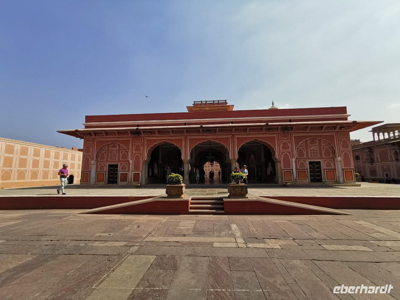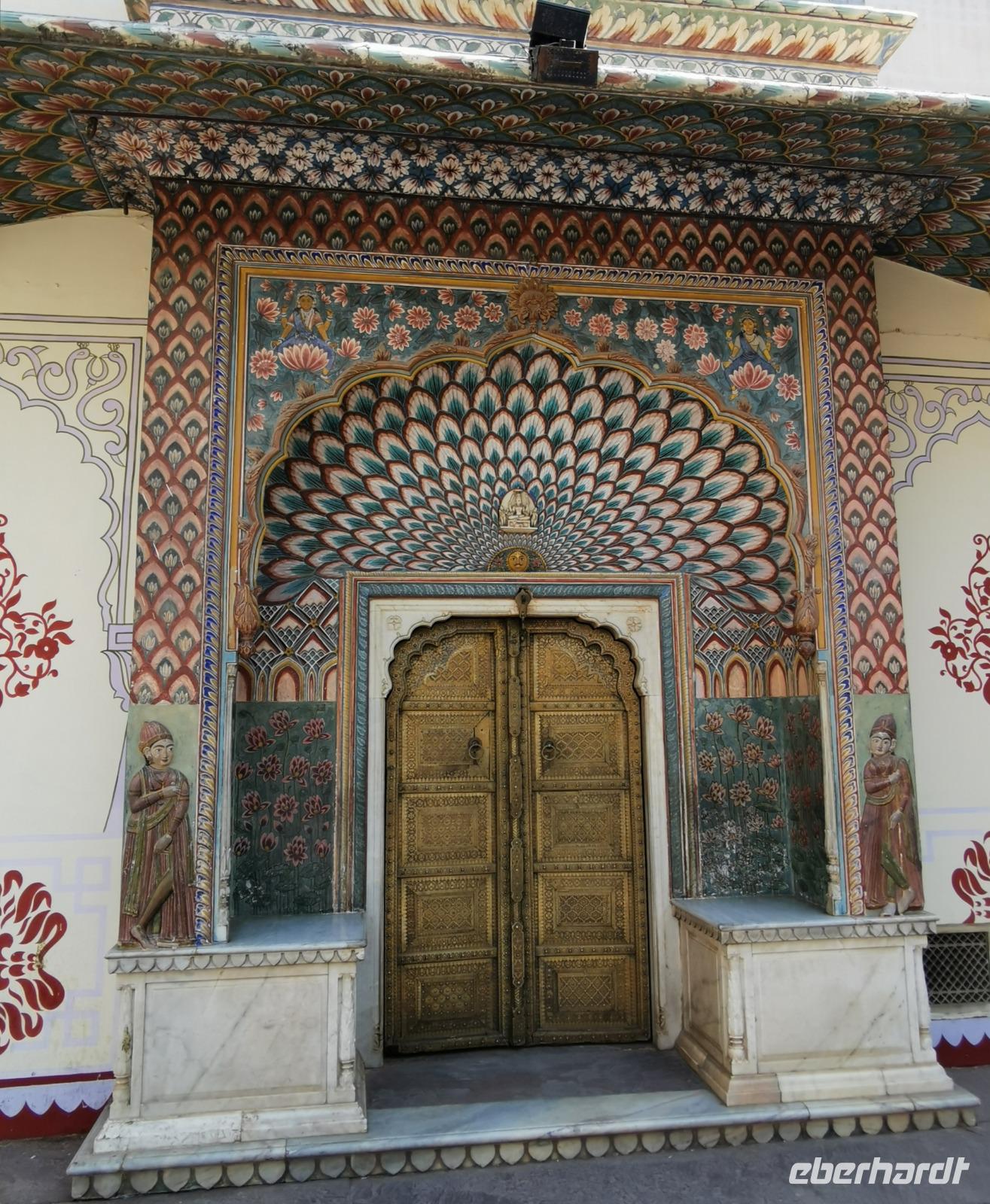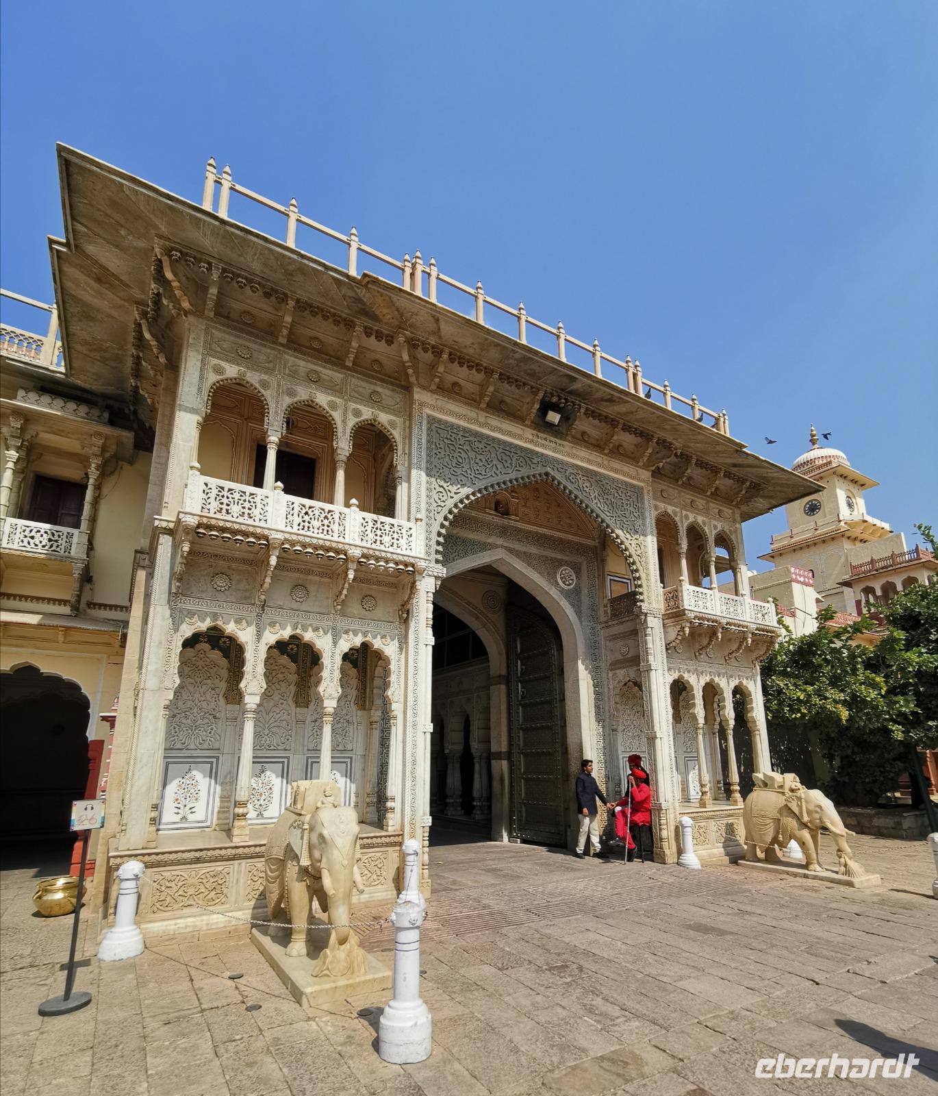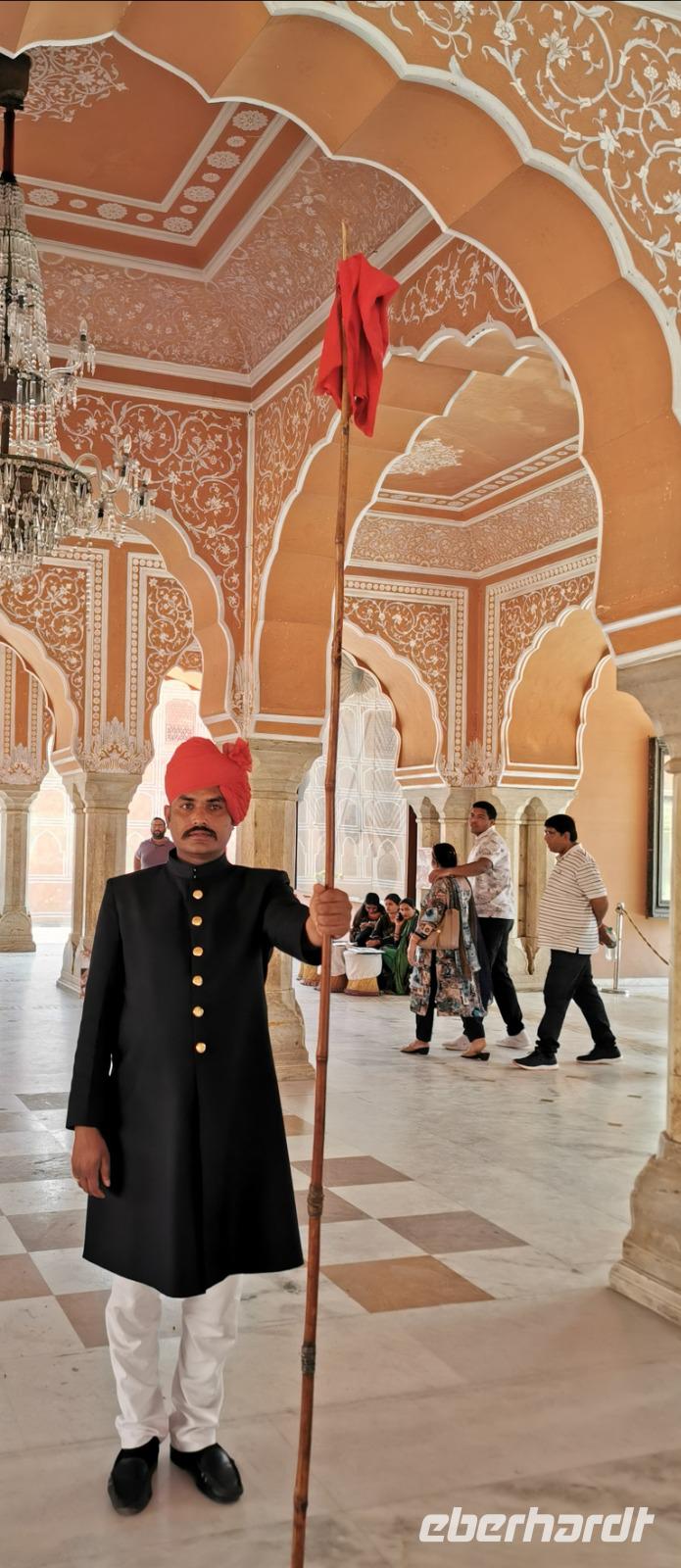 Danach besuchen wir den Stadtpalast mit seinen vielen Innenhöfen Gärten und Gebäuden. Die Außenmauern wurden von Maharaja Jai Singh II. 1890 begonnen, viele der Anbauten fügte man später hinzu, einige sogar erst in diesem Jahrhundert. In einem Teil dieses Palastes lebt noch heute die Familie des Maharaja. Wir spazieren durch eine Sammlung von Kunstgegenständen, Teppichen, Emaillearbeiten und Waffen, teilweise mit Stücken aus dem 15. Jahrhundert. In der Textilausstellung sehen wir riesige Kaftane, die uns vermuten lassen, daß es Maharajas gegeben haben muß, die eine beachtliche Leibesfülle gehabt haben müssen.