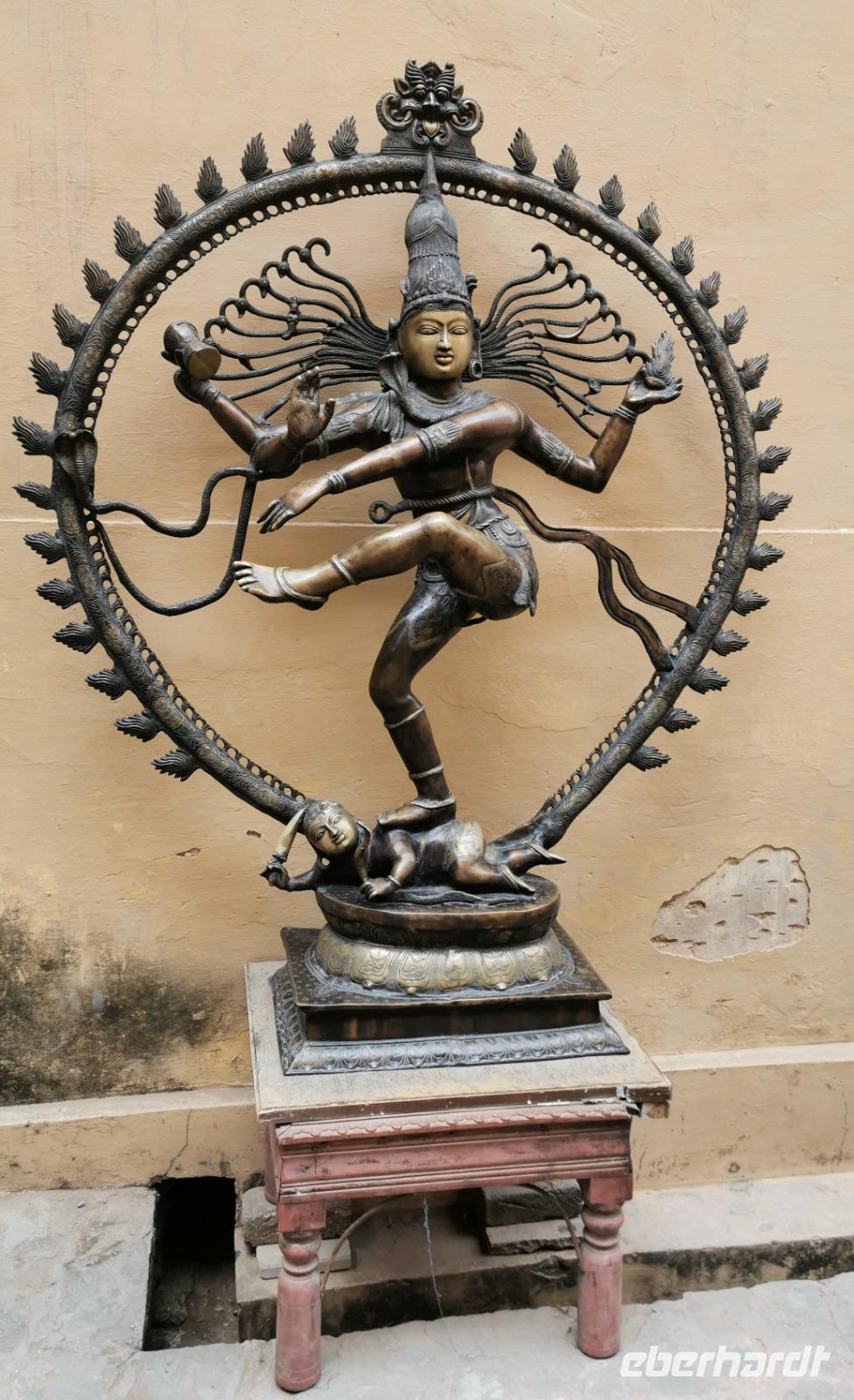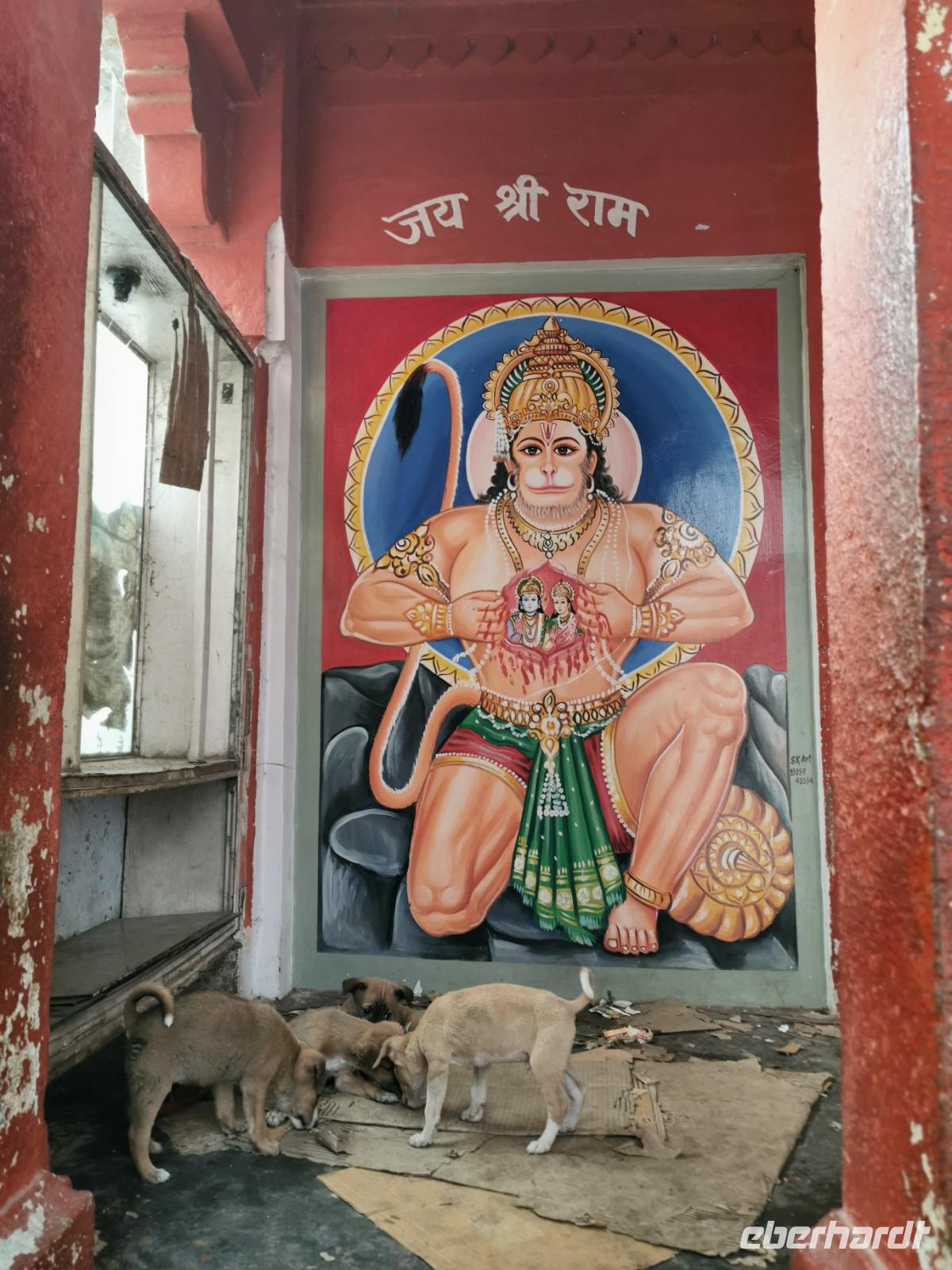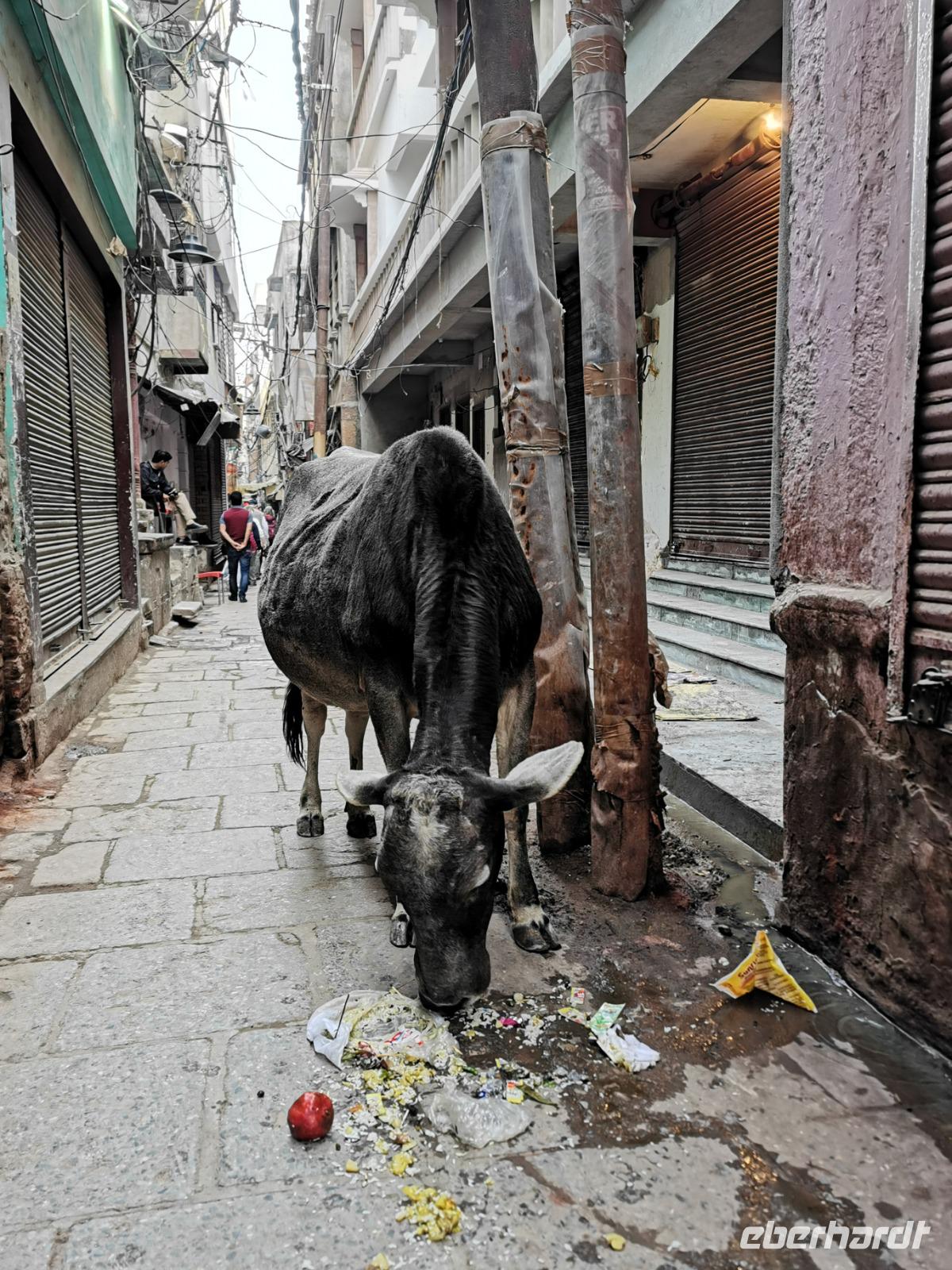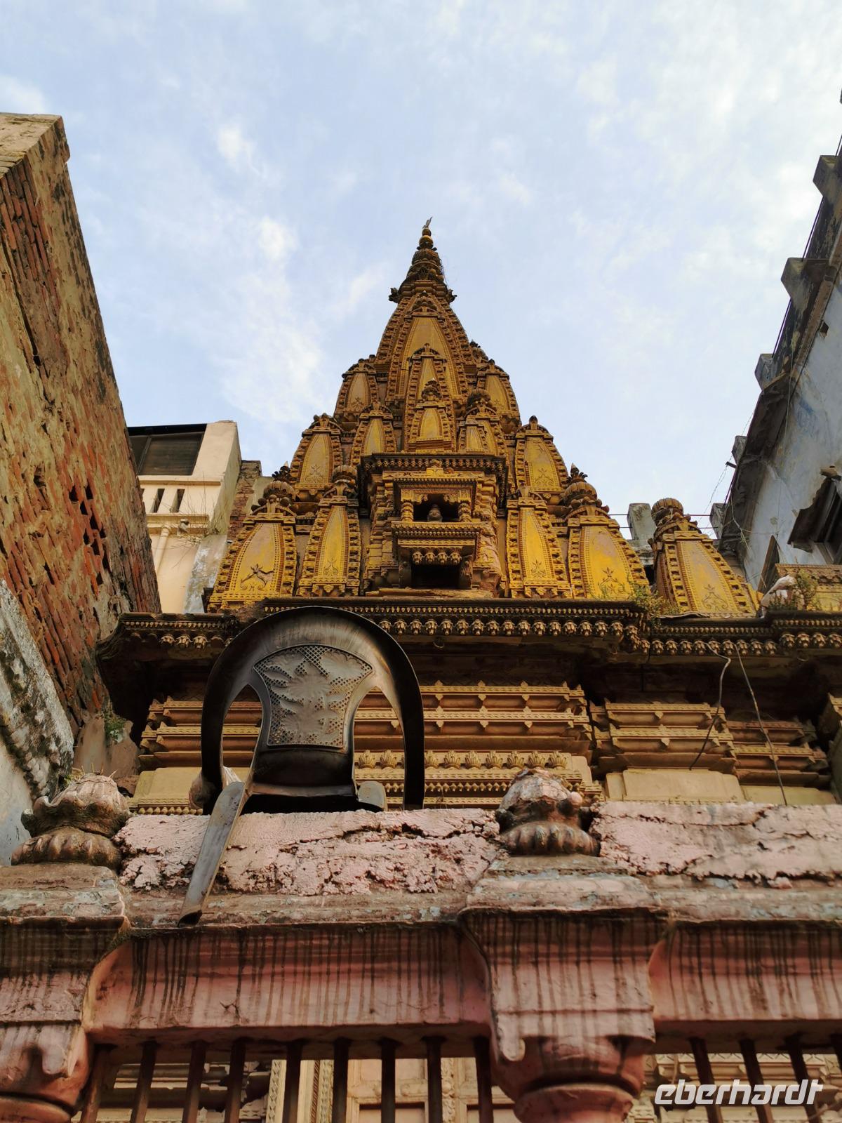 Nach einer Stunde Fahrt steigen wir am Verbrennungsghat aus und laufen noch ein Stück durch die engen verwinkelten Gassen der Altstadt. Etliche historische Tempel ragen auf aus einem Meer an Häusern, verworrene Stromleitungen und Strommasten sind neben jedes Haus gequetscht, dazwischen immer wieder Hunde, Kühe, Affen und unzählige kleine Straßenlädchen. Eine wirklich fremde Welt für unsere europäischen Augen.
