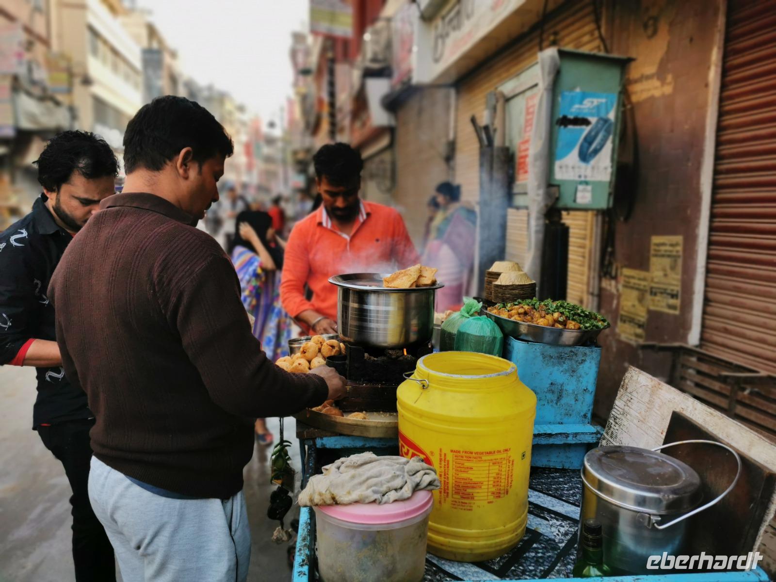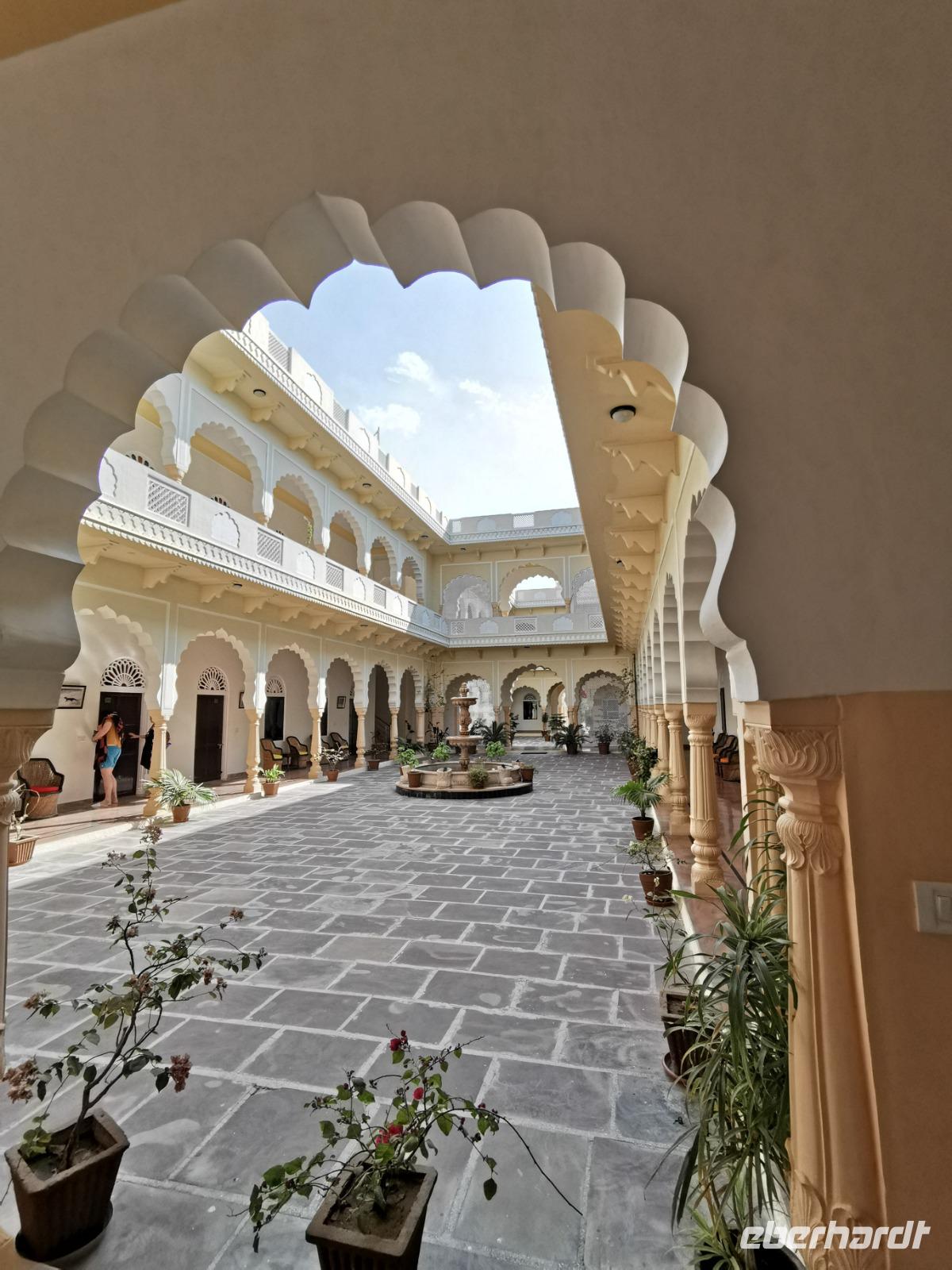 Zum Mittagessen pausieren wir in einem grünen Innenhof und kosten wieder von den indischen Köstlichkeiten: Paneer-Spieße (gegrillter indischer Weichkäse) und mit Paneer gefüllte Pakhoras (frittierte Bällchen mit Gemüse und Weichkäse). Im Anschluß fahren wir in unser Ramada Hotel und lassen den Nachmittag auf der Dachterrasse am Pool mit tollem Blick über die Stadt ausklingen.