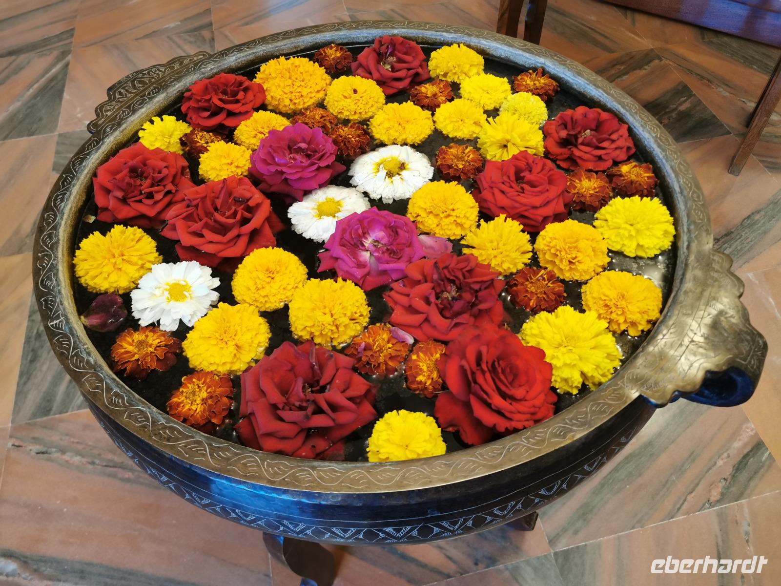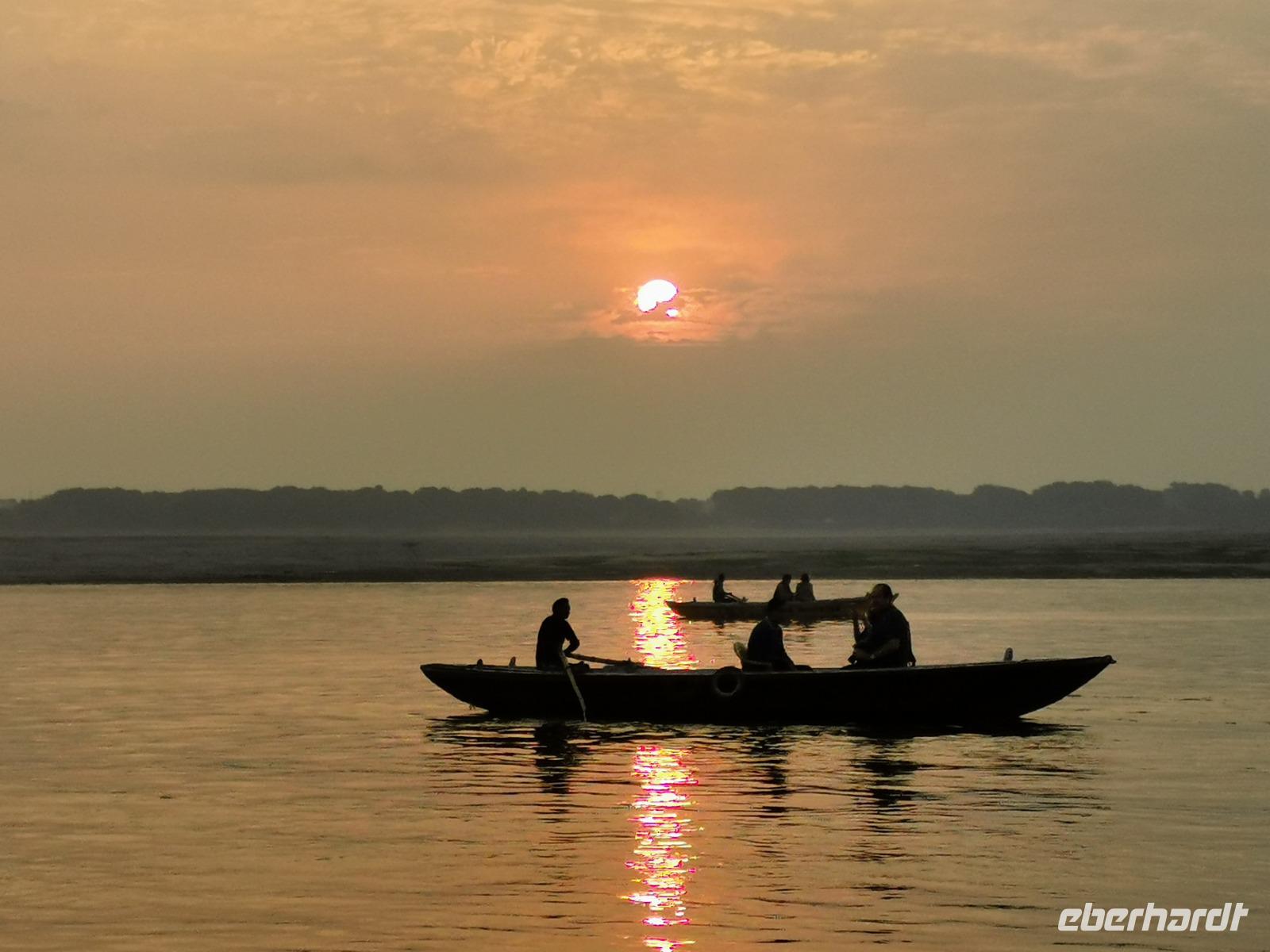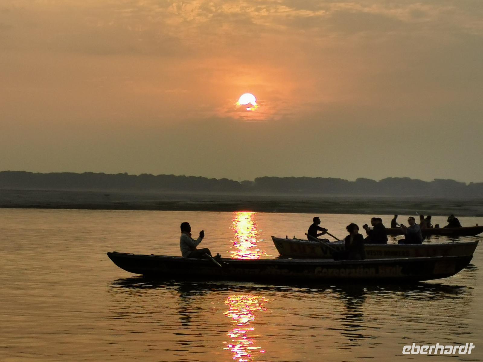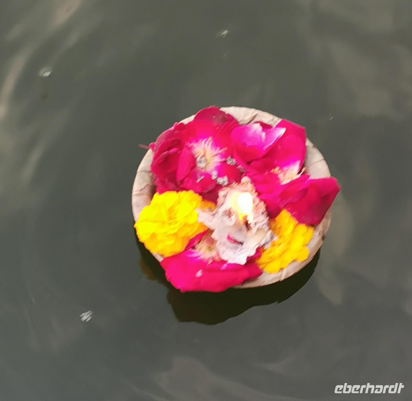 Alle Gäste sind wie gebannt, die Sonne geht über dem Wasser glutrot auf und wir machen es wie die Hindus. Wir lassen die kleinen Blumenkränze mit Minikerzen auf den Ganges als Opfergaben auf das Wasser hinaus und wünschen uns etwas. Vielen Dank an Anika für die Gabe, dieser Moment wird uns lange im Gedächtnis bleiben.