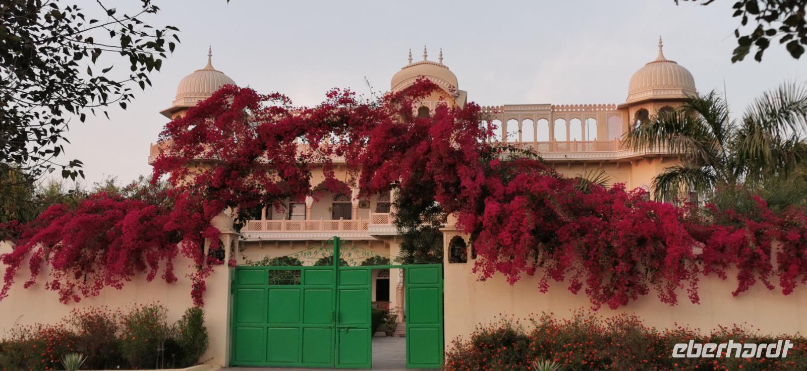 Wenig später erreichen wir das Gebiet um den Ranthambhore Nationalpark in Rajasthan und werden mit Mittagessen im wunderschönen Haveli Heritage Hotel empfangen. Nach dem Essen entdecken wir in der üppig grünen und schön bepflanzten Anlage den Pool mit den bequemen Liegen. Ganz schnell haben wir uns da eine gemütliche Nachmittagsecke eingerichtet und relaxen bei 26 Grad Außentemperatur. Aus Deutschland empfangen wir Nachrichten: es habe geschneit, heißt es darin. Wir wollen ganz und gar nicht tauschen im Moment. Ungewöhnlich für uns nach dem ganzen Großstadtlärm der letzten Tage sind die Stille und das Vogelgezwitscher. So neigt sich ein erholsamer Nachmittag dem Ende zu.