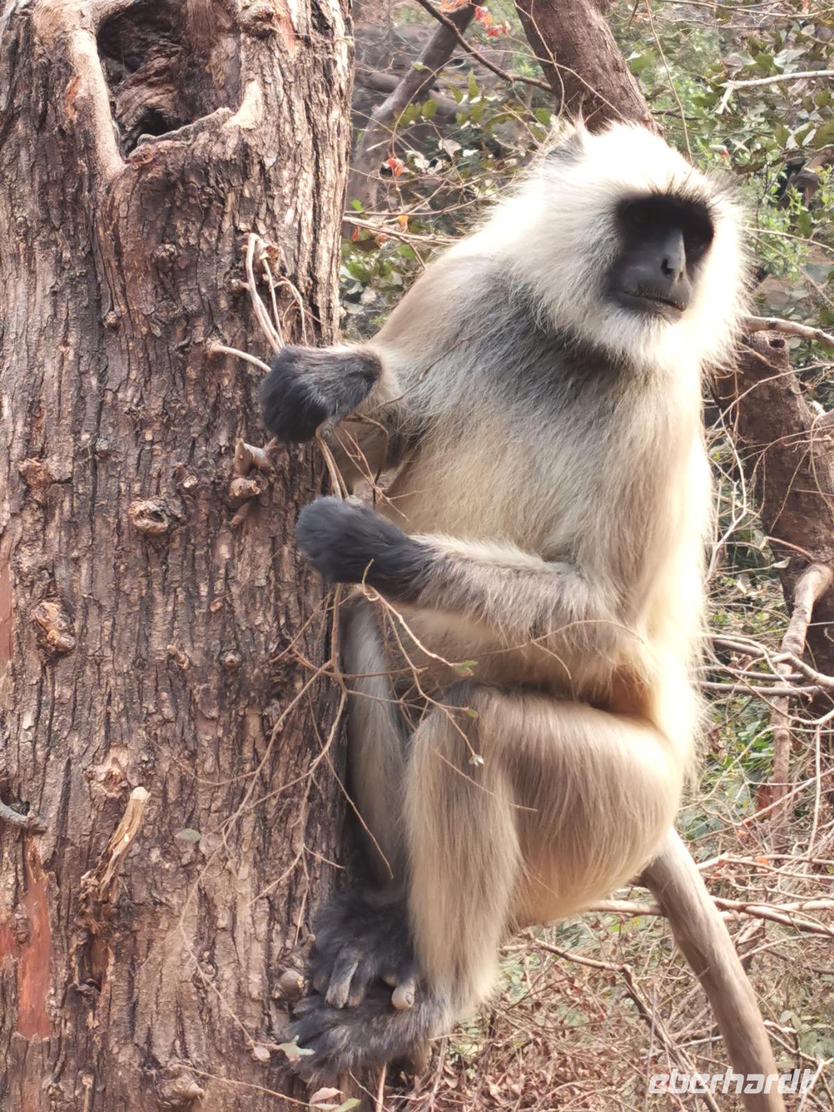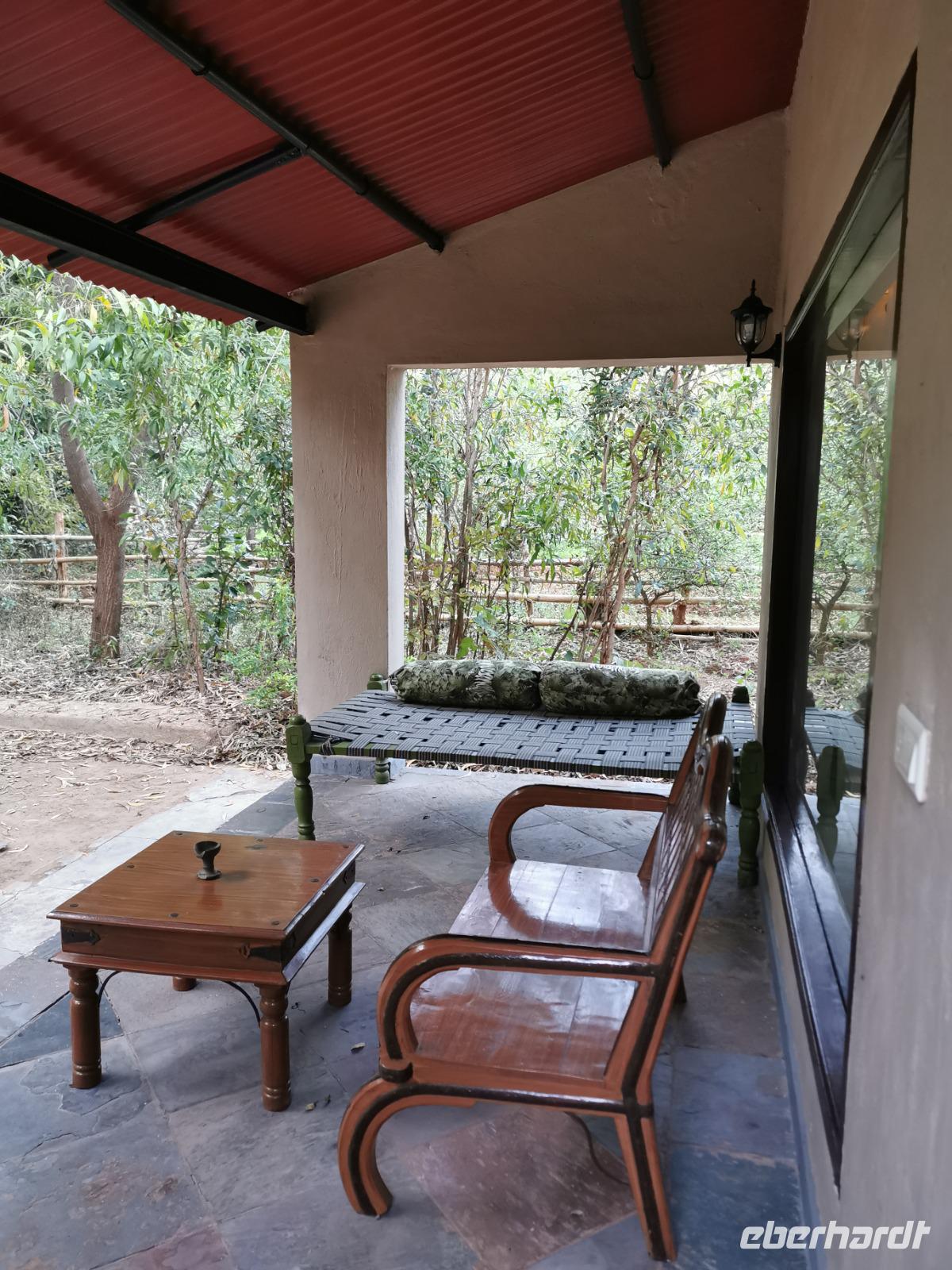 Am frühen Abend erreichen wir unsere Lodge im Bandhavgarh Nationalpark und finden uns in einer Umgebung wieder, die mitten im südlichen Afrika sein könnte. Üppige Vegetation, Affen, Bananenstauden, Papayabäumchen und einzeln stehende Lodgehütten. Im Garten der Unterkunft blühen Sonnenblumen, Grillen zirpen und Vögel tirilieren. Die Affen hängen in den Bäumen an der Rezeption und scheinen uns begrüßen zu wollen. Wir fühlen uns auf Anhieb wohl, trinken erstmal einen Kaffee und wenig später gibt es Abendessen in Dschungelszenerie. Am Lagerfeuer schauen wir uns eine Dokumentation über den Nationalpark an und unsere Spannung auf Tigerbeobachtungen steigt und steigt.