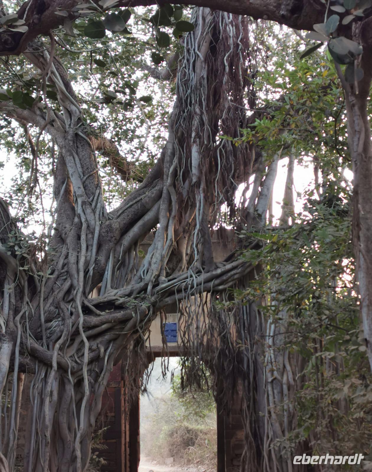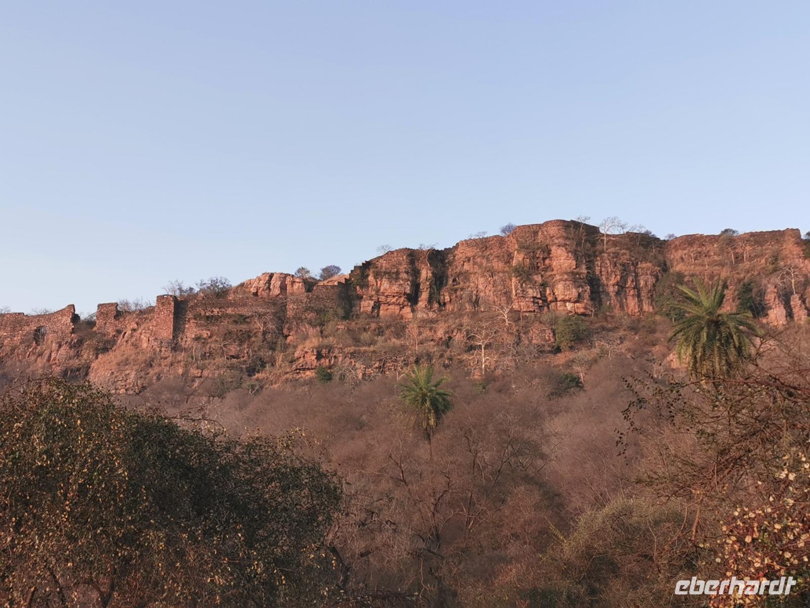 Die Berge der Aravallikette erheben sich rötlich vor dem Horizont. Wir erblicken trockene Felsengebiete, einige Seen und kleine Wasserläufe, die von Wäldern gesäumt werden. Exotisch gewundene Bäume ziehen unsere Blicke auf sich. Mitten im Park trohnt auf einem Felsen hoch oben die Festung Ranthambhore.