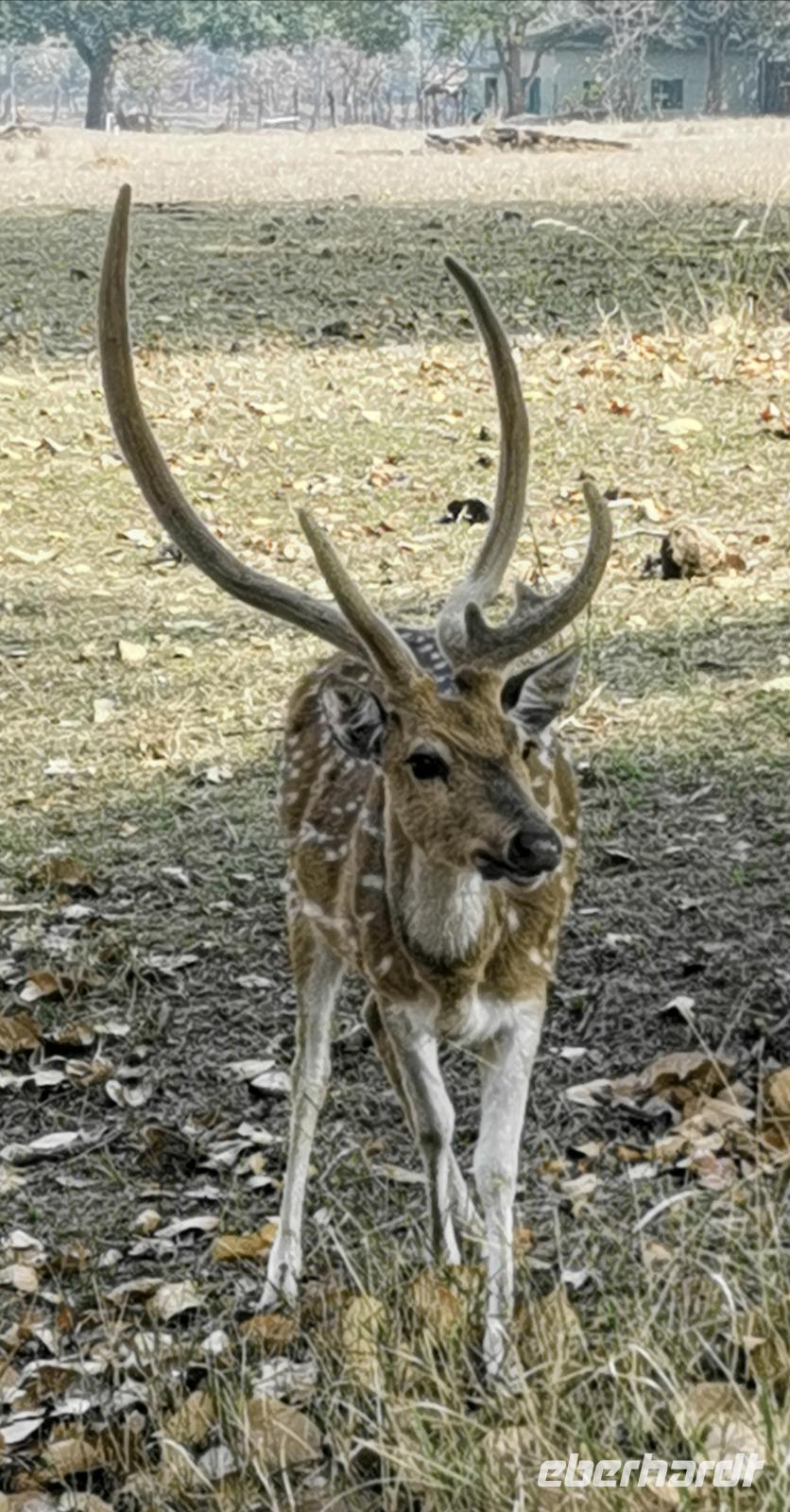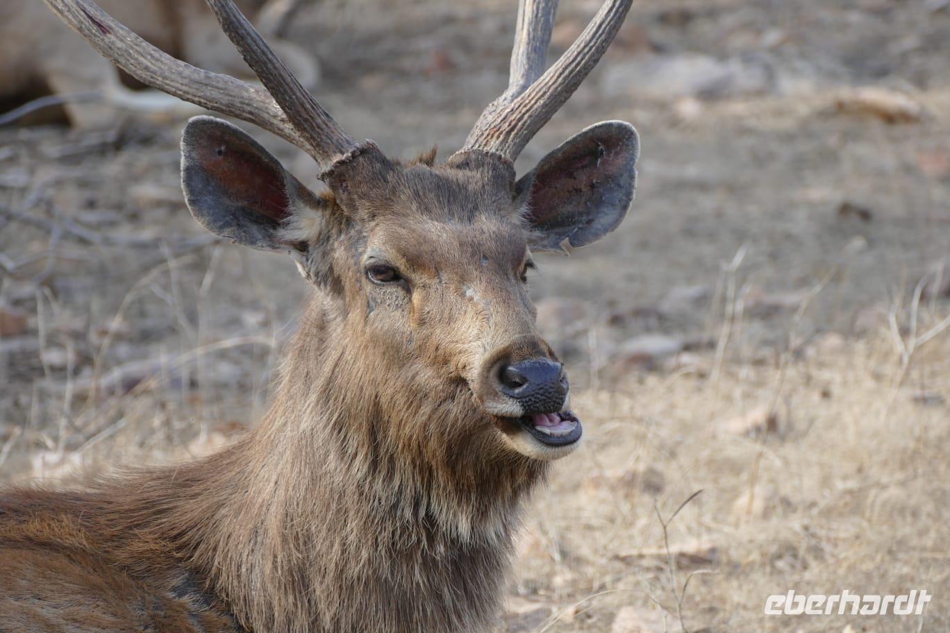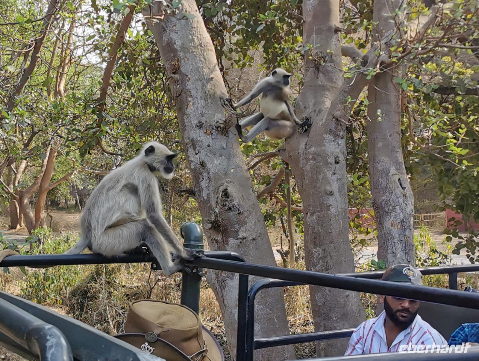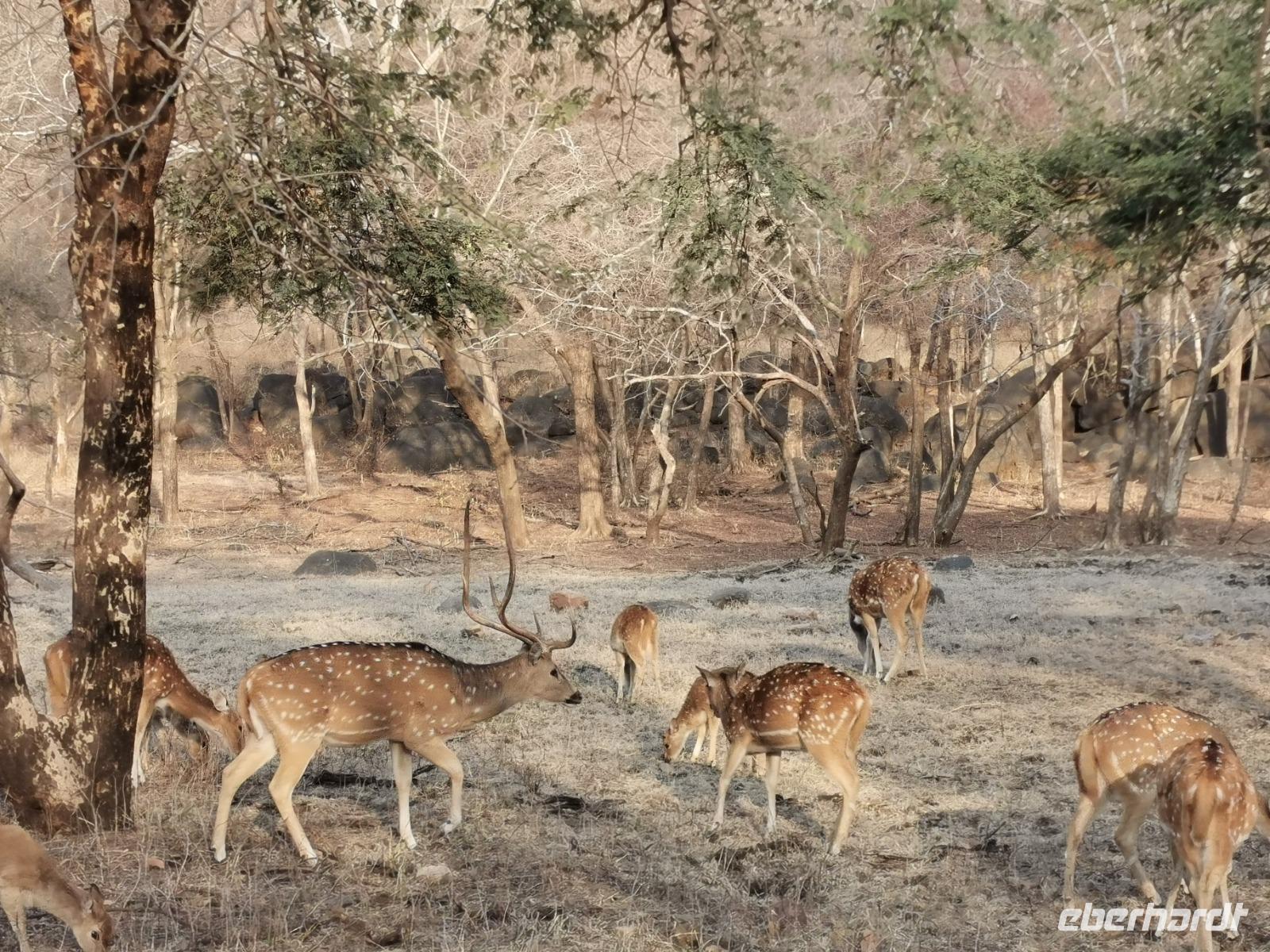 Der Eingang sieht aus, als ob man in die Dschungelbuchkulisse aus Kiplings Roman fahren würde und gleich nach der Einfahrt streifen Pfauen durchs Gebüsch, das Nationaltier der Inder. Affen hängen so nah neben dem Jeep, daß wir Respekt haben. Wenig später sehen wir die ersten Axishirsche, die uns eher an Rehe erinnern, nur daß sie im Gegensatz zu diesen weiße Punkte haben. Auch die großen Sambarhirsche lassen nicht lange auf sich warten. Diese Tiere können die stattliche Schulterhöhe von 1,60 Meter erreichen. Die Männchen dieser Hirsche stoßen mehrmals Warnrufe vor Tigern aus und wir werden unruhig.
