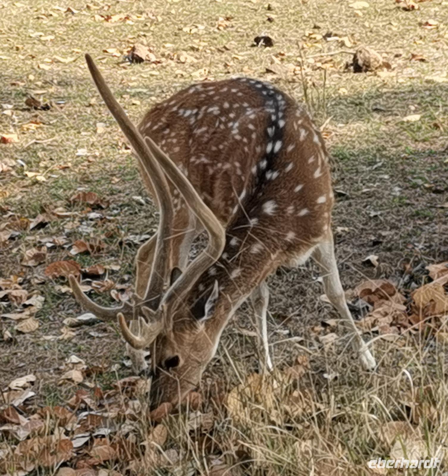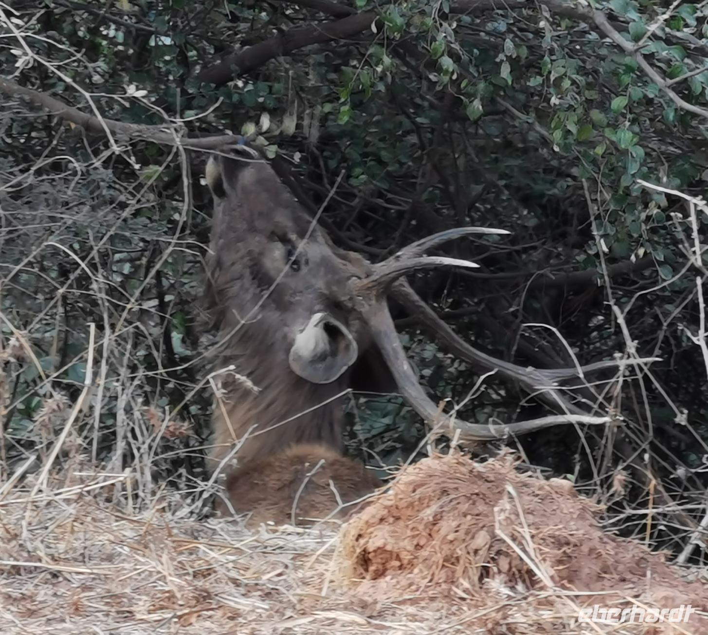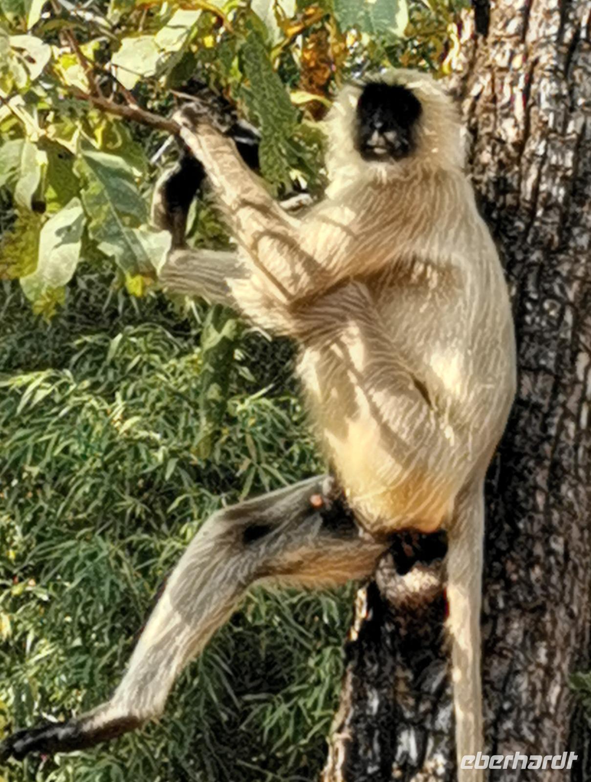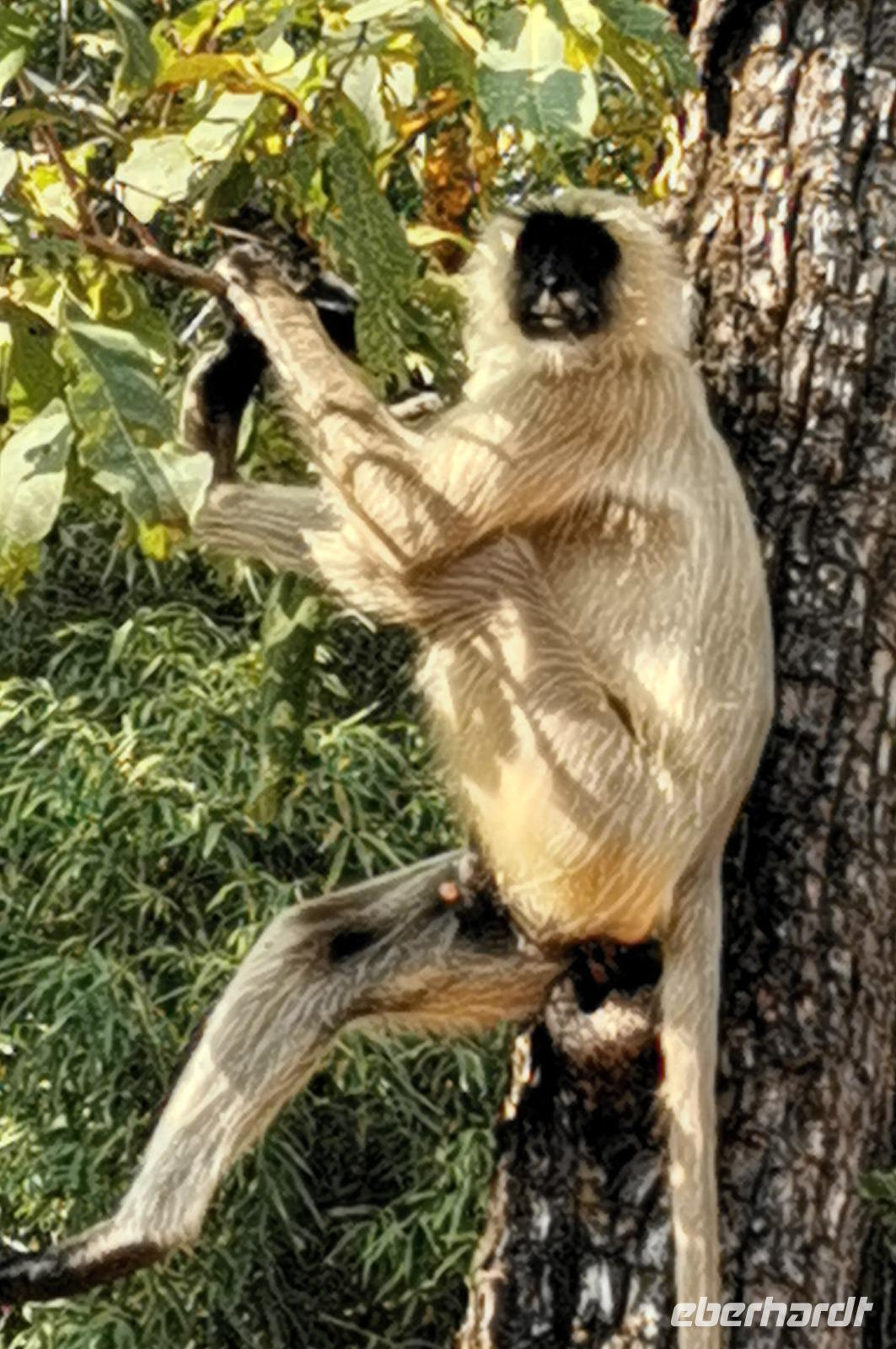 Der Eingang sieht aus, als ob man in die Dschungelbuchkulisse aus Kiplings Roman fahren würde und gleich nach der Einfahrt streifen Pfauen durchs Gebüsch, das Nationaltier der Inder. Affen hängen so nah neben dem Jeep, daß wir Respekt haben. Wenig später sehen wir die ersten Axishirsche, die uns eher an Rehe erinnern, nur daß sie im Gegensatz zu diesen weiße Punkte haben. Auch die großen Sambarhirsche lassen nicht lange auf sich warten. Diese Tiere können die stattliche Schulterhöhe von 1,60 Meter erreichen. Die Männchen dieser Hirsche stoßen mehrmals Warnrufe vor Tigern aus und wir werden unruhig.
