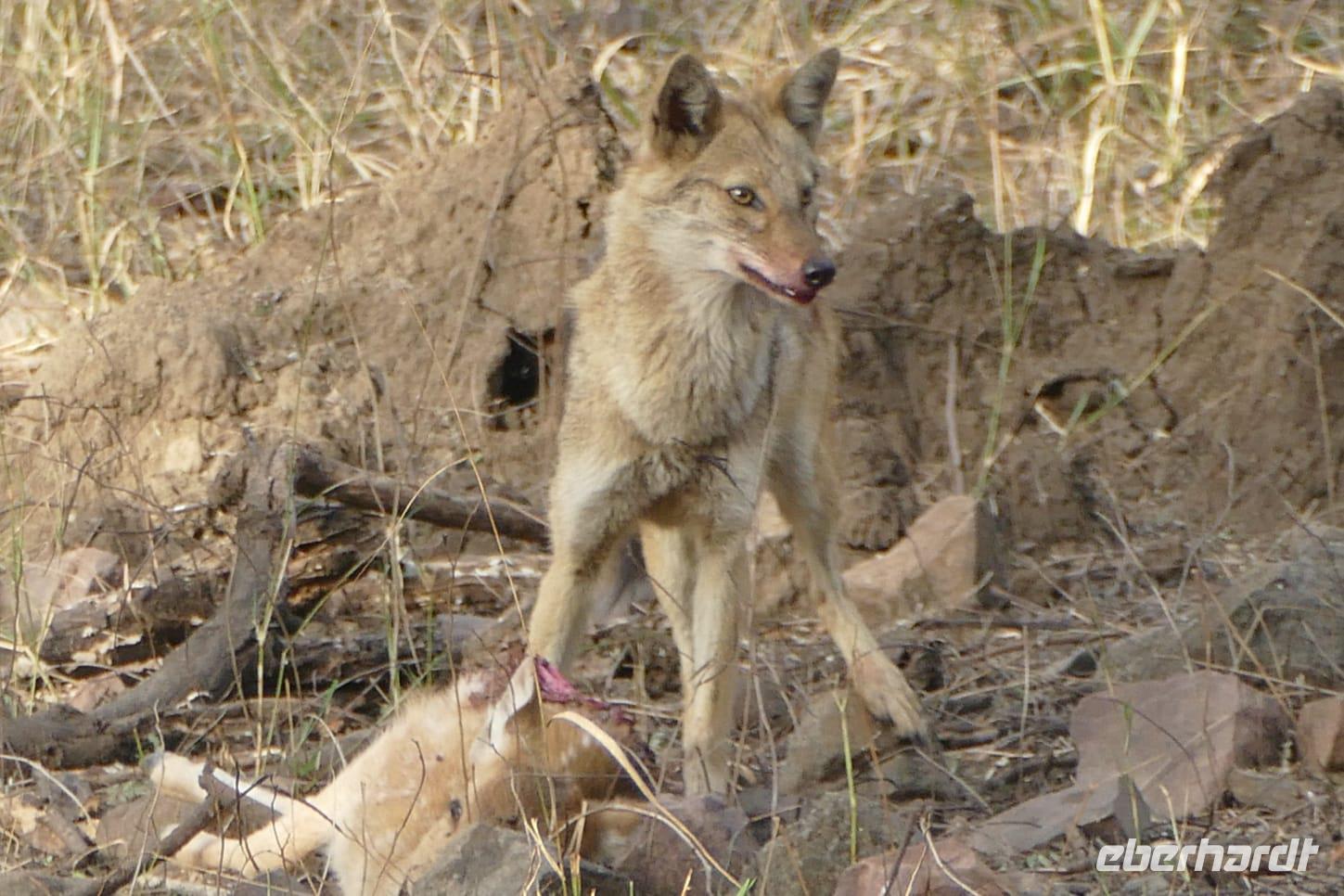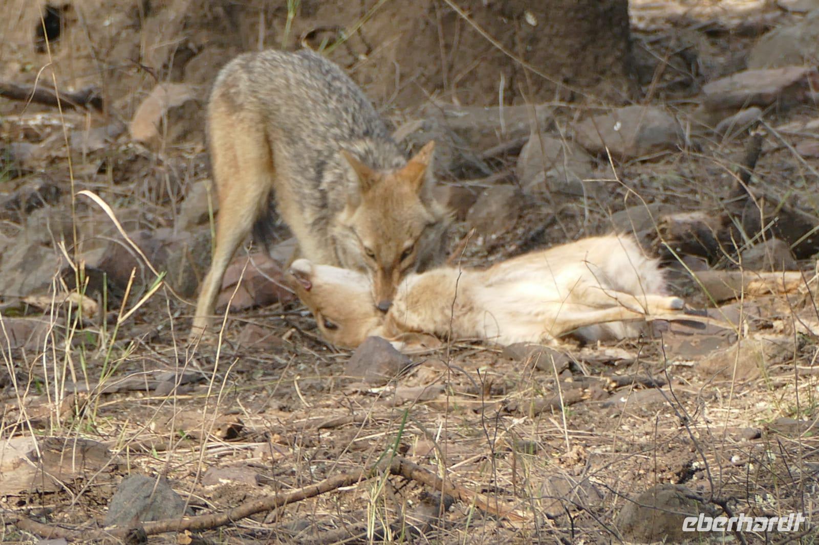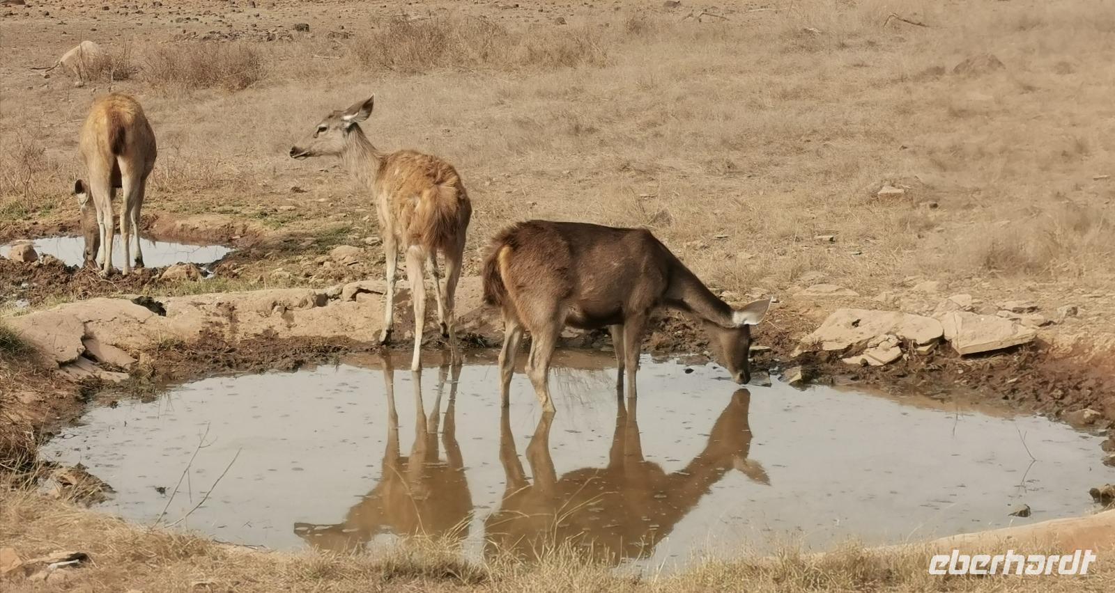 Während der Rückfahrt dürfen wir dann noch einen Schakal beim Fressen beobachten und die Sambarhirsche stehen mitten im See, ein fantastischer Anblick im Sonnenuntergang.